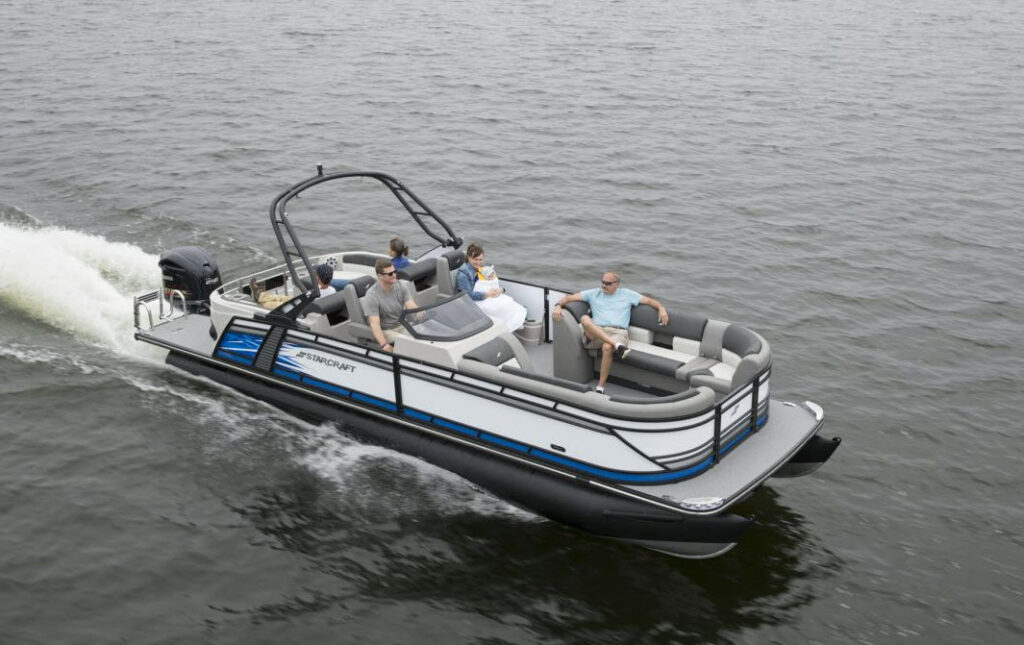 With its bold styling, Starcraft MX-25 R takes luxury and performance to all-new levels. A variety of floorplans with Starcraft’s exclusive Soft Touch upholstery let you choose the seating layout that best suits your needs, while enjoying the elevated consoles with standard individual windscreens or an available walk-through windshield. A flush-mount Simrad touchscreen display and new V3 gauges grace the elegant helm, while a roomy extended deck, bow docking lights, fold-up cleats, and handsome 10′ Bimini top all come standard.
