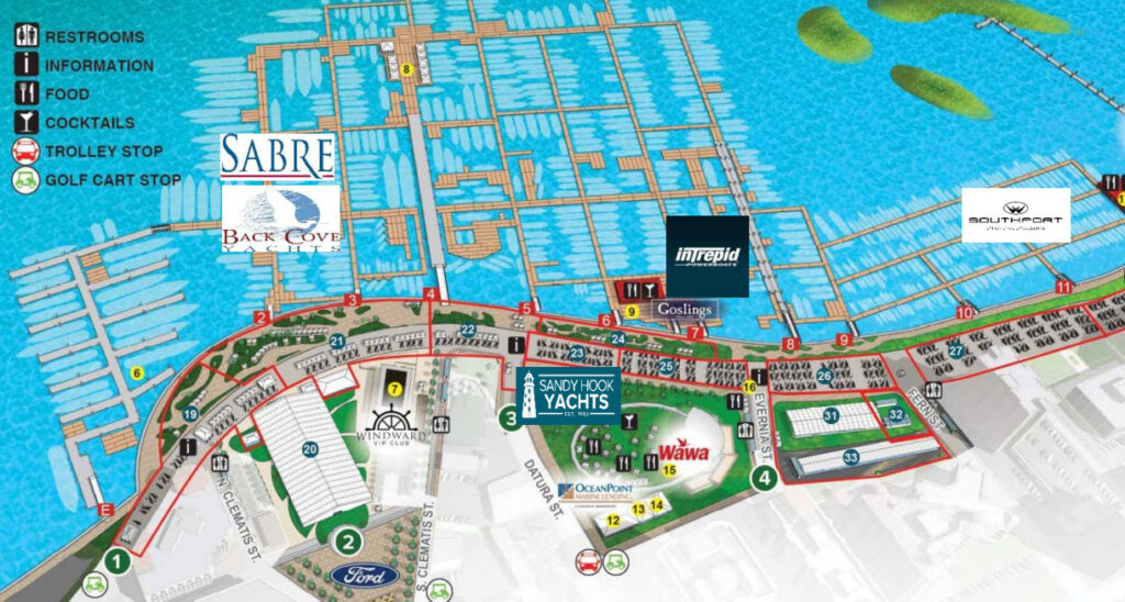 If you plan on coming to the show, contact us at Sales@SandyHookYachts.com to schedule a private showing or get a trade evaluation on your current vessel! Map below of all displays.