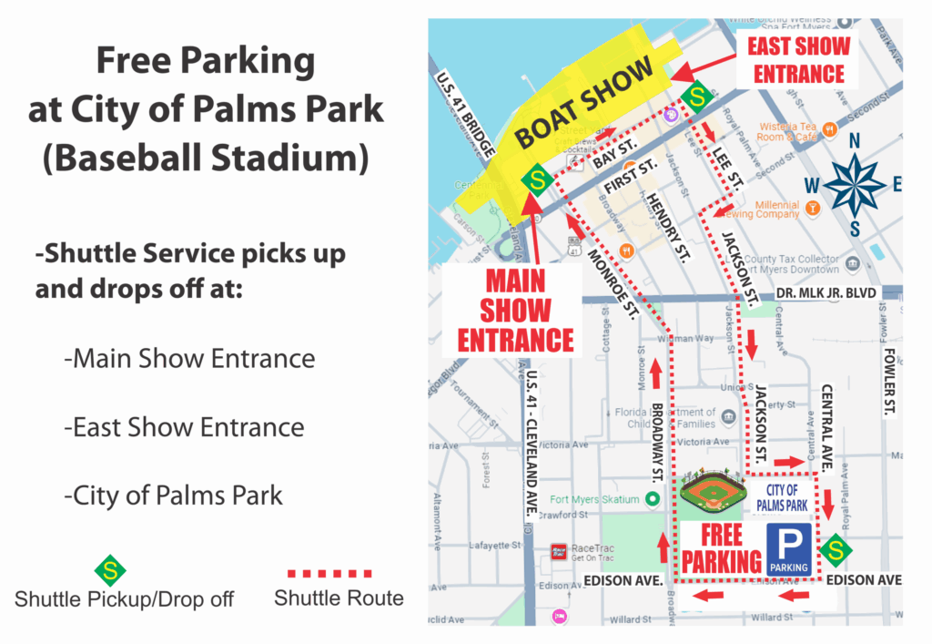 Free parking is available at City of Palms Park (2201 Edison Ave) with continuous free shuttle service to both show entrances from 8 AM – 7 PM (until 6 PM Sunday).