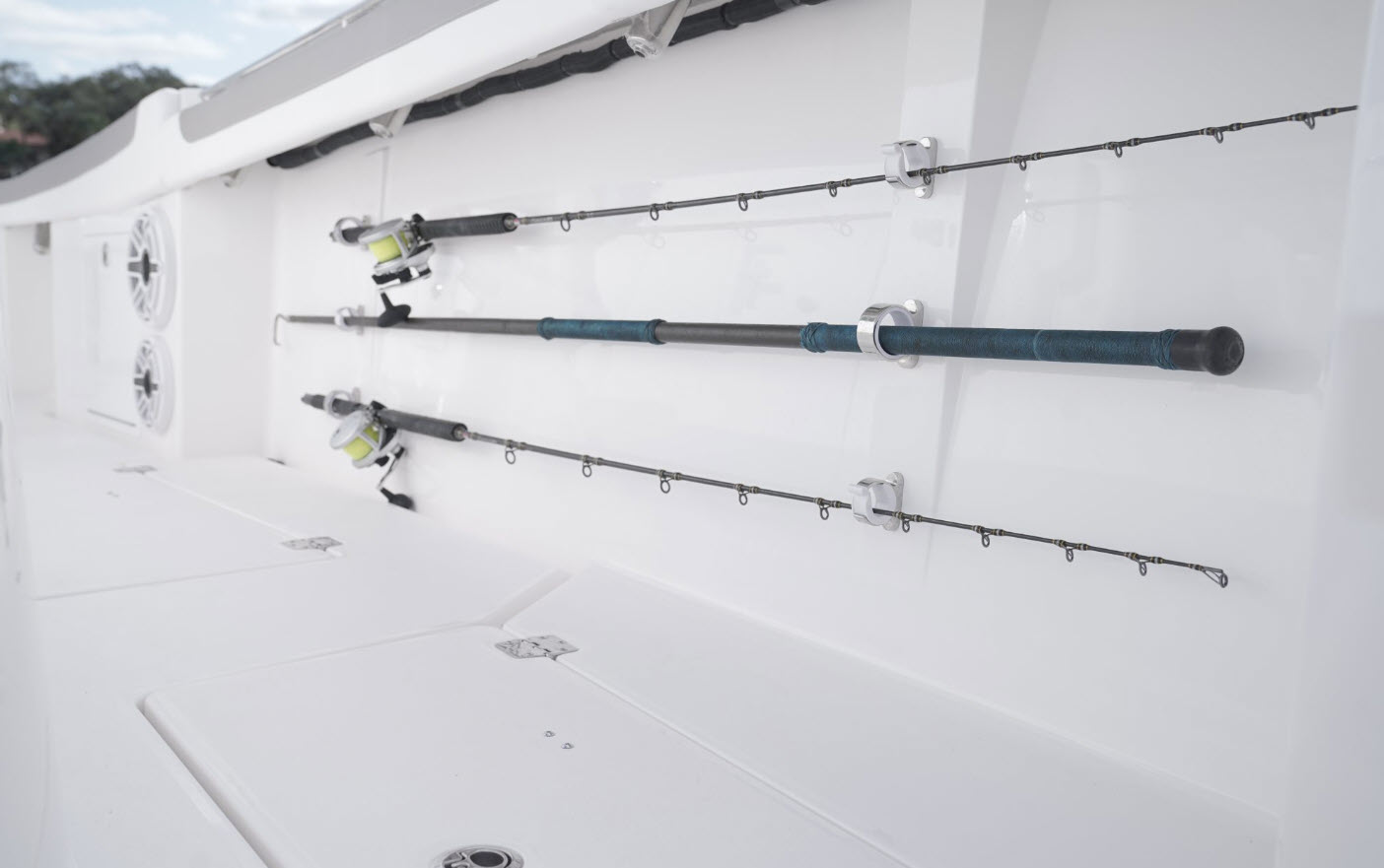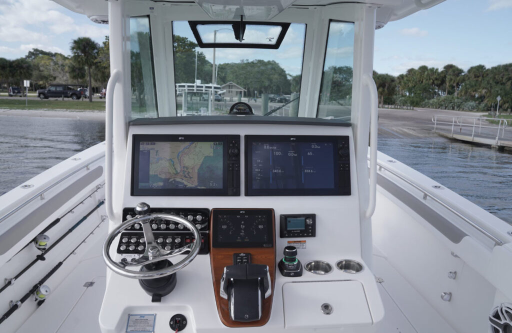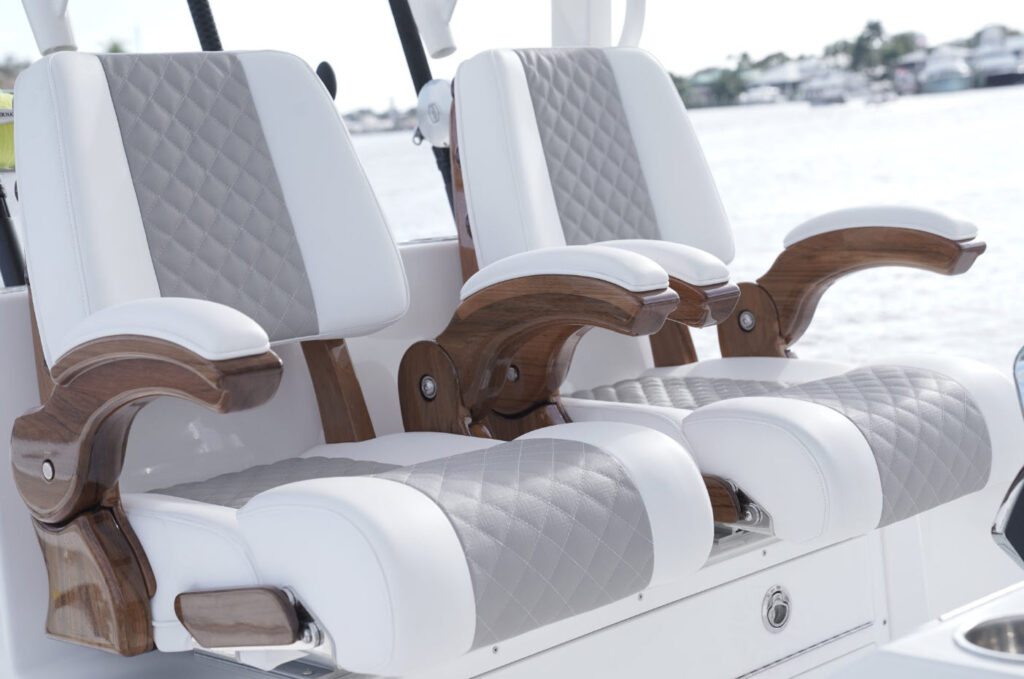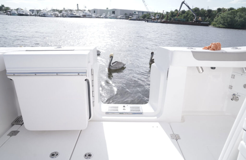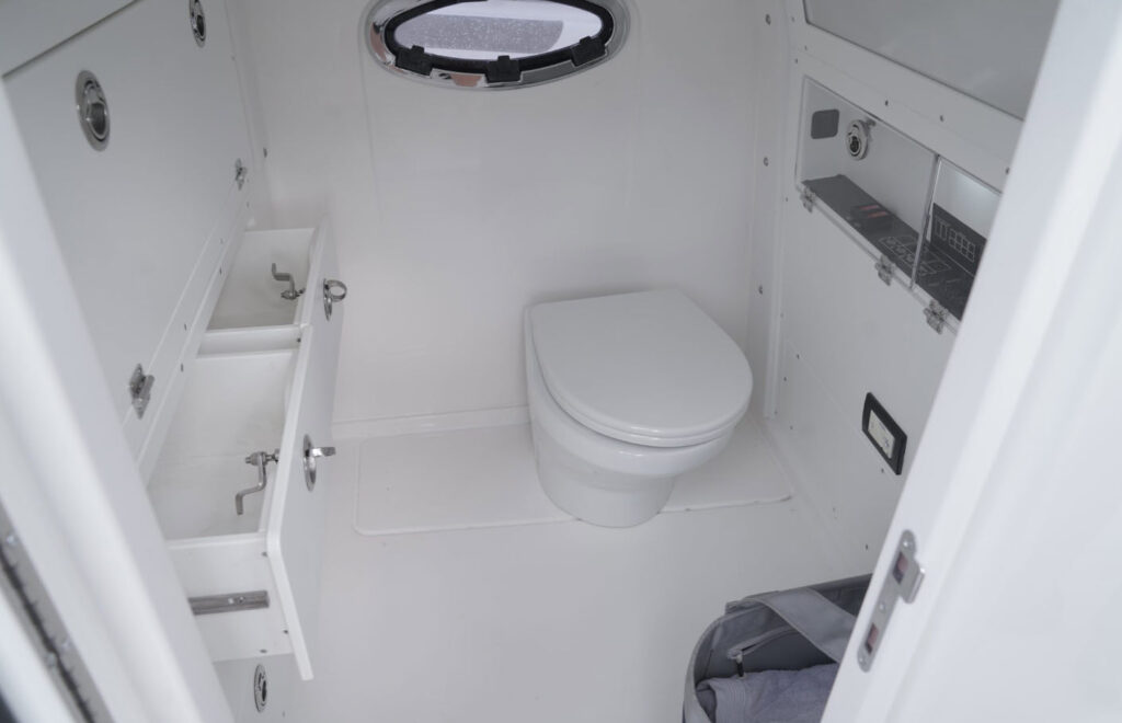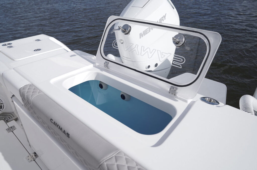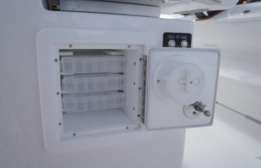 The 34 CT won’t know or understand boundaries and will be ready to take anything Mother Nature throws its way. With the double stepped, semi-asymmetric hulls and plenty of bow flair, you can fish in comfort through water you’d never brave with another center console in its class. The 34 CT contains six insulated plumbed storage boxes, totaling 3,000 qt of storage connected to macerator pumps. With two storage compartments forward, two mid-ship, and two in the cockpit floor, you can choose where you want to utilize the space for storage versus fishboxes. A 70 gallon transom livewell is standard, with options to add two 25 gallon live wells alongside, as well as plumbing the two after insulated storage boxes as livewells, for a total of 5 bait tanks all fed by a Hooker sea chest and Hooker electric pumps.