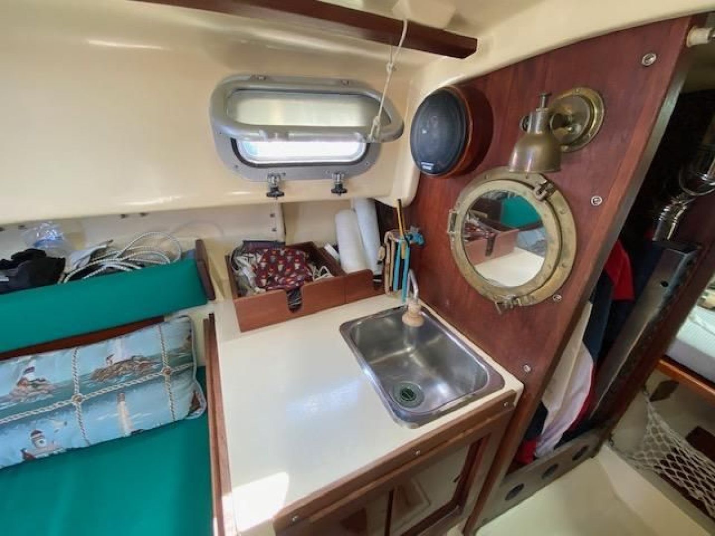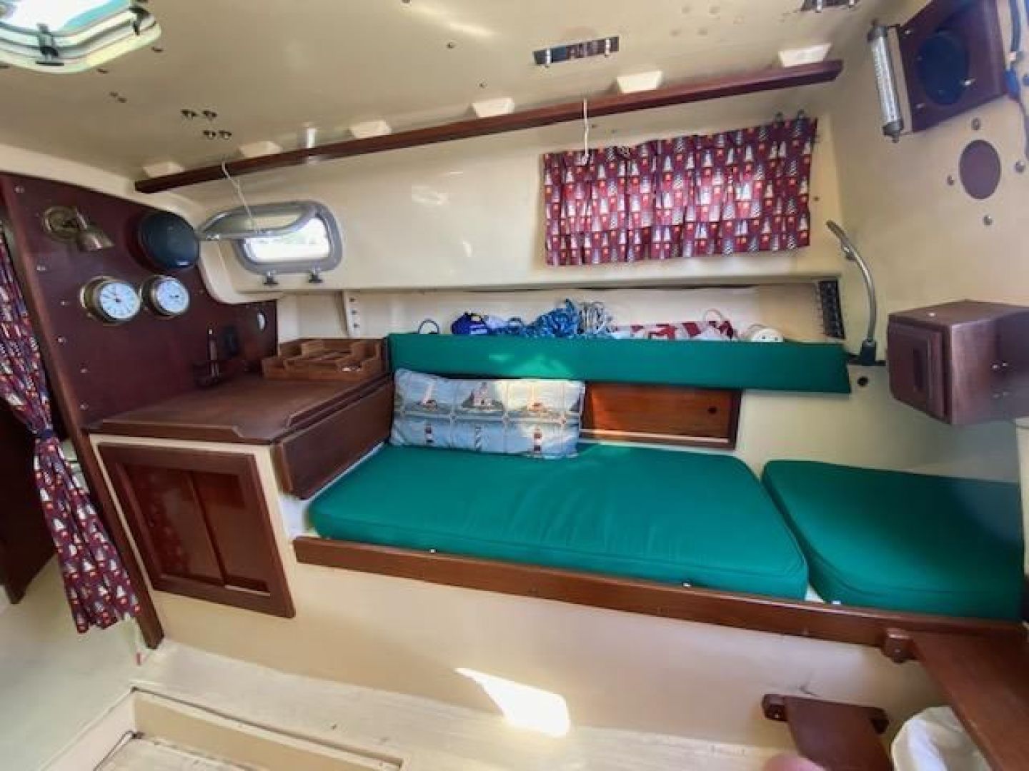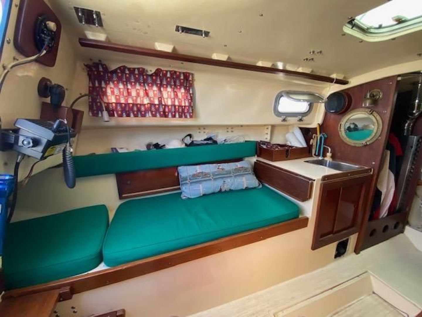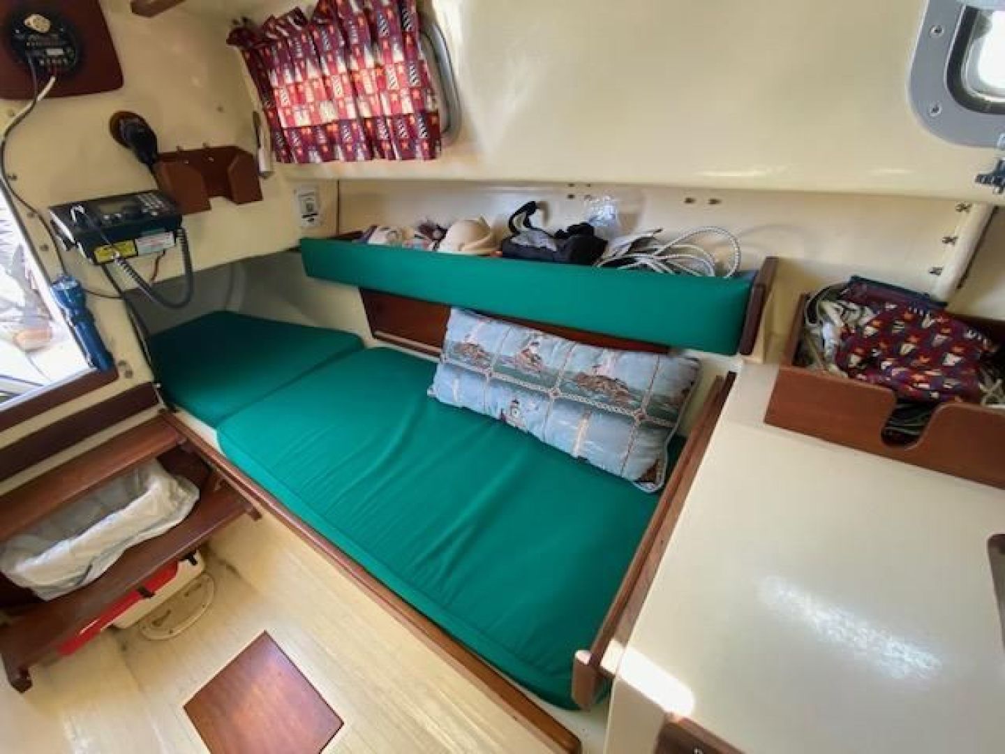 Accommodations: Sleeps 4, vee berth converts to a double. 2 6’6” quarter berths with lee cloths. To port & amidships is a hanging locker and sink. To port is the head and navigation table.