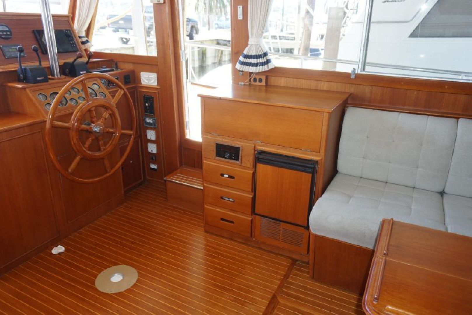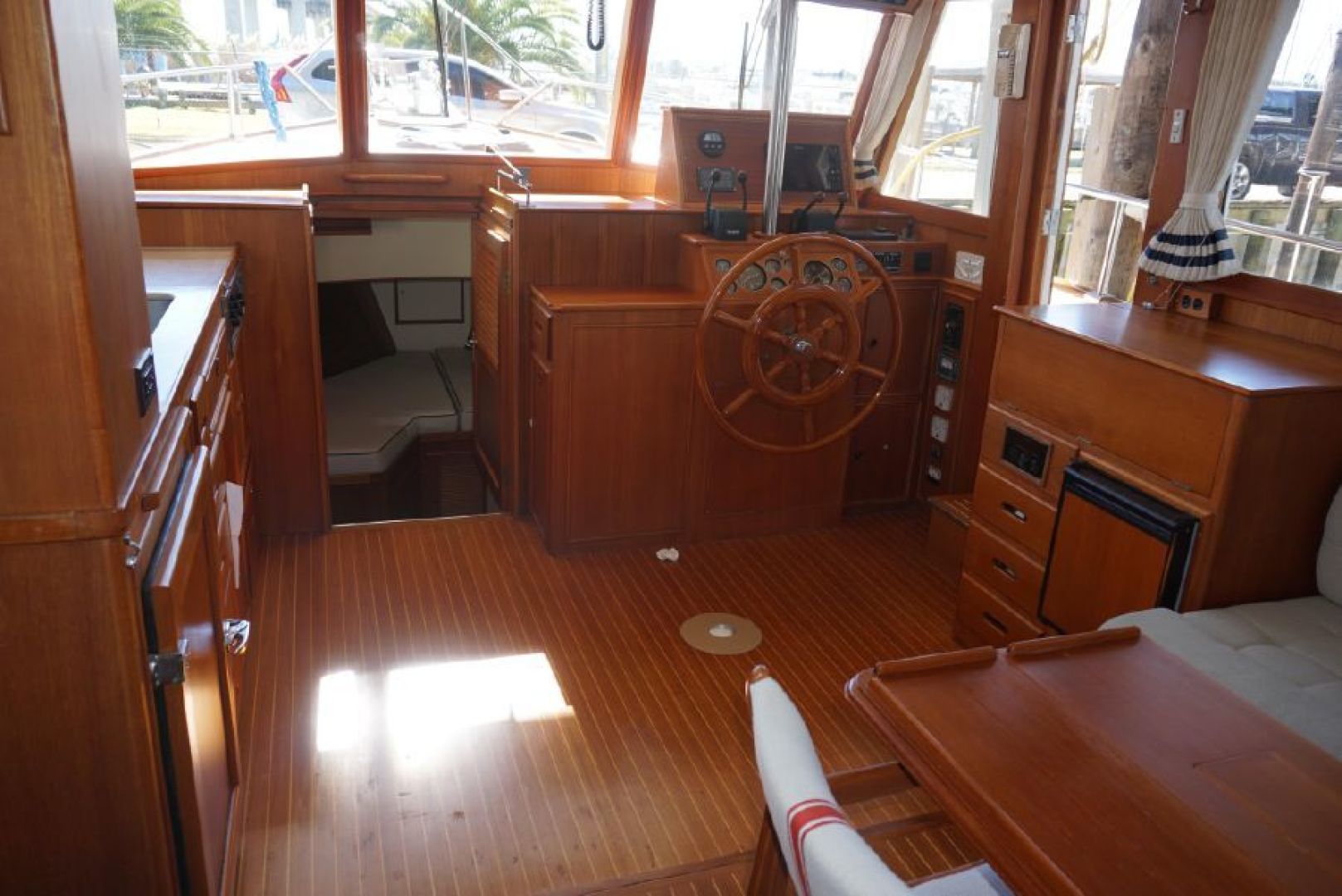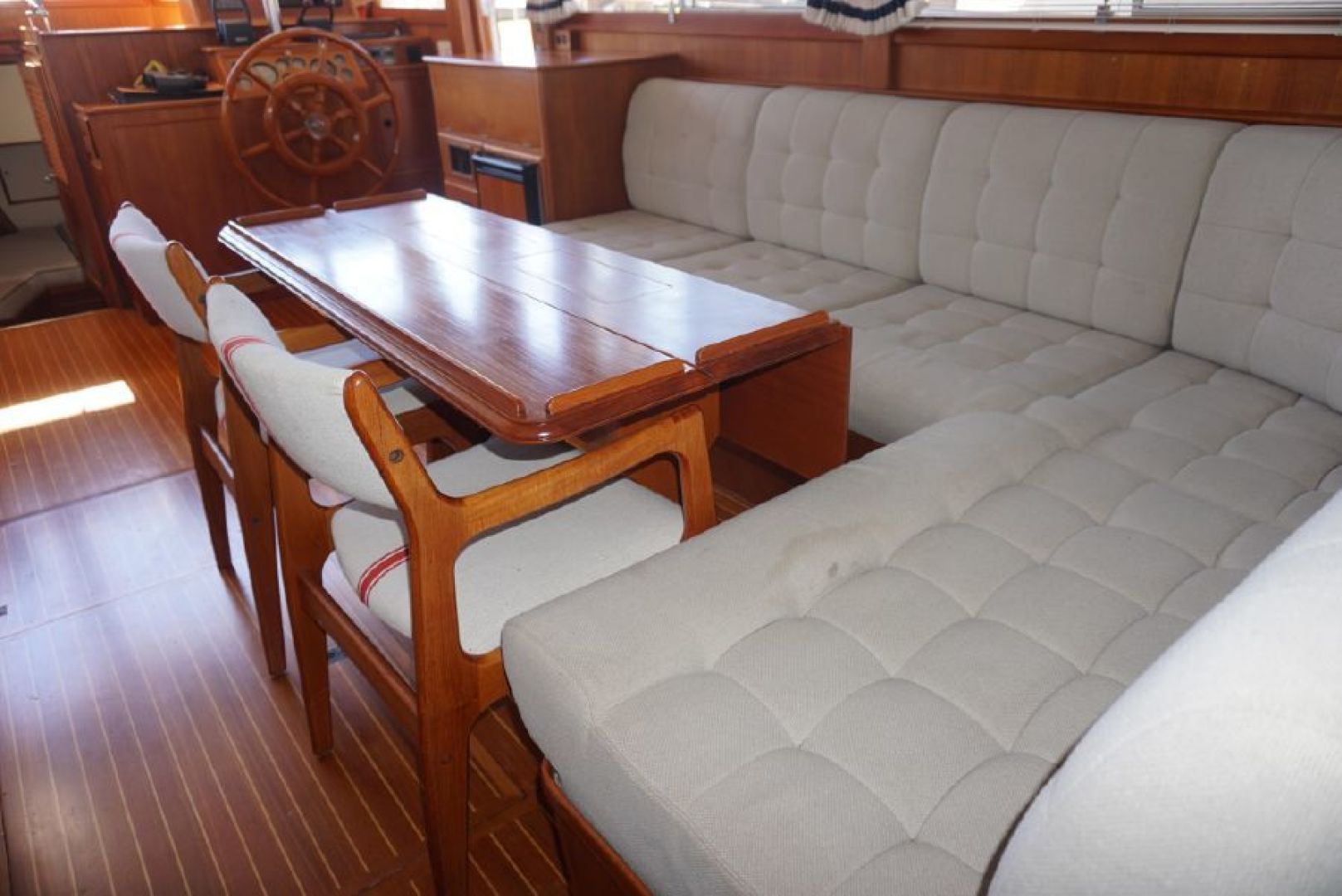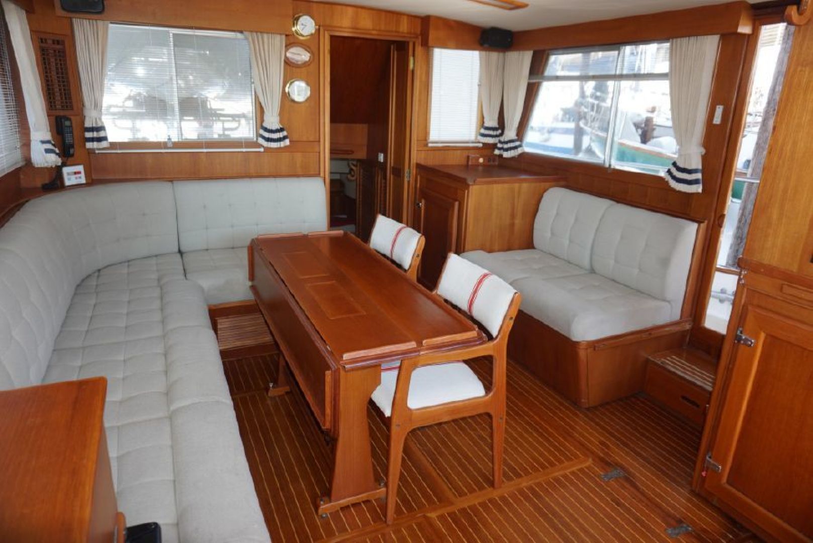 Galley up two stateroom two head layout, removable Helm Chair at lower station, teak and holly cabin sole through out, galley amidships to port, abundant locker and draw storage, 3 burner electric cooktop, Gurnert Cold Plate 12VDC refrigeration, opposite to starboard teak cabinet style storage with built in icemaker and liquor storage. Long L shaped settee with bifold table on centerline, small settee with additional Gurnert Cold Plate refrigerator aft to port, aft cabin features split berth arrangement, twin size berth to starboard, single berth to port, enclosed head with separate stall shower to starboard, vaccue flush head