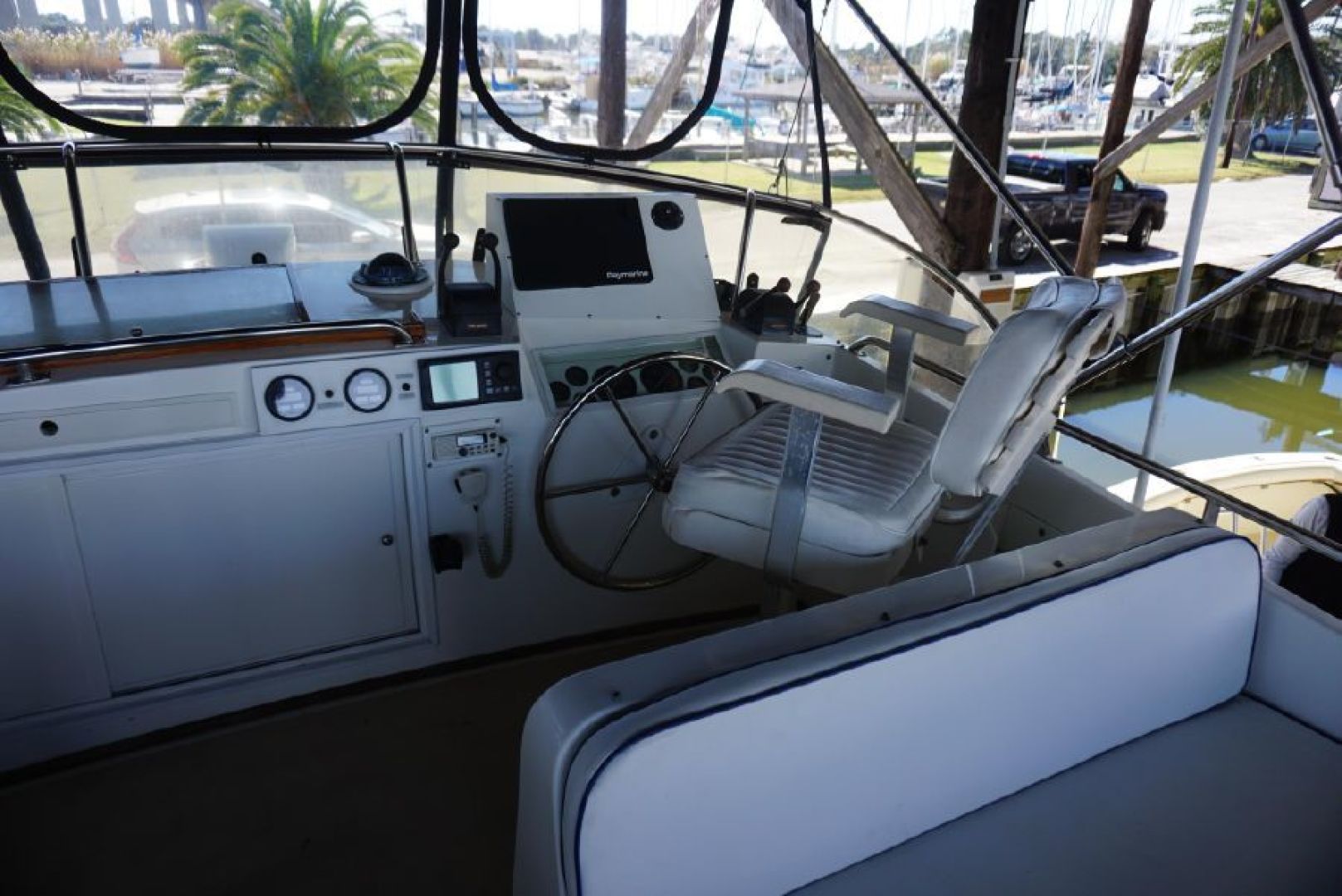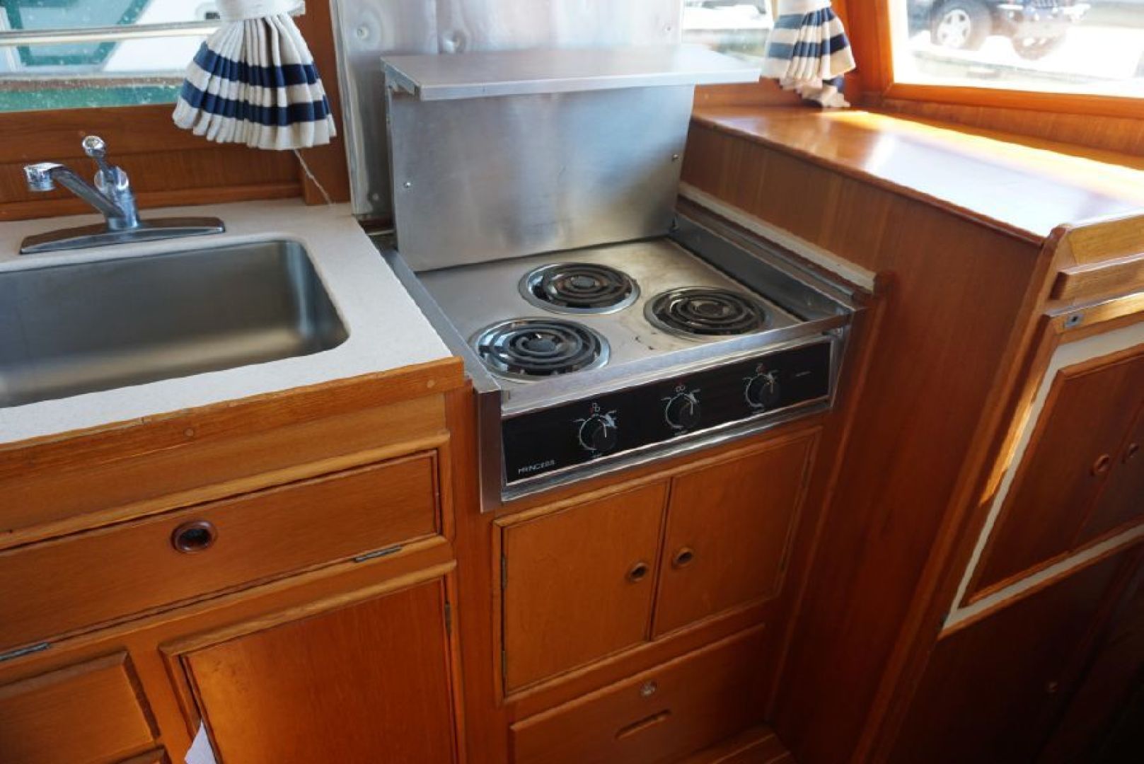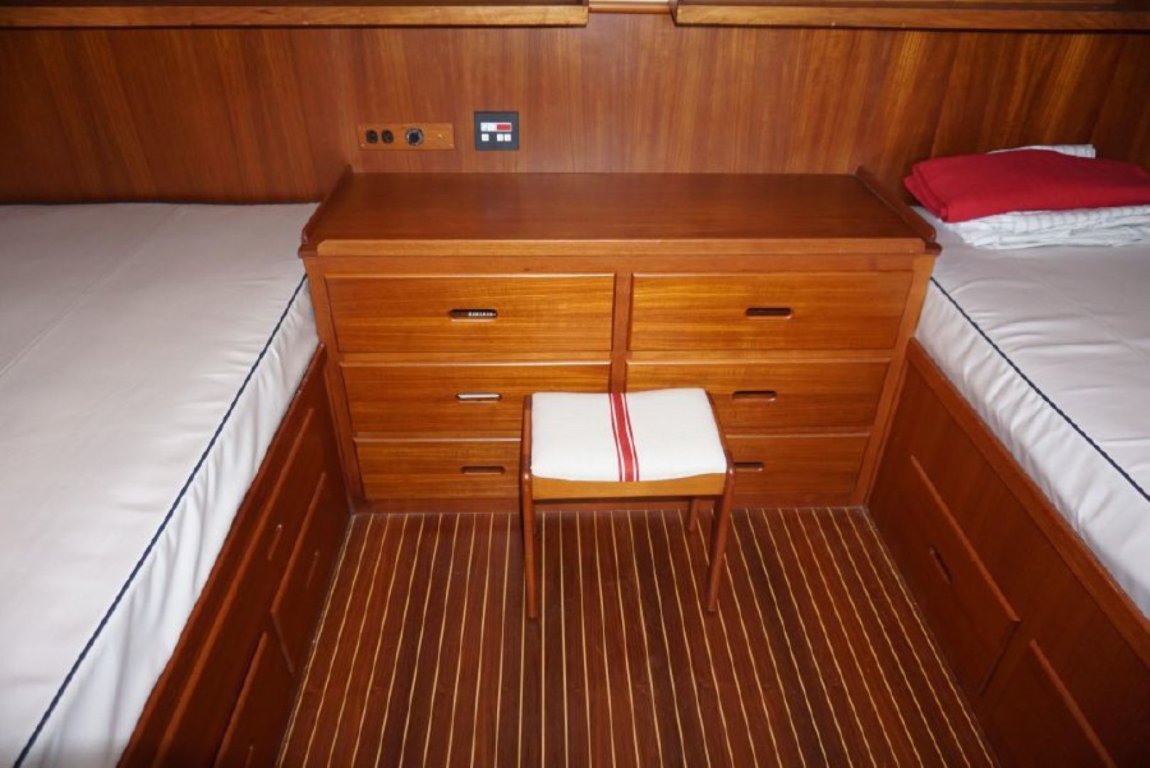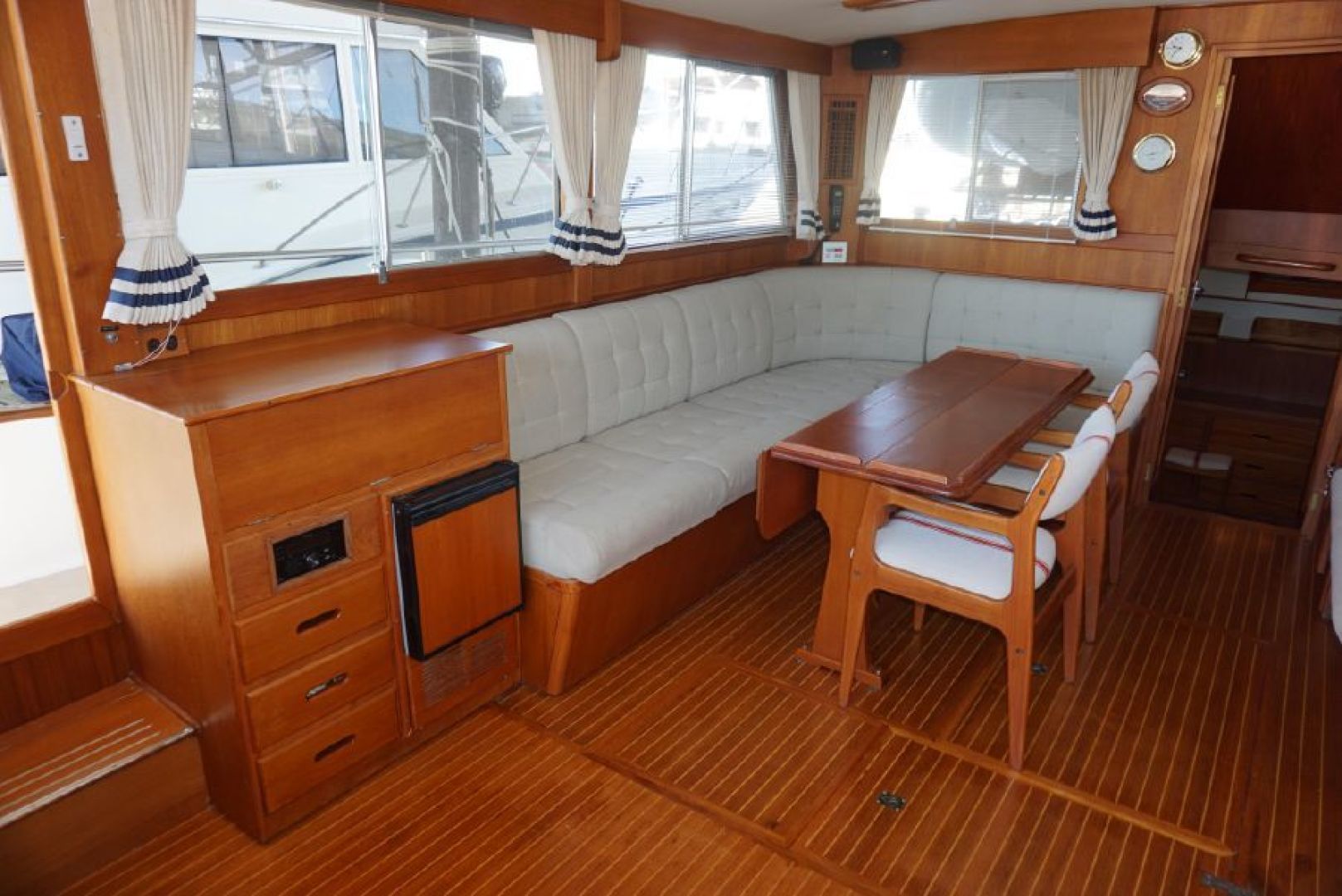 Galley up two stateroom two head layout, removable Helm Chair at lower station, teak and holly cabin sole through out, galley amidships to port, abundant locker and draw storage, 3 burner electric cooktop, Gurnert Cold Plate 12VDC refrigeration, opposite to starboard teak cabinet style storage with built in icemaker and liquor storage. Long L shaped settee with bifold table on centerline, small settee with additional Gurnert Cold Plate refrigerator aft to port, aft cabin features split berth arrangement, twin size berth to starboard, single berth to port, enclosed head with separate stall shower to starboard, vaccue flush head