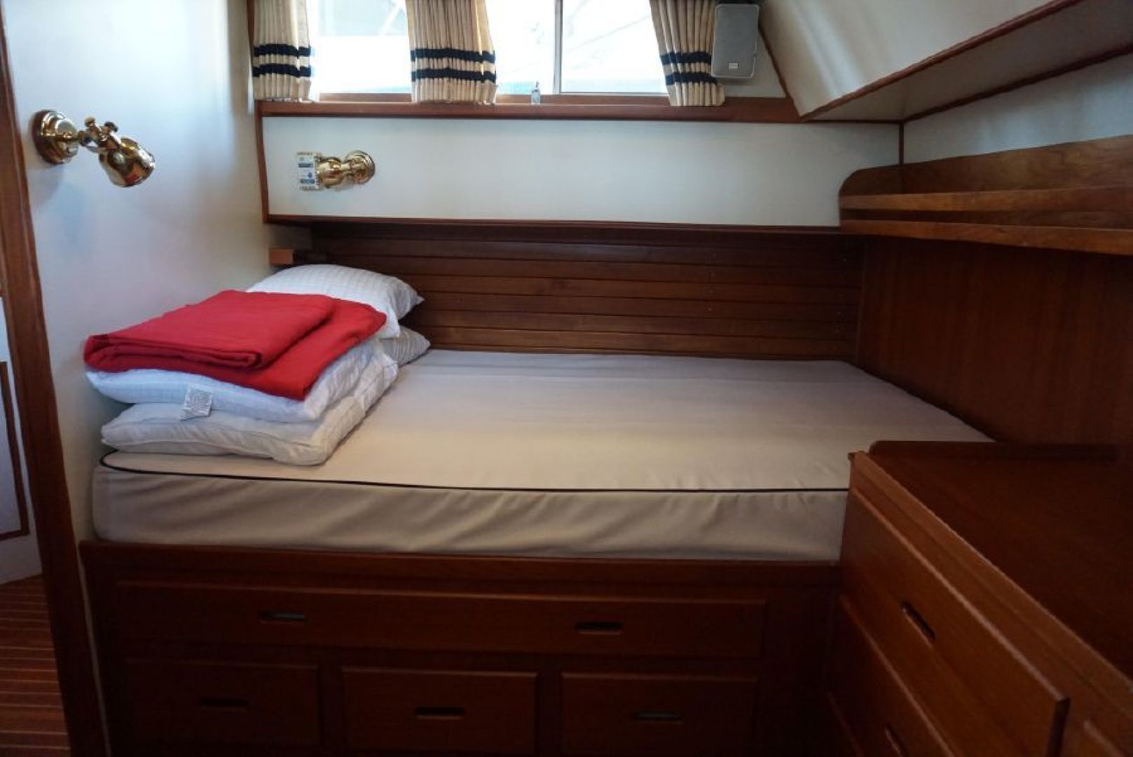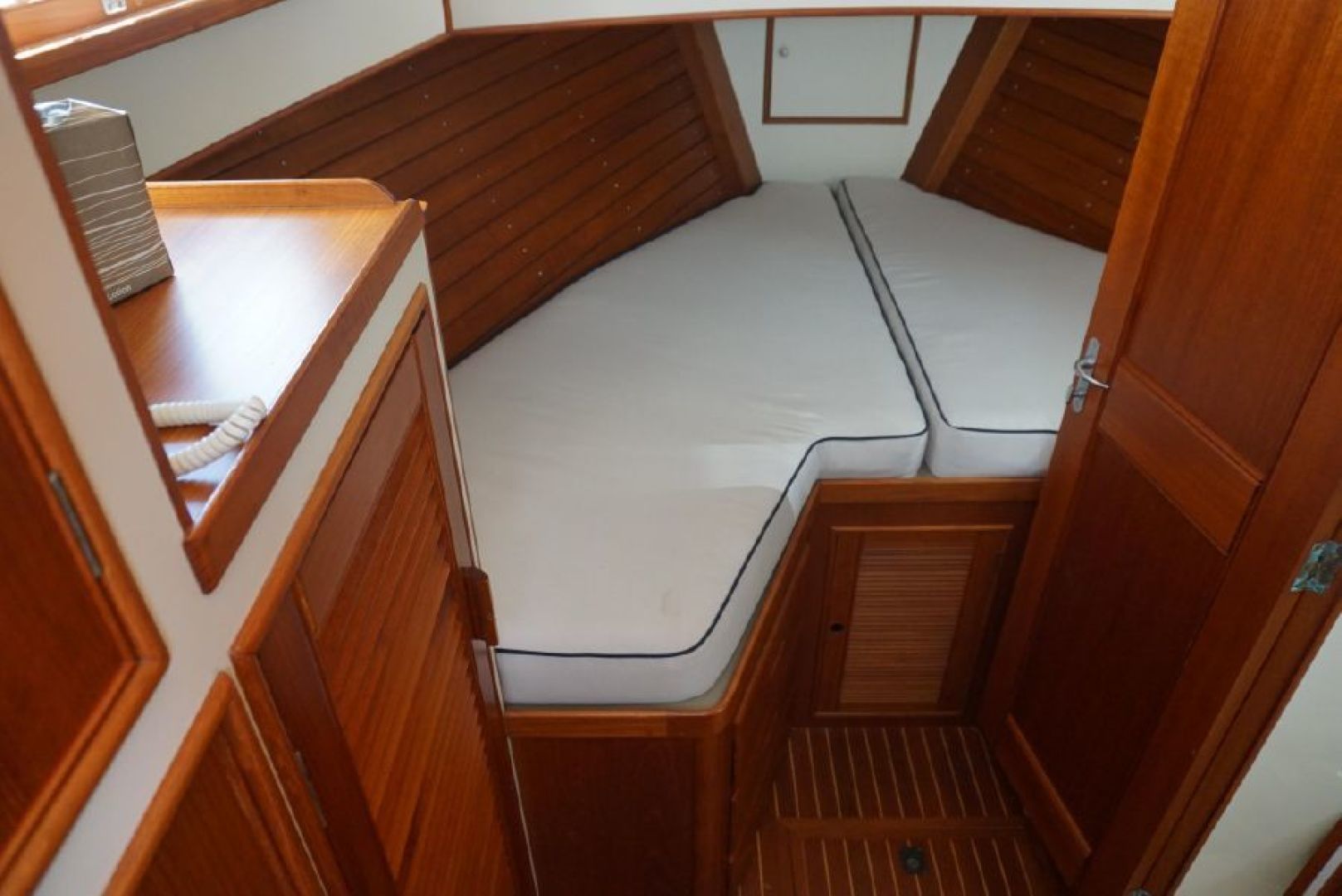 Forward stateroom features large v berth with insert, abundant locker and drawer storage, enclosed head and shower