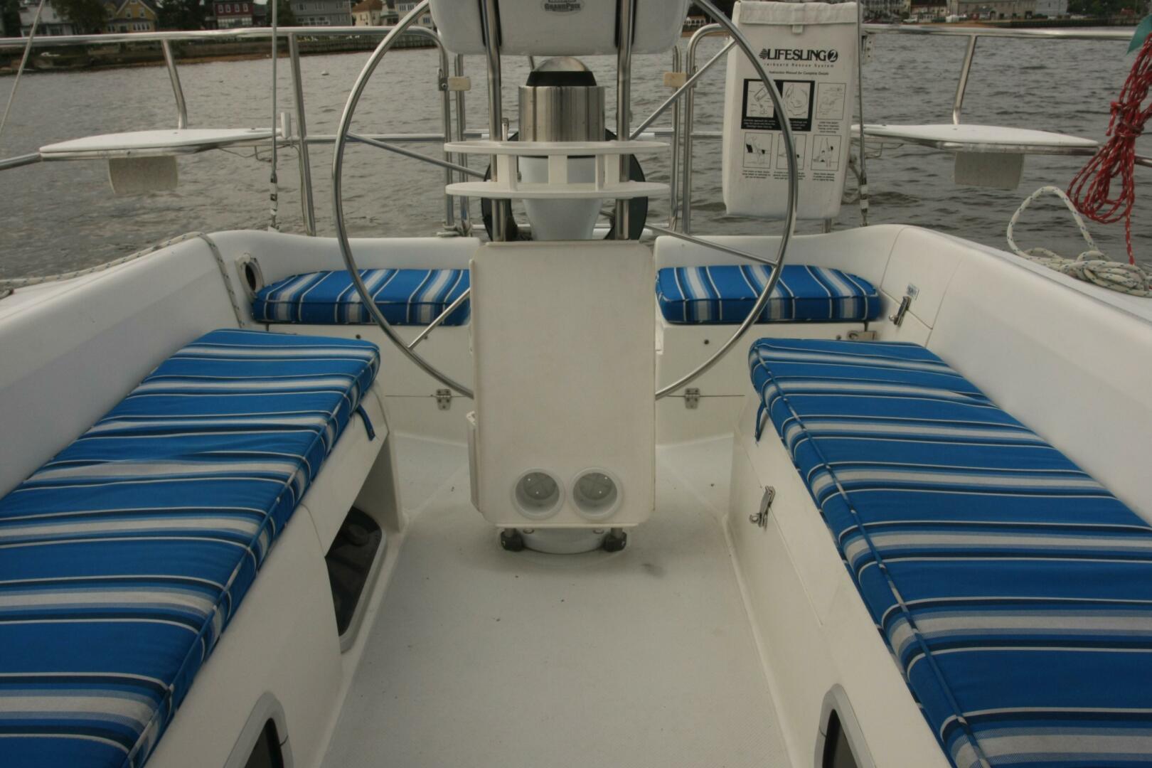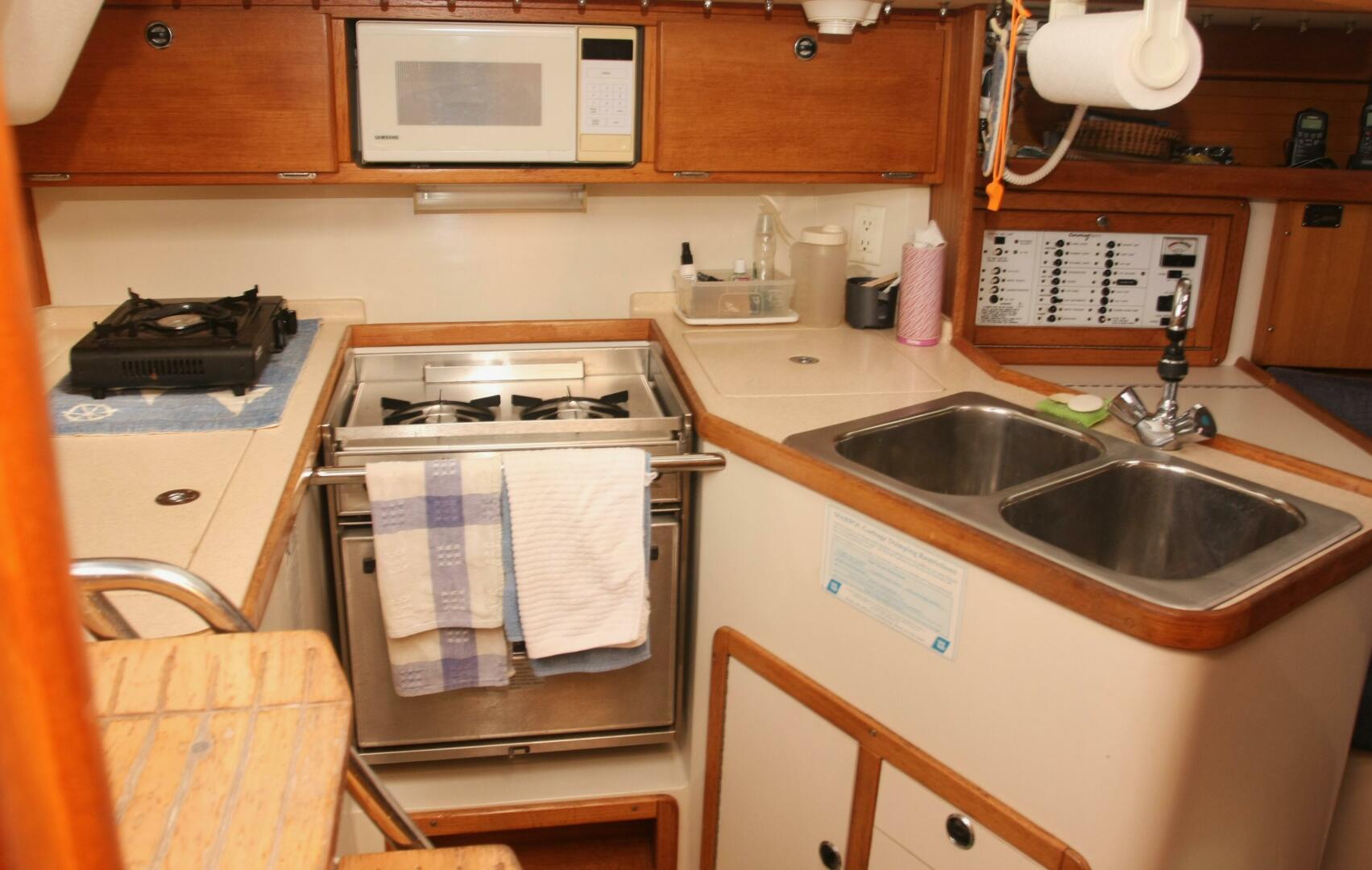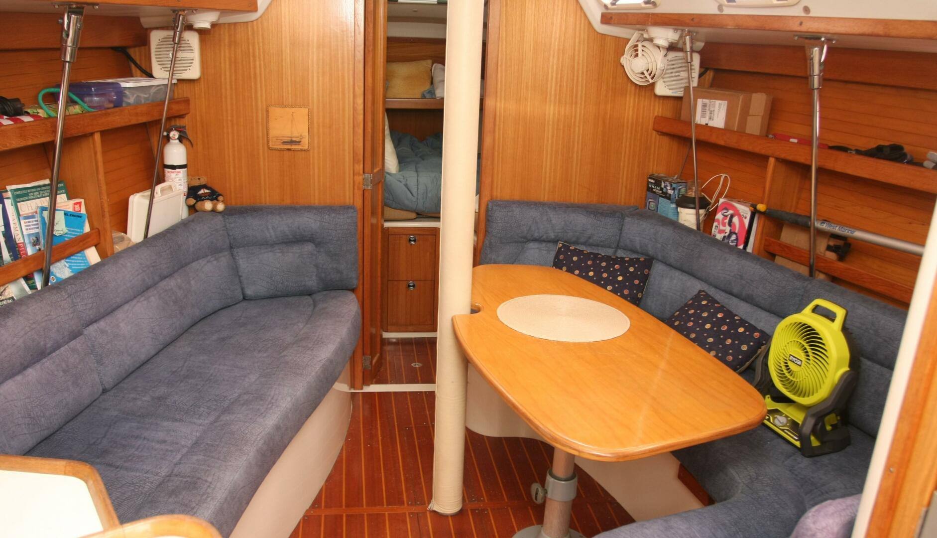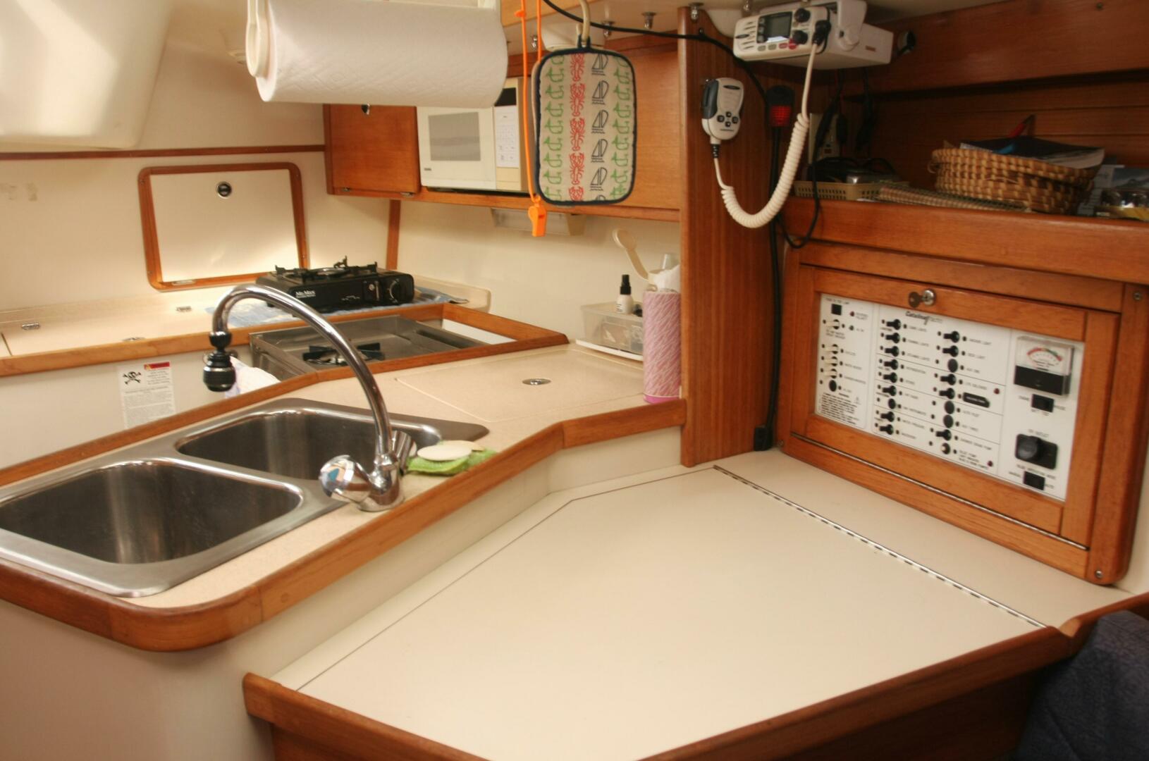 With a traditional layout with 6'2" headroom down below and can sleep as many as 7. Double aft athwart ship stateroom starboard and aft, with a full galley port of companionway. Adjacent to the galley is a head with sink, shower, vanity and storage. The roomy salon features a table which converts to a double berth along starboard midship, with a long couch bench to port with chart table. Double V-berth is forward.