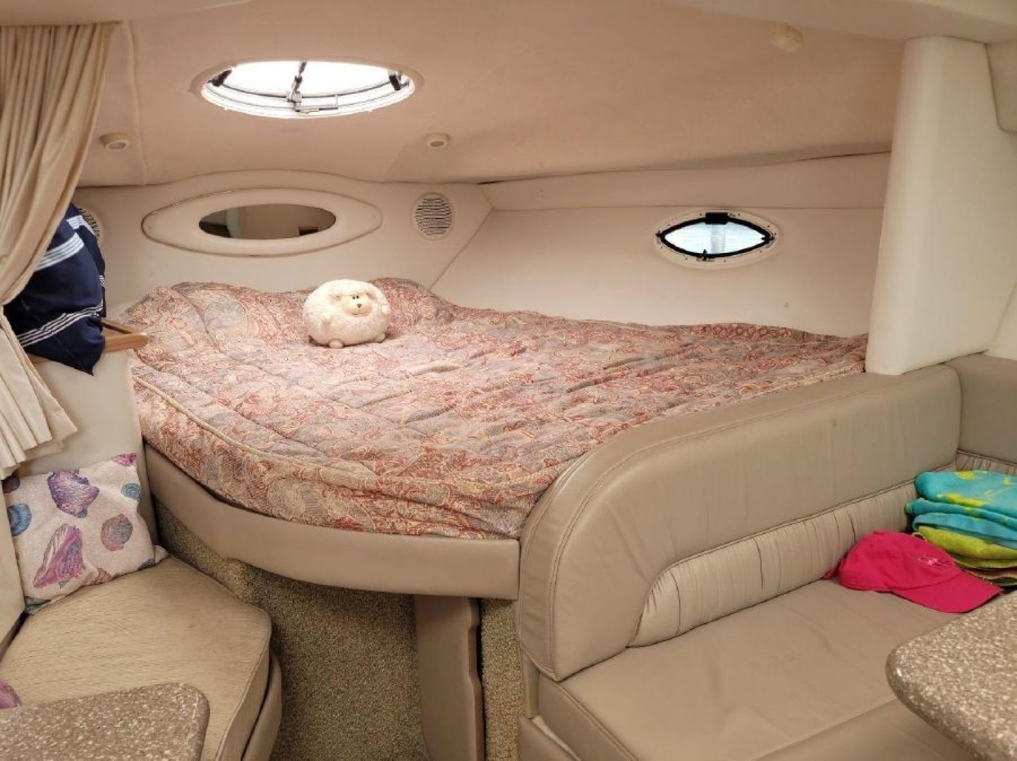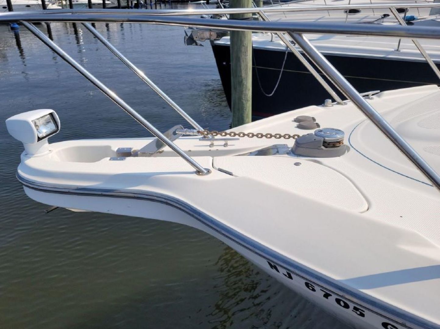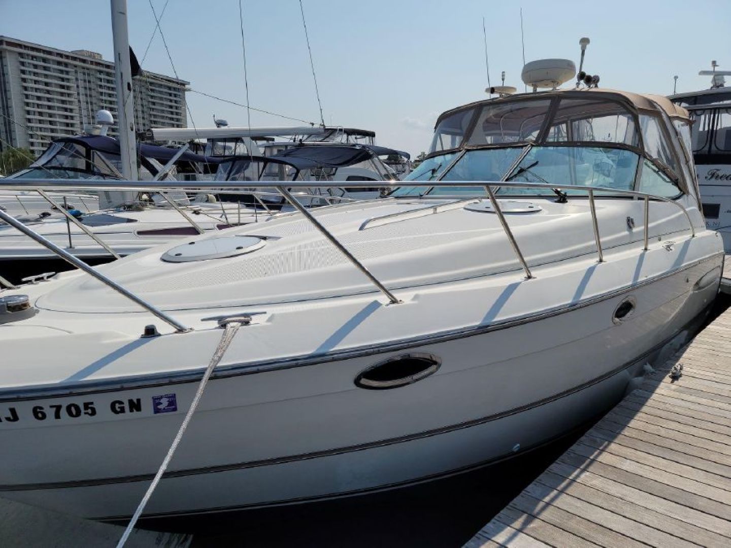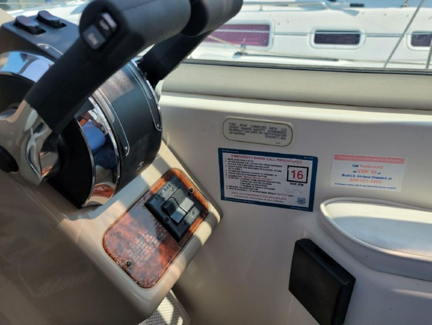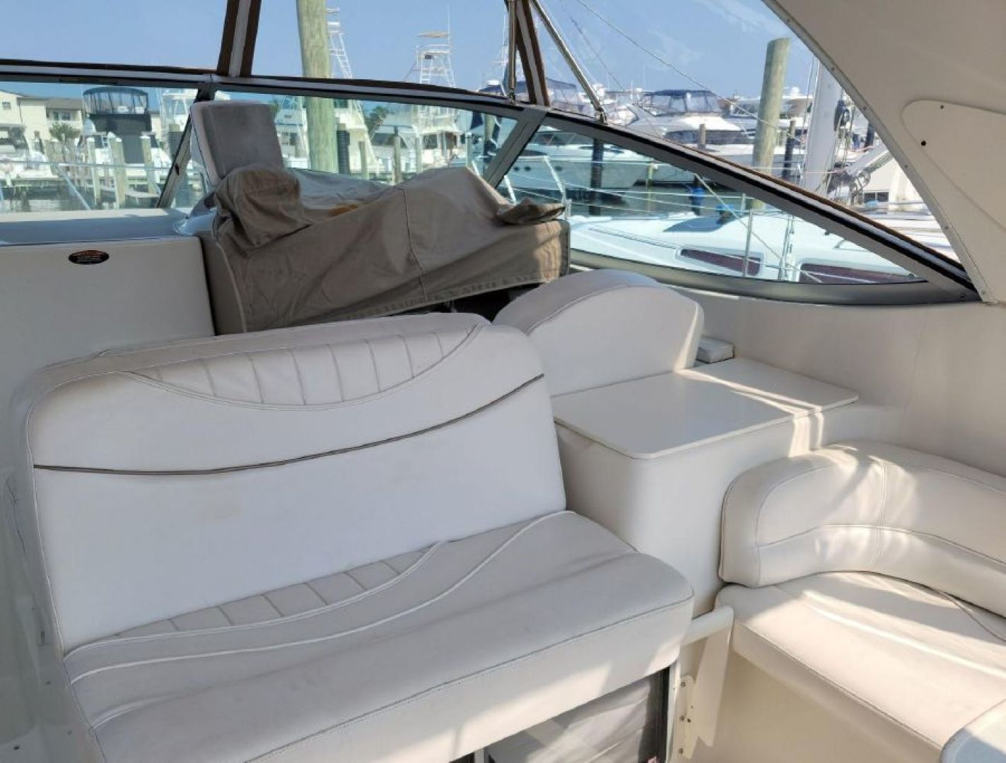 A stylish boat with a reverse arch and long foredeck, the Maxum 3300 SCR (called the 3300 SE in 2003–07) was one of the more affordable family cruisers her size during the early 2000s. Like her sister ships in the Maxum fleet, she’s built on a straightforward modified-V hull with an integral swim platform and bow pulpit.