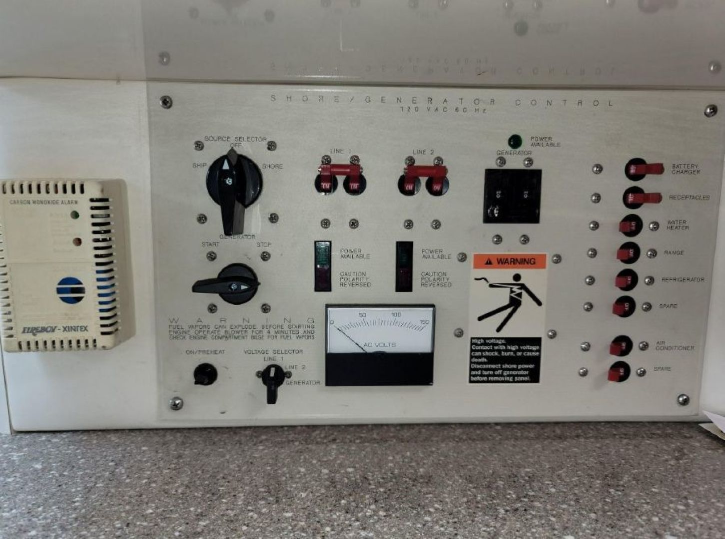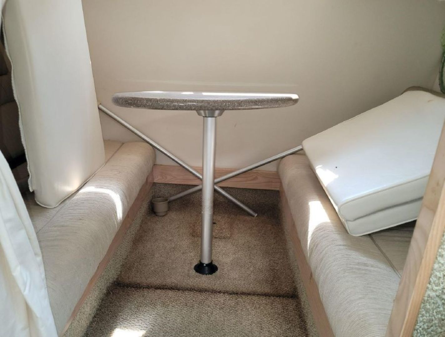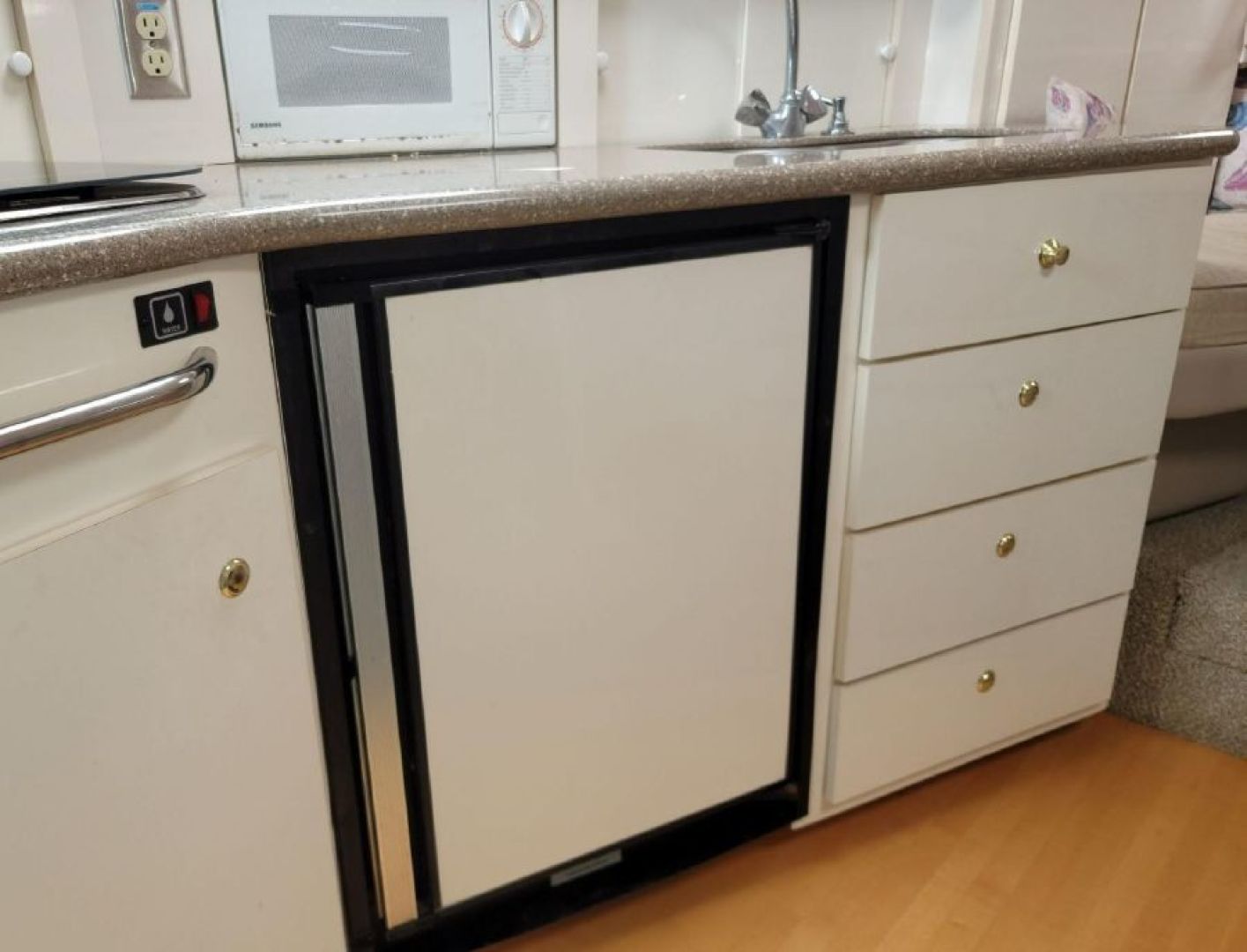 The mid-cabin interior is arranged with an offset double berth forward, a convertible dinette to starboard and a full galley (with Corian countertops and a hardwood floor) opposite. The head is aft, across from the entryway where it’s easily accessed from the cockpit. There are plenty of storage bins and lockers below, and three overhead hatches and three opening ports provide good cabin ventilation. The cockpit of the 3300 is set up a little different than most with facing settees aft, a centerline transom door, and an aft-facing lounge behind the (triple-wide) helm seat. A cockpit entertainment bar was standard, and a walk-through windshield provides access to the foredeck sun pad.