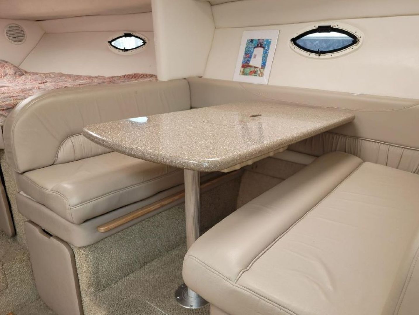 The Maxum 3300SCR is for those who demand both quality and performance. Maxum's flagship cruiser has a wraparound console embracing a helm equipped with an impressive complement of instruments in an ergonomically designed console. A cockpit wetbar invites spontaneous celebration. The spacious galley of the 3300SCR has hardwood floors, berber-style carpet, rich Corian countertops, and designer fabrics. Entertain with panache from a gourmet galley, and fall asleep in a moonlit berth. The salon features a dinette lounge seat with an adjustable height, high - low Corian tabletop.