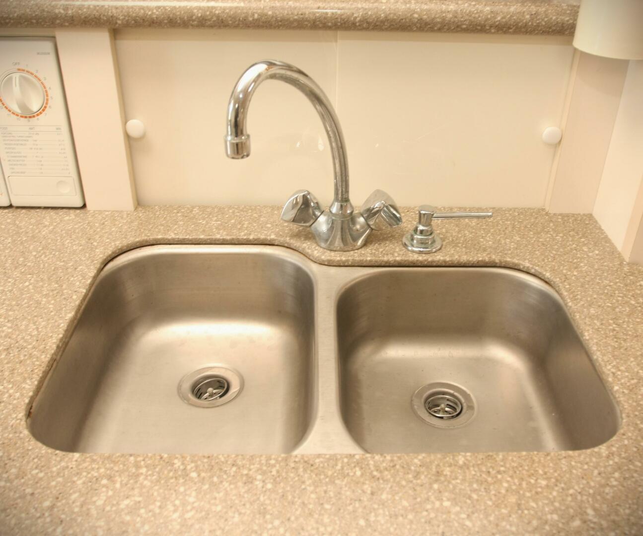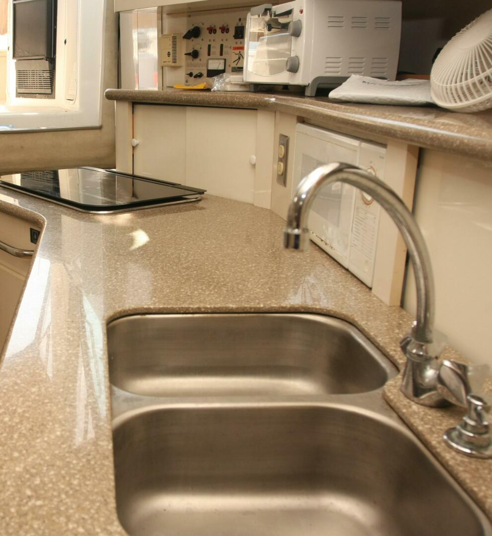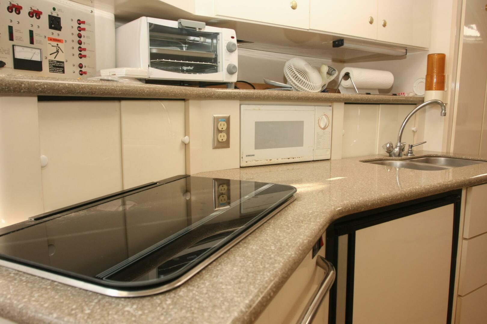 The spacious full -service galley is furnished with hardwood flooring, Berber style carpet, rich Corian countertops, a microwave oven, new toaster oven, stove, refrigerator, double stainless sinks and lots of storage in cabinets and drawers.