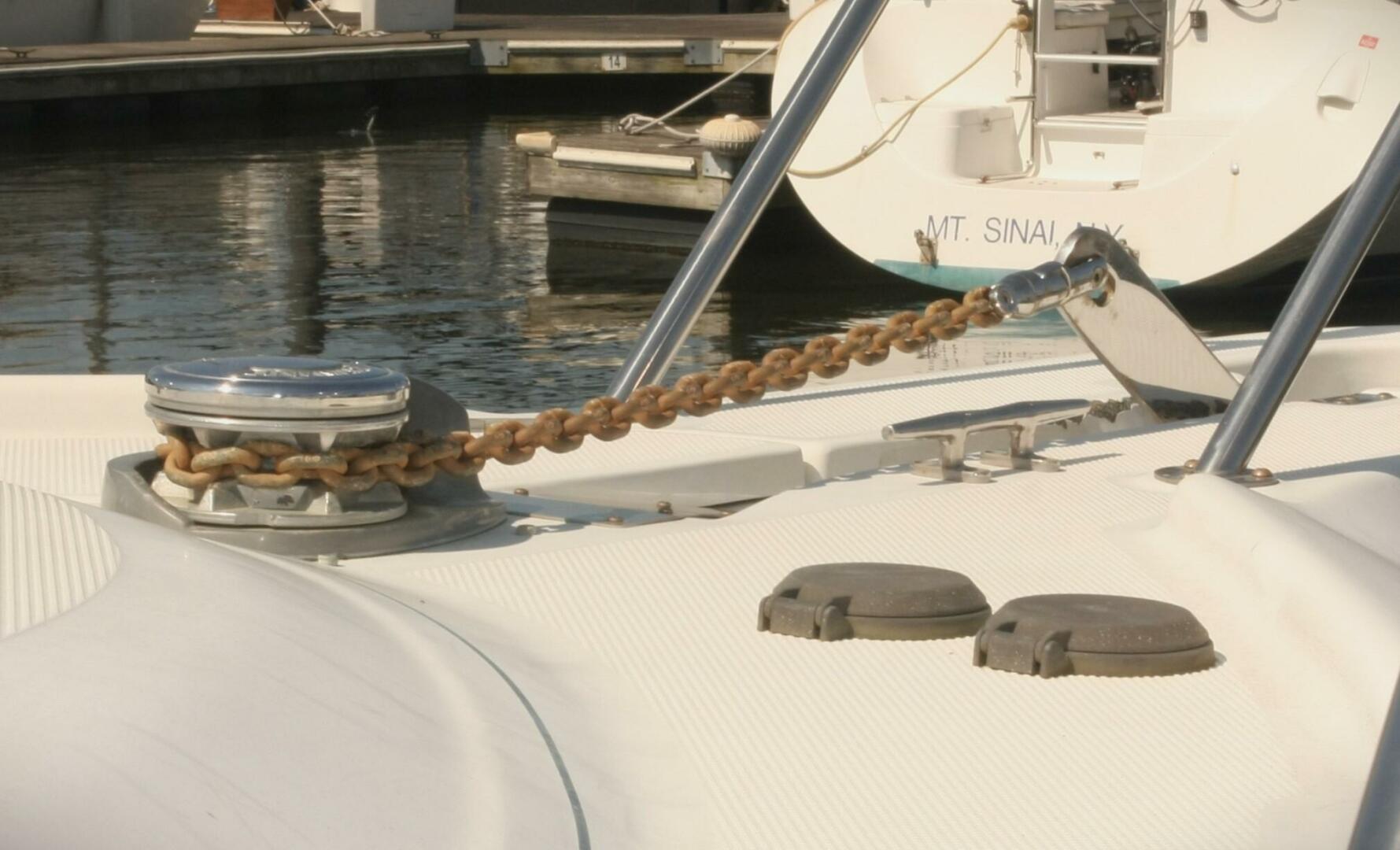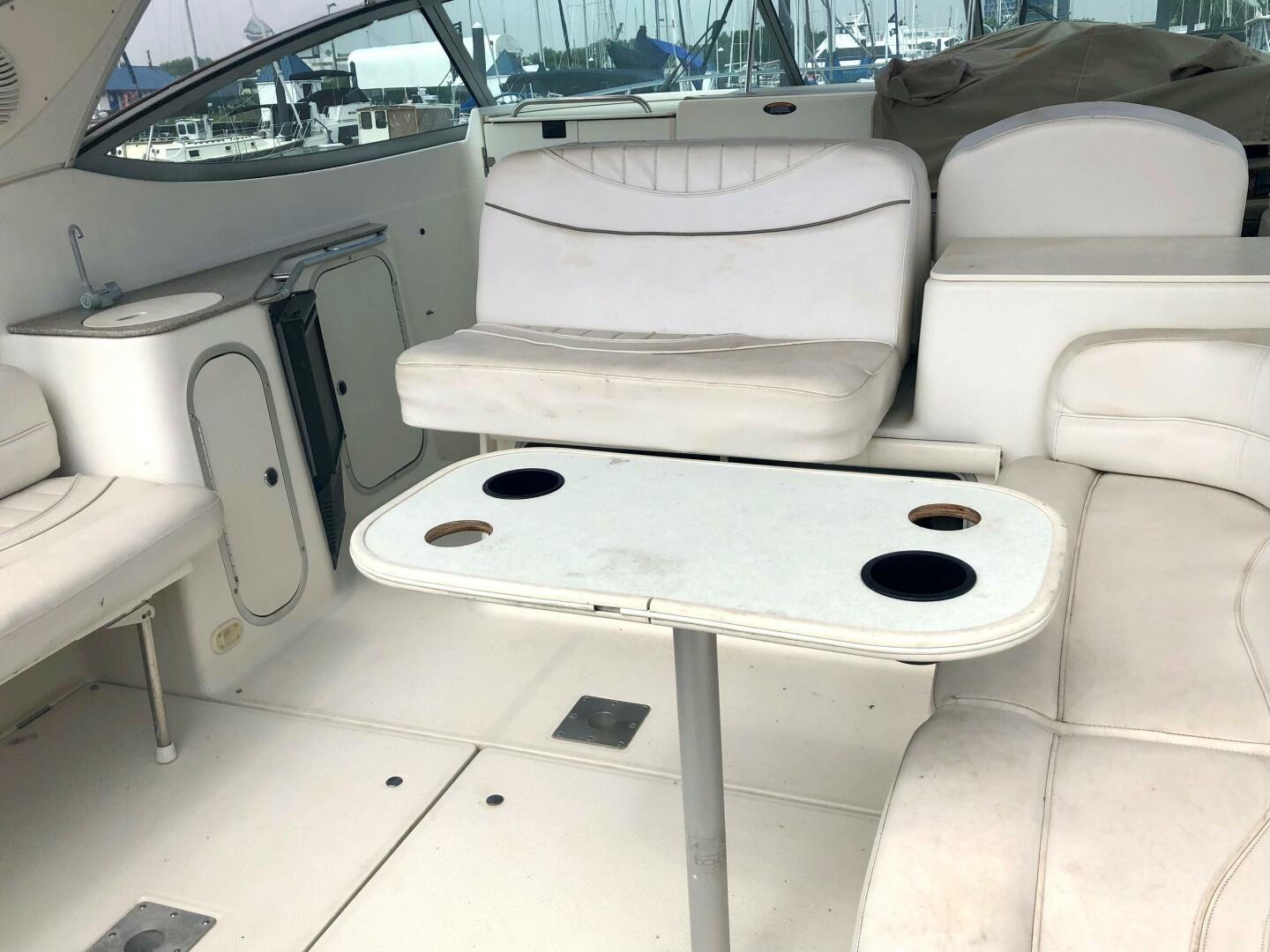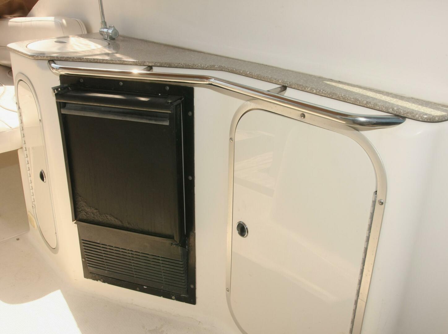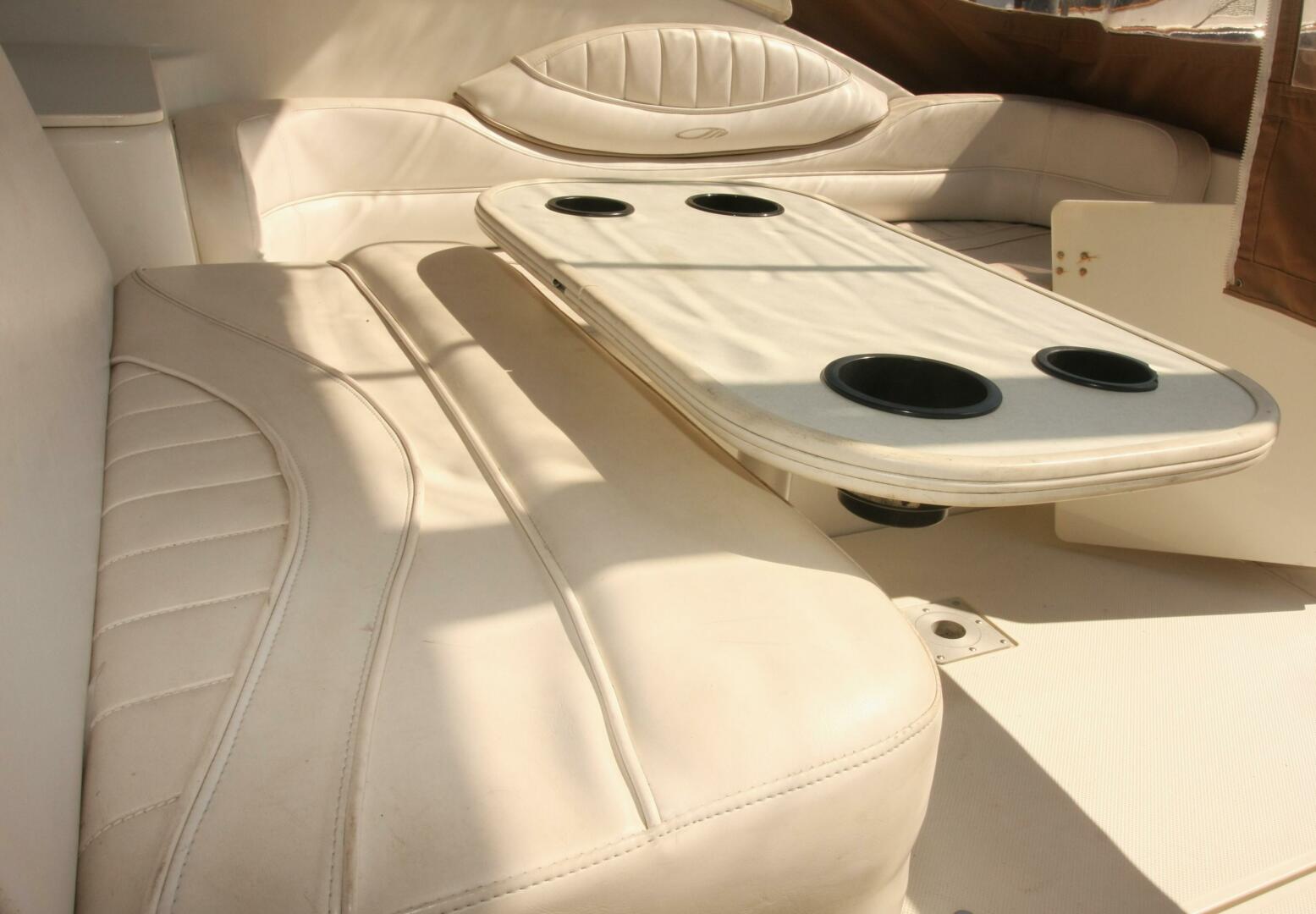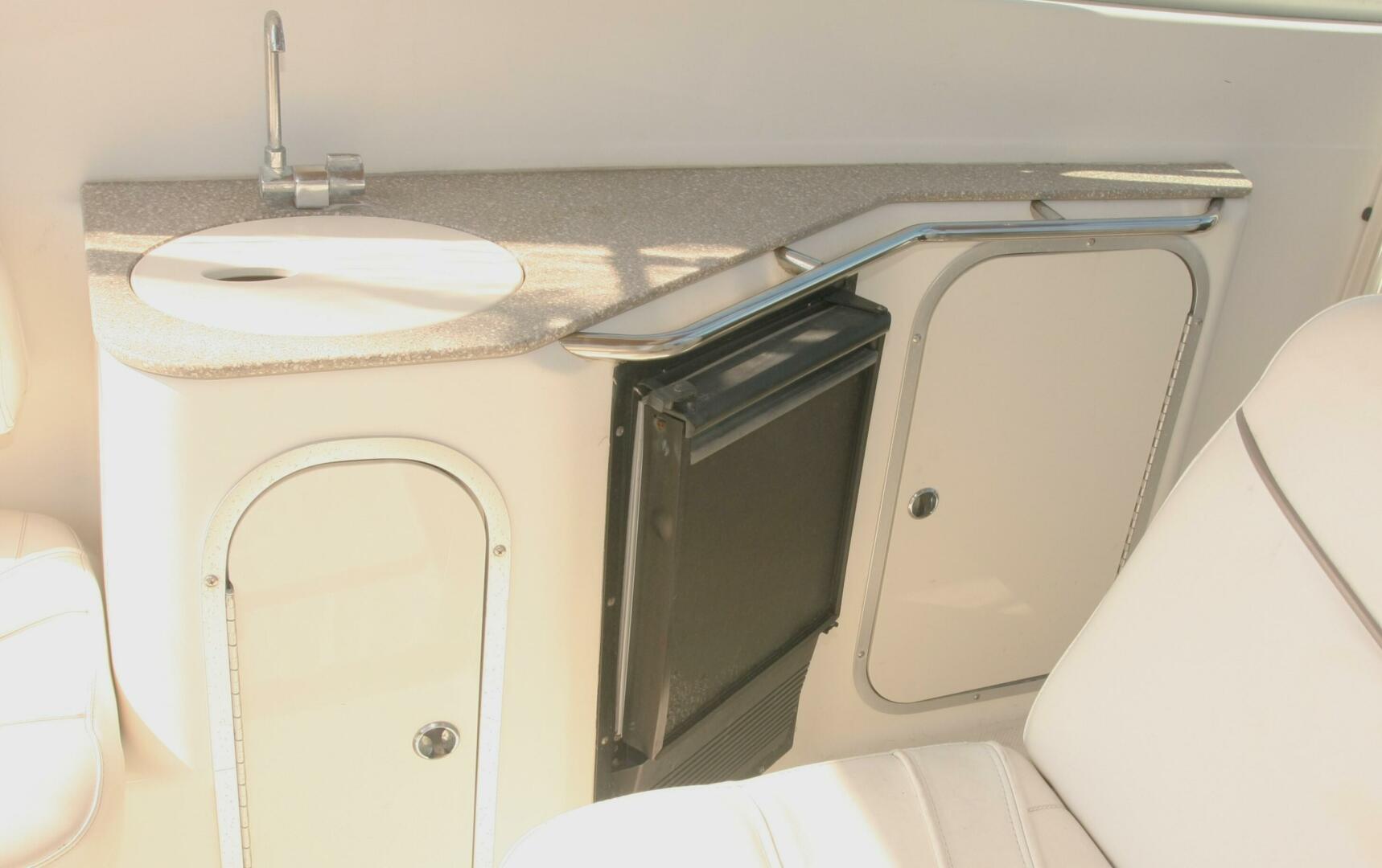 Thanks to a smart and efficient layout as well as her extra wide beam she feels larger than a 33 foot boat. The air conditioned interior features three sleeping areas, with overhead hatches for light and ventilation. Enclosed head with marine toilet, holding tank, sink, vanity, shower and storage. The cockpit of the 330 is slightly different than most with facing settees aft, a centerline transom door, and an aft-facing lounge behind the (triple-wide) helm seat. A cockpit entertainment bar with sink and ice maker is great for entertaining. A walk-through windshield provides access to the foredeck. Extended swim platform with telescoping swim ladder.