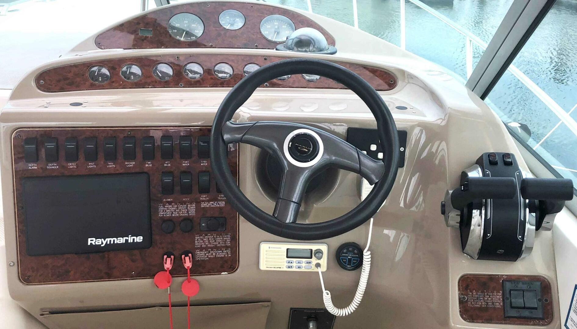 Express Cruiser with bimini top and full-enclosure side panels. Roomy cockpit can seat 8. Nicely equipped with new Raymarine Touch Screen Chartpotter, Raymarine Radar, VHF Radio, Air Conditioning/Reverse Cycle Heat, Anchor windlass, cockpit wet bar, Premium stereo and more. Excellent below with full galley, dinette, platform bed and mid cabin berth. She features lots of storage and can sleep as many as 6. Complete recent engine service and upgrades. A great family cruiser at an affordable price!