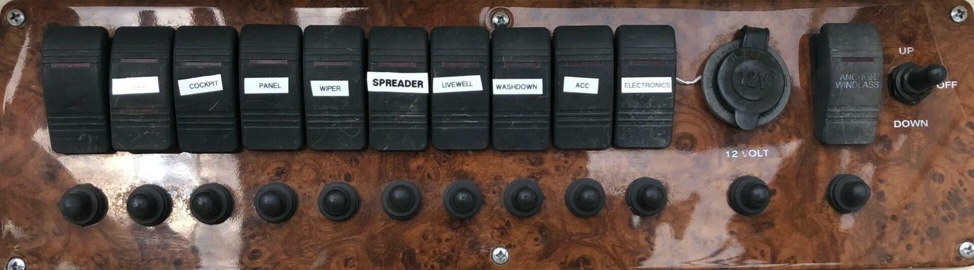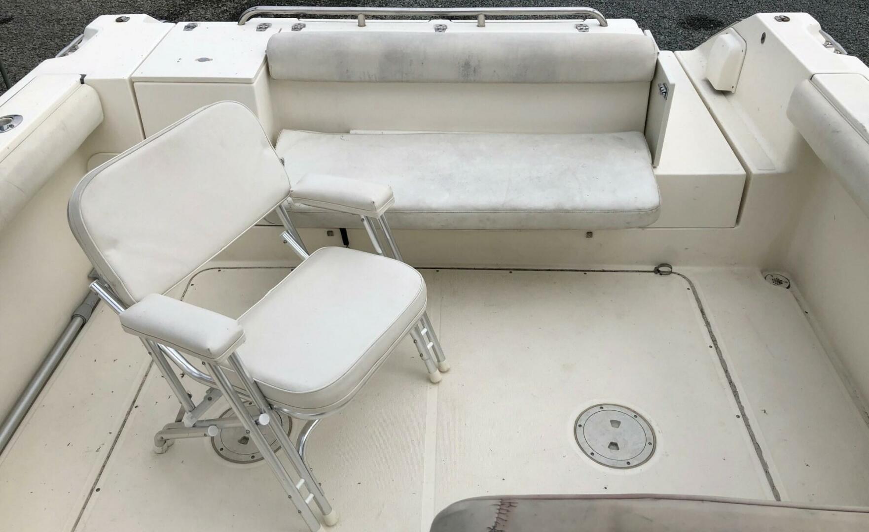 The Denali’s well-appointed cuddy cabin contains berths for two with a teak-and-holly sole, removable table, galley with sink, refrigerator and stove, and an enclosed head w/ sink , vanity and toilet. Her spacious helm deck features a wet bar, and well-designed helm. The aft cockpit is large enough for several anglers and their gear, with folding aft seat. The transom contains a freshwater sink, insulated fish box/cooler, and raw-water washdown. Swim platform has a removable boarding ladder and shower.