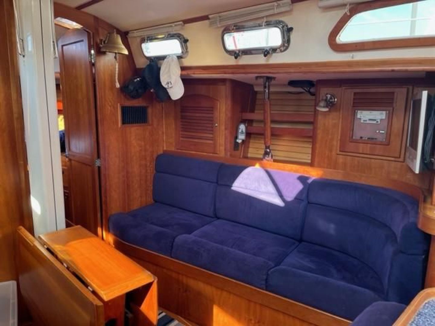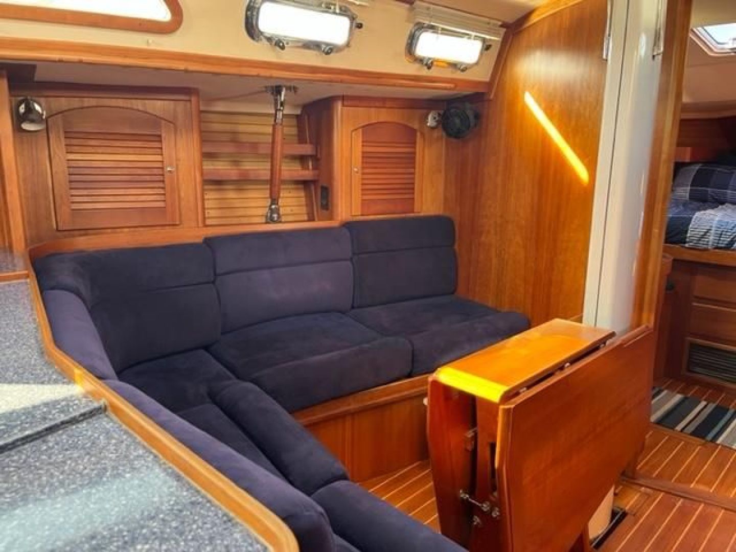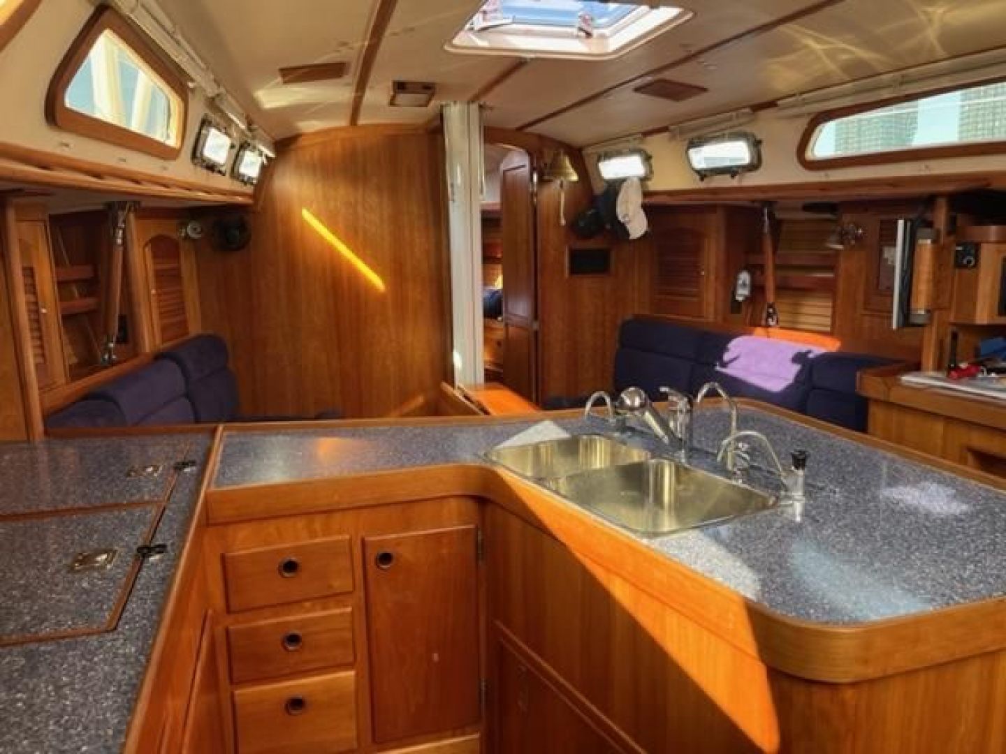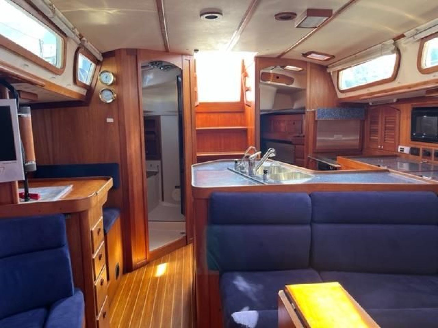 Double stateroom layout with varnished cherry interior and varnished teak and holly cabin sole. Natural light and ventilation are superb with 8 Lewmar aluminum hatches with screens and 8 polished stainless ports with screens, 4 fixed ports and 2 dorade vents. Excellent reading lamps at each berth and settee as well as several overhead dome style lamps. The upholstery is Ultra-suede, "Indigo" blue in the main salon and contrasting darker blue fabric "Ink" in the fore and aft staterooms.