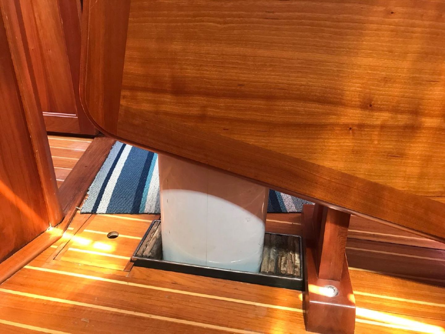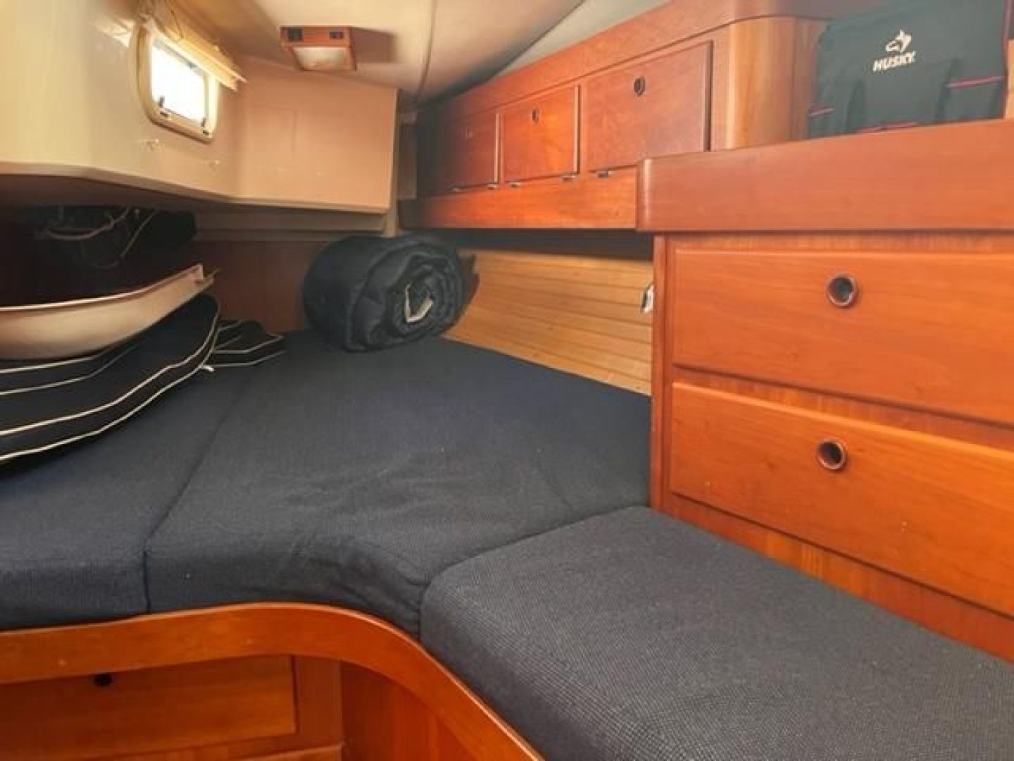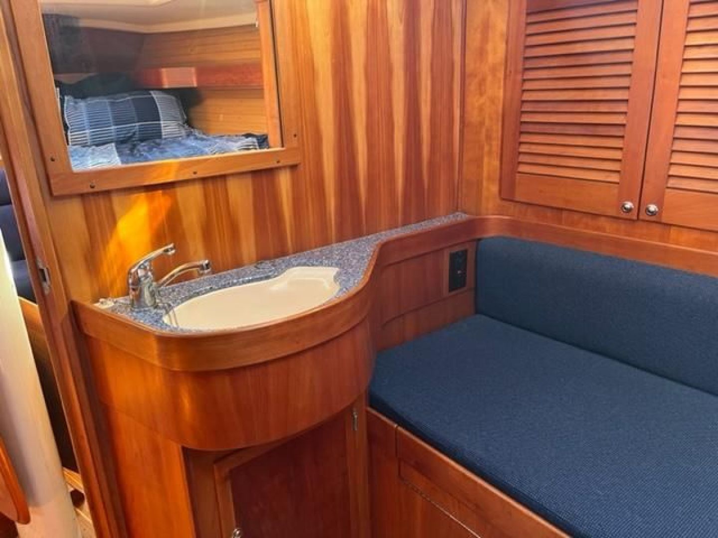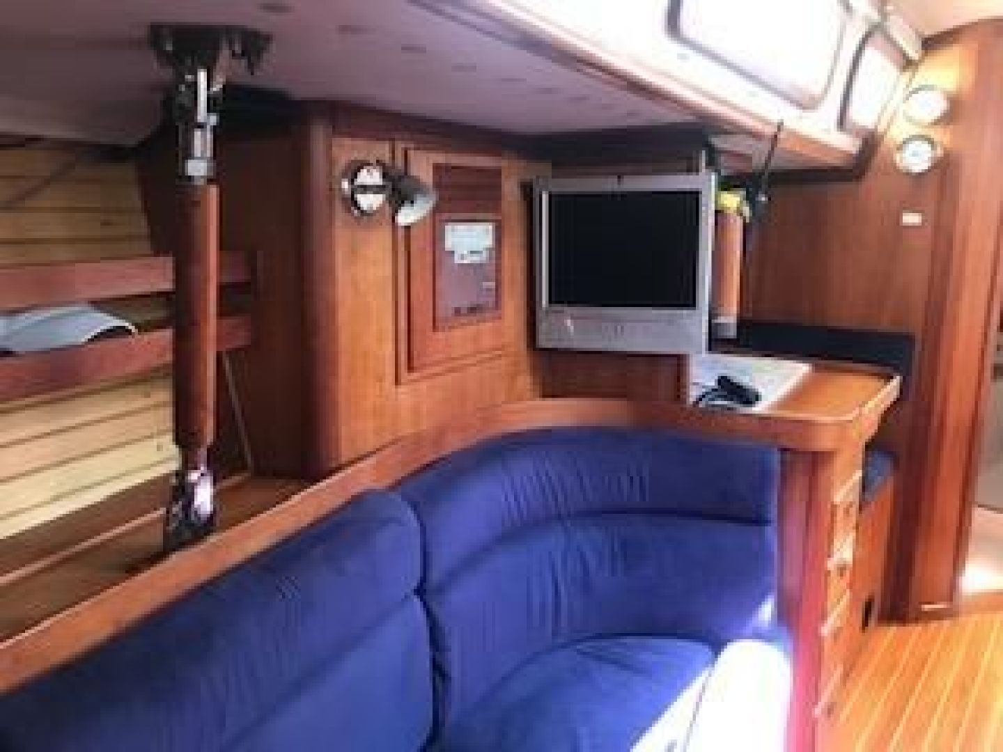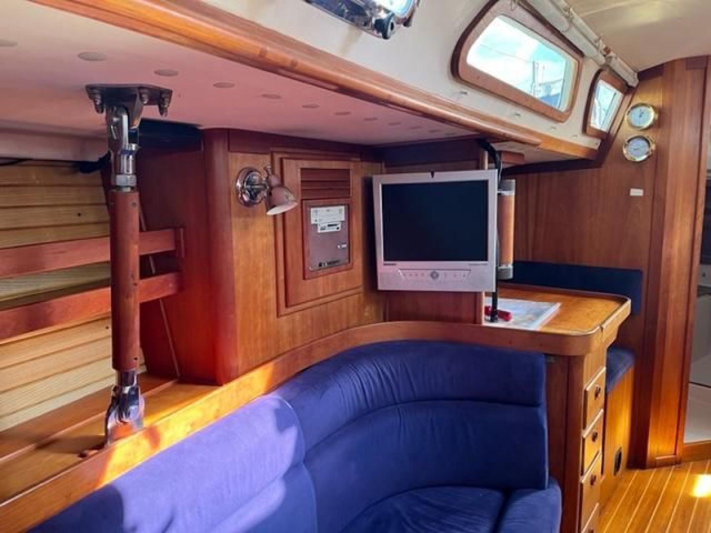 Double stateroom layout with varnished cherry interior and varnished teak and holly cabin sole. Natural light and ventilation are superb with 8 Lewmar aluminum hatches with screens and 8 polished stainless ports with screens, 4 fixed ports and 2 dorade vents. Excellent reading lamps at each berth and settee as well as several overhead dome style lamps. The upholstery is Ultra-suede, "Indigo" blue in the main salon and contrasting darker blue fabric "Ink" in the fore and aft staterooms.