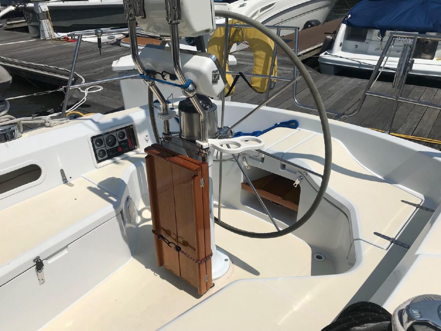 Feathering auto prop, accord shades on opening ports, cockpit cushions, electric main halyard winch, spinnaker gear w/ pole, Hall Quik vang, hydraulic backstay adjuster, 2 anchors, cockpit table, autopilot, custom winter cover, cockpit dodger with attachable sun awning, Seafrost engine drive refrigeration with shore assist, Rev.Cycle 16,000 btu AC and Heat,Tri-color strobe light on mast, H&C Transom Shower, Salt water washdown, Transom Boarding Ladder, Espar diesel heating system, 3 Hella cabin fans