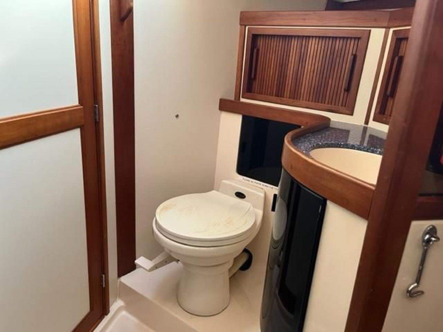 Starting forward is the forward stateroom with large V berth with large drawers and additional bin type storage underneath. Above the berth the hull is lined with cypress ceilings and fitted with a shelf and 2 lockers fwd. Aft and to port is a dressing seat. Outboard is a large locker and opposite is an ample cedar-lined hanging locker and additional storage. At the aft bulkhead is a small Corian vanity with Corian sink and polished stainless fixtures.