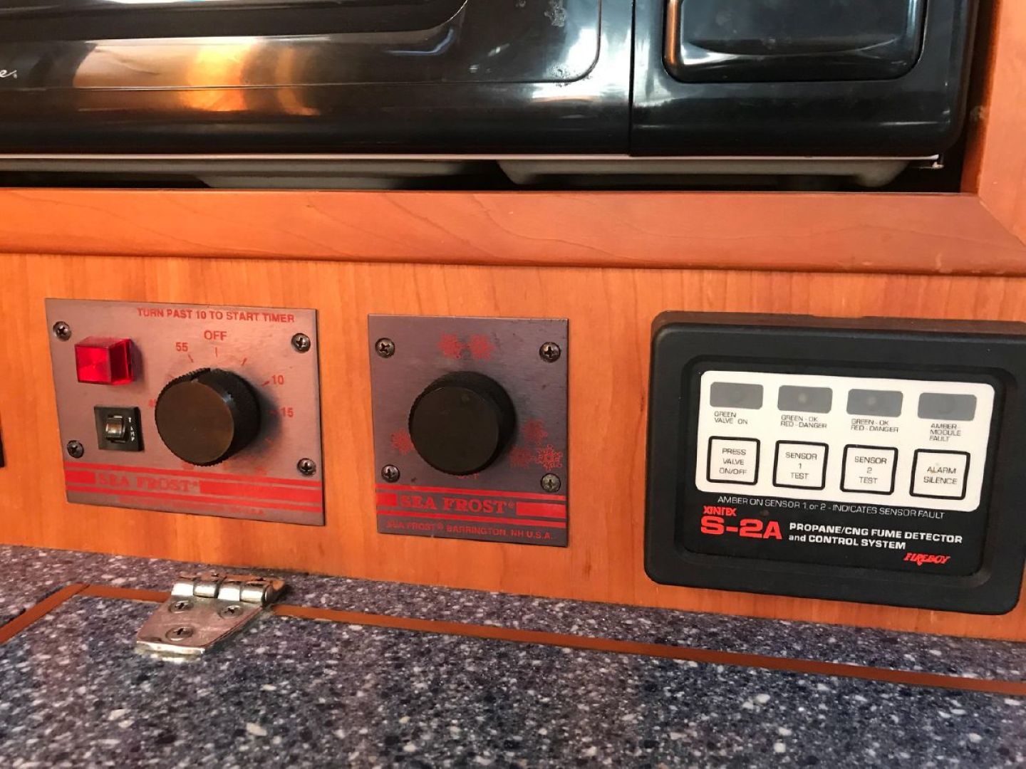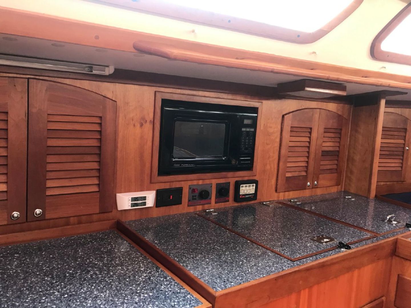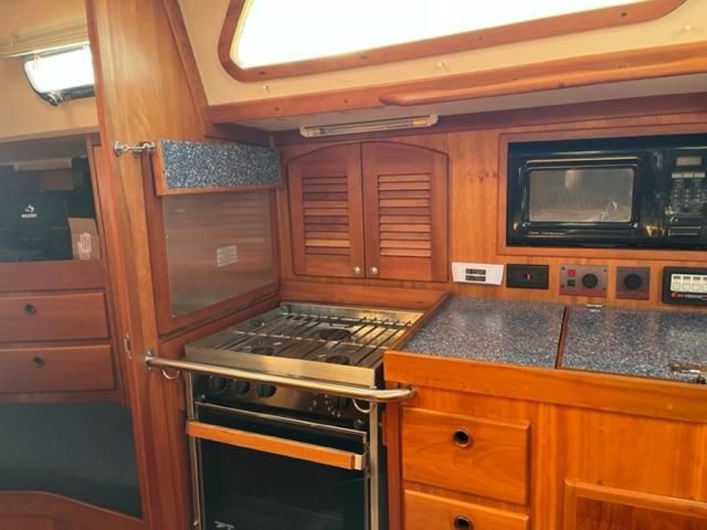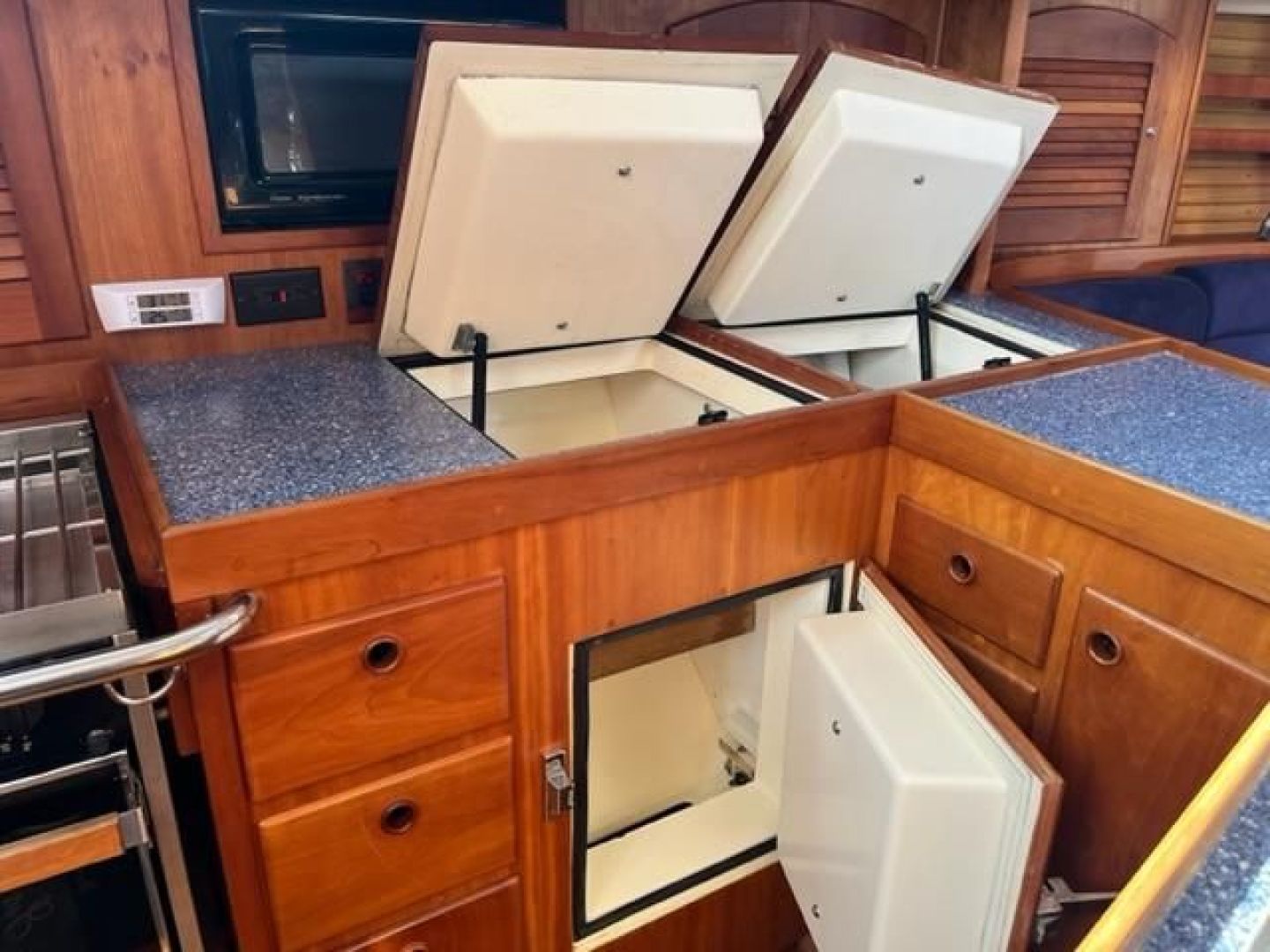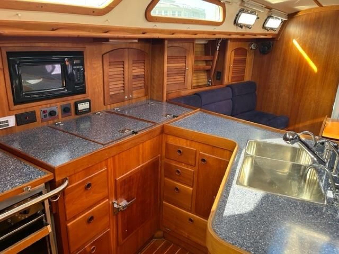 The Galley is U-shaped and very functional for meal preparation at sea. Storage and counter space are plentiful. Deep double stainless steel sinks with pressure Hot & Cold freshwater and a manual freshwater pump are located inboard on centerline while outboard is a three burner gimballed propane stove with oven fitted with a Xintex fume detector system and safety solenoid. There is a large top loading refrigerator and separate freezer boxes with Seafrost holding plates. There is also excellent storage in numerous lockers and drawers. Counter tops are Magna Mediterranean. (Blue color)