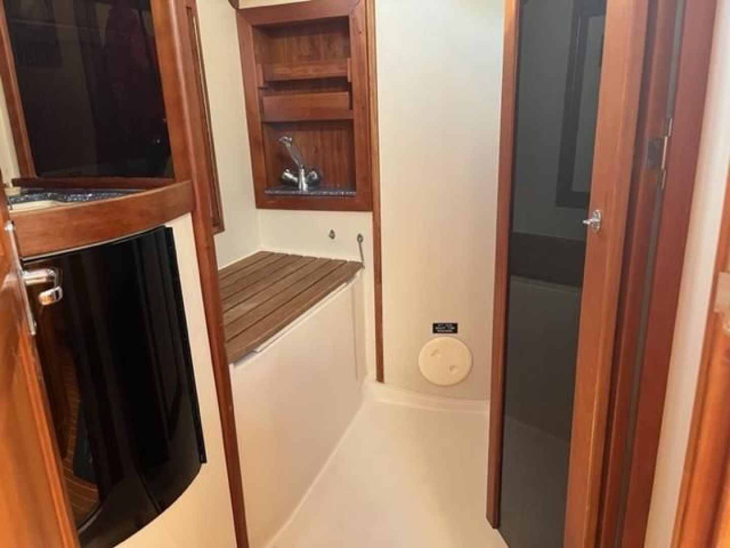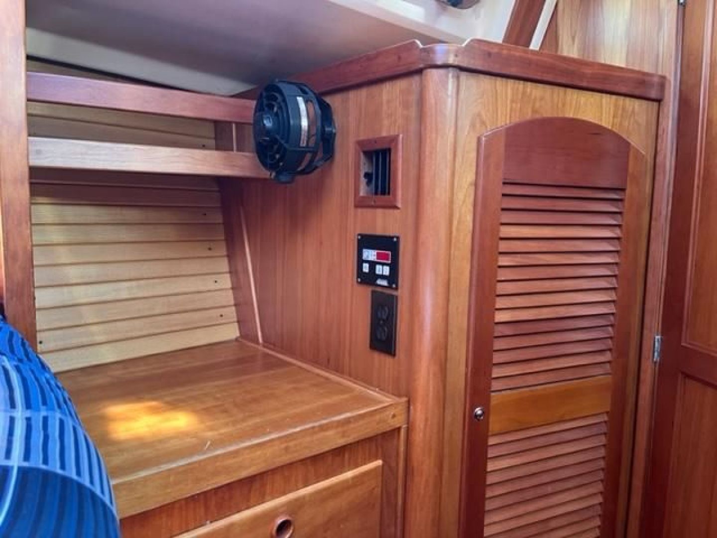 Aft of the galley to the port side is the aft stateroom entrance with private access to the aft head. The double berth is very large and has storage in drawers and bins underneath. The hull ceilings are also lined with Cypress battens and fitted with storage lockers. Forward of the berth is a bureau with 2 large drawers and an adjacent cedar-lined hanging locker. At the forward bulkhead is a cherry magazine/book rack.