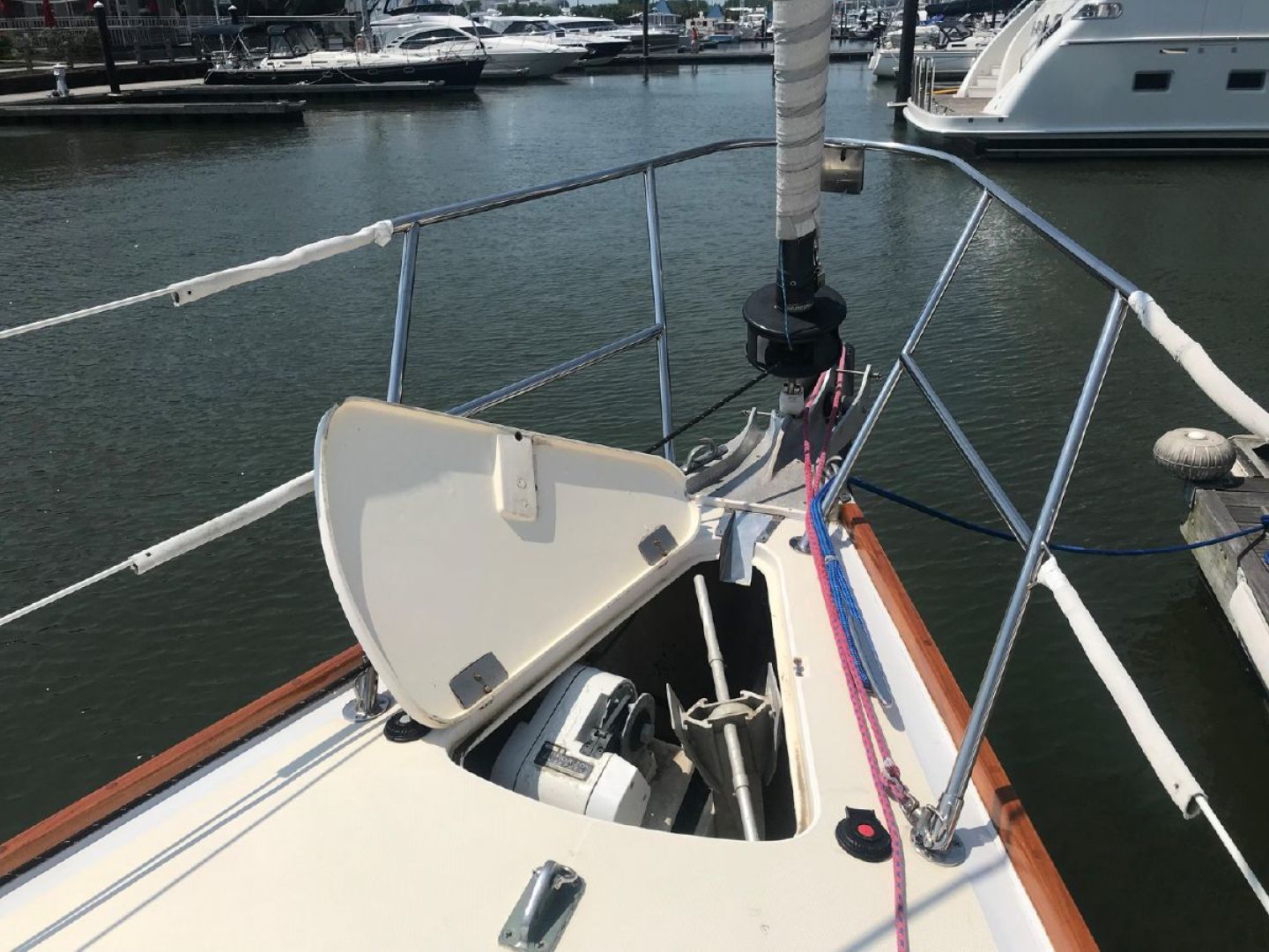 Awlgrip Flag Blue Hull with white boot stripe and gold cove stripe. Fresh varnish on all exterior teak
