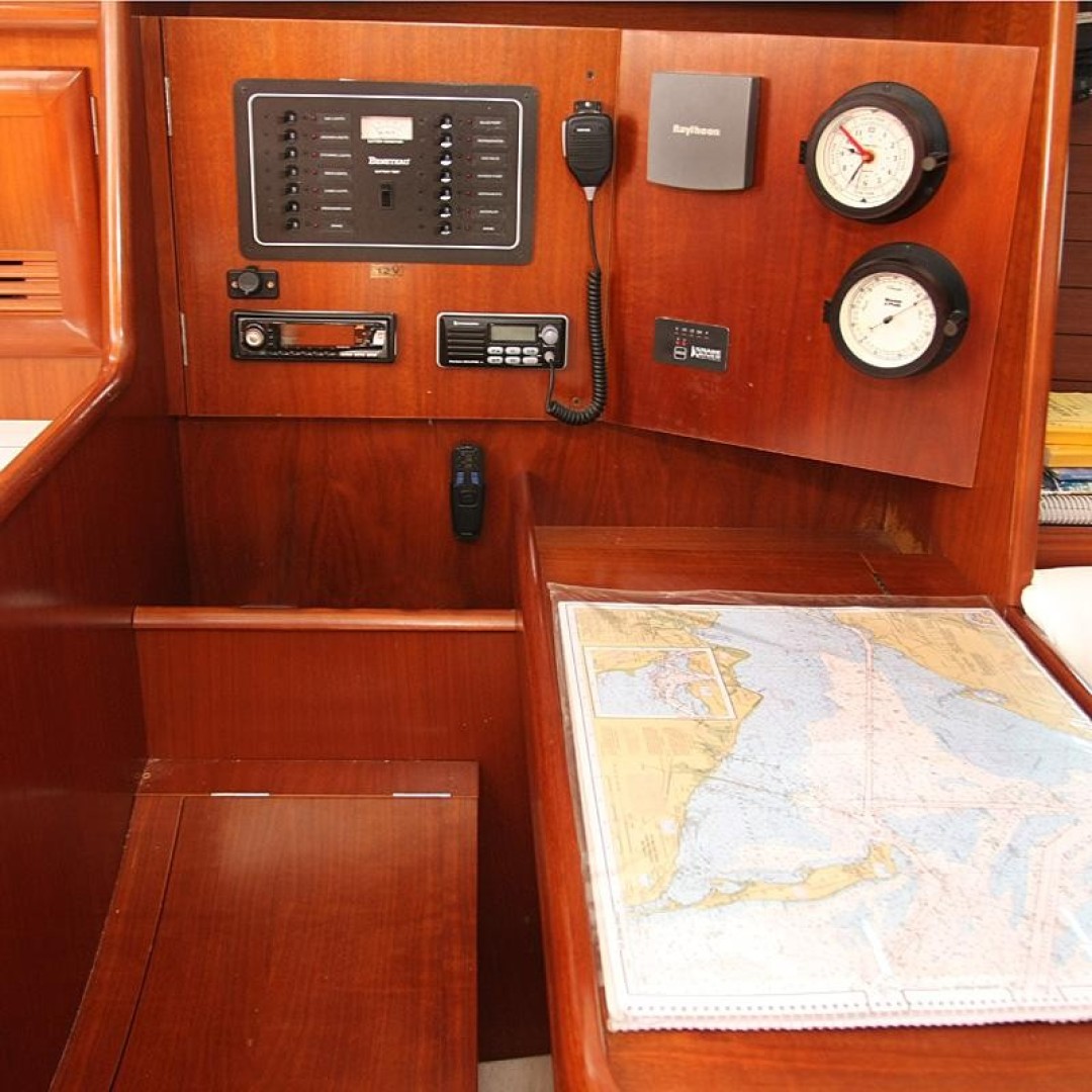 The spacious Main Salon features warm Cherry laminate and solid fiddles 6'4" headroom and opening ports. Convertible dinette to Starboard, large settee to Port. Forward facing Nav Station to Port aft of Settee.