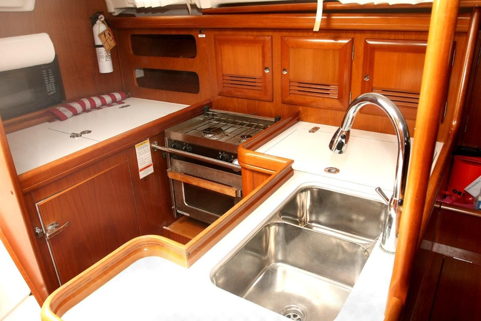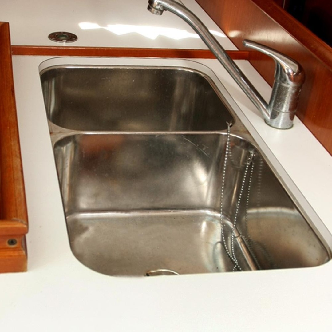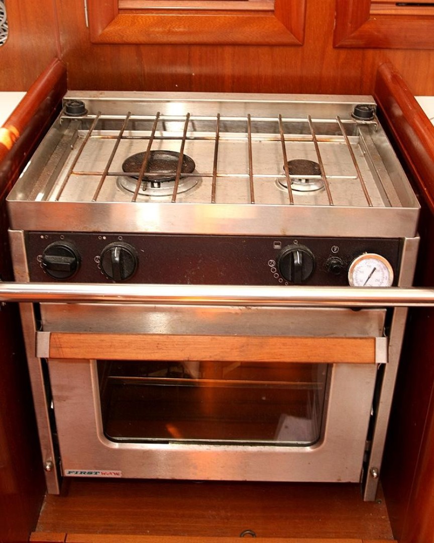 The Galley is to port at the bottom of the companion way. Hot and cold pressure water, with a Double Stainless Sink, Gimbaled 2 Burner Propane Stove with Oven, Large Top loading Freezer, Large Adler Barbour Front loading Refrigerator. GE Microwave and lots of storage space.