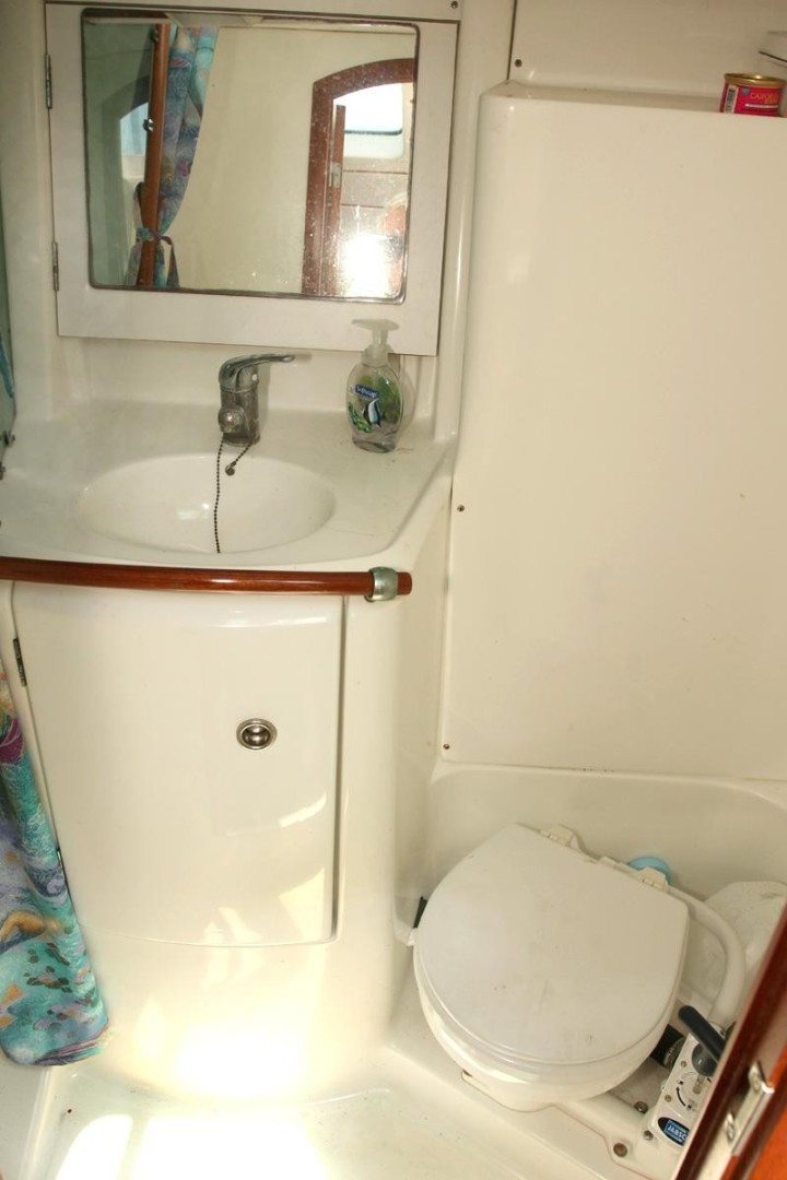The Head is located to starboard at the bottom of the companionway . Sink, vanity, Medicine Cabinet , Storage. opening port, Head w/ holding tank w/guage macerator pump, Y Valve. Enclosed Shower with seat, sump pump .