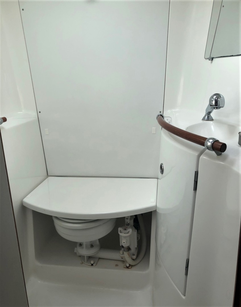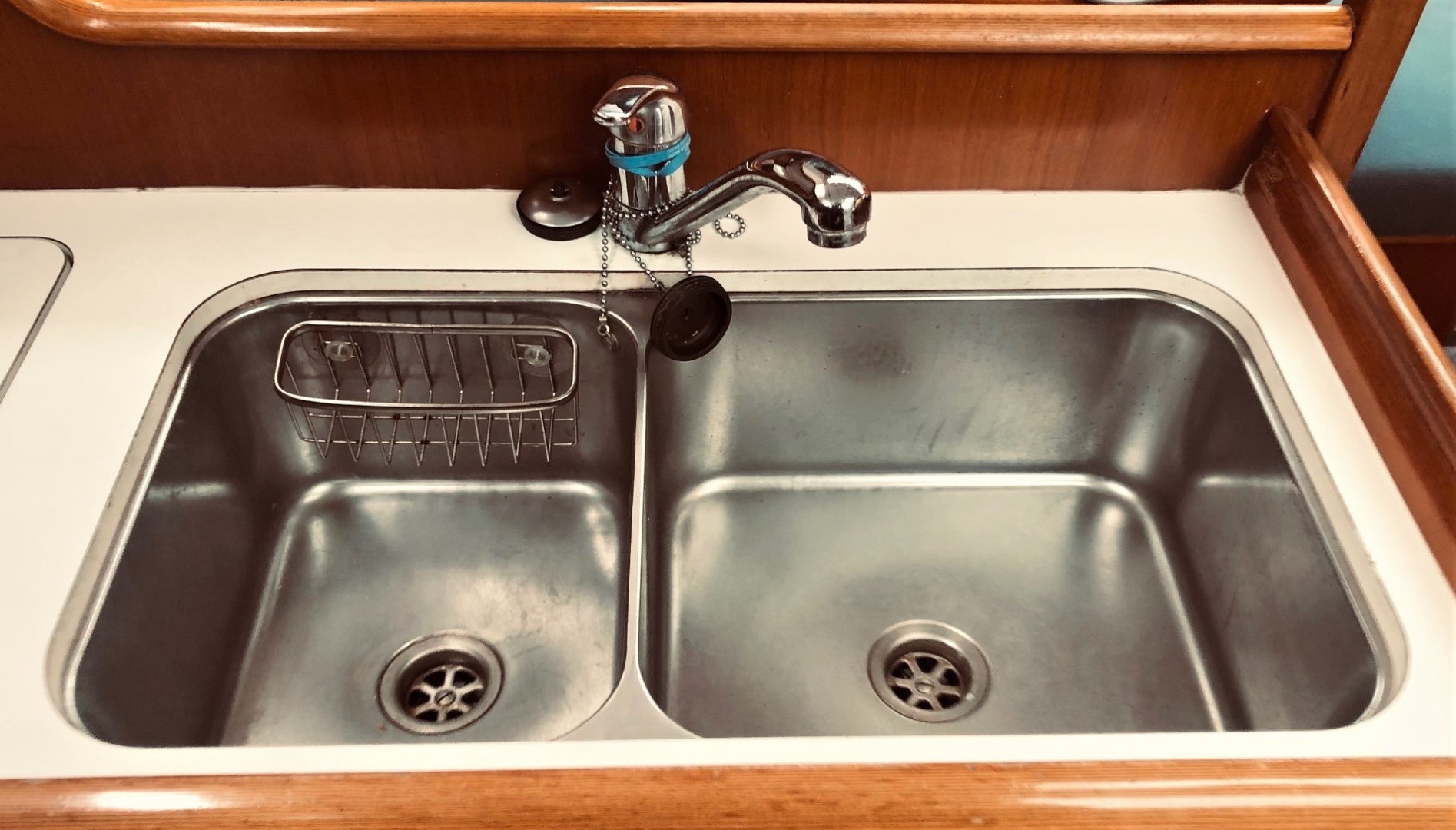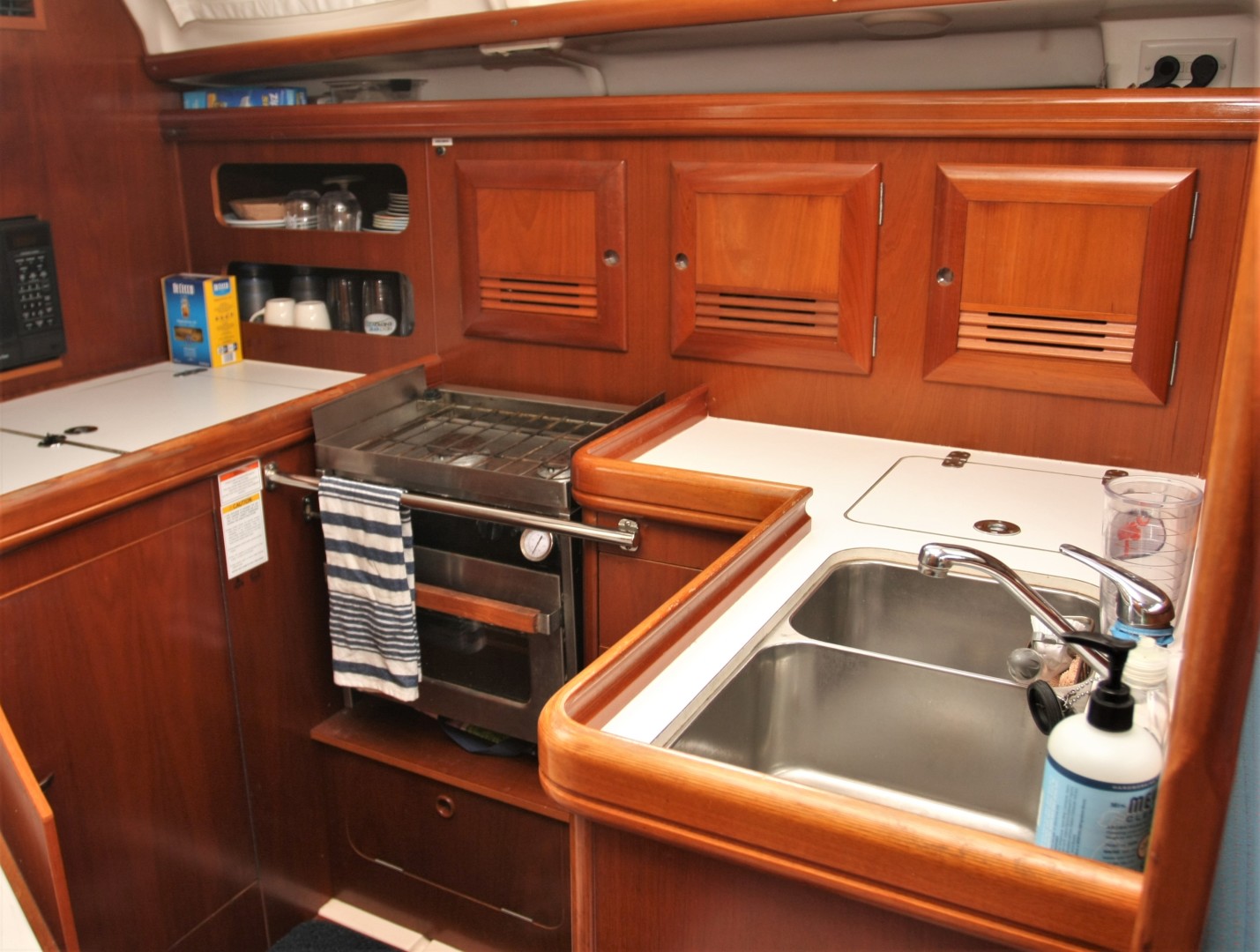 - The U-shaped galley is found in the port aft corner and is conveniently located adjacent to the companionway stairs and also open to the main salon without being in the way. The galley features a two burner Force 10 stainless steel propane stove with oven, Microwave, 12v under-counter refrigerator and top-load freezer, polished stainless steel double basin sink and large storage areas ,counter space and cutlery drawer. The aft head is across from the galley and the large second private double stateroom entrance is is aft to stbd.