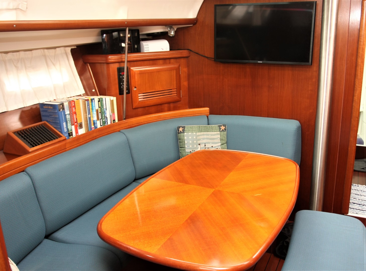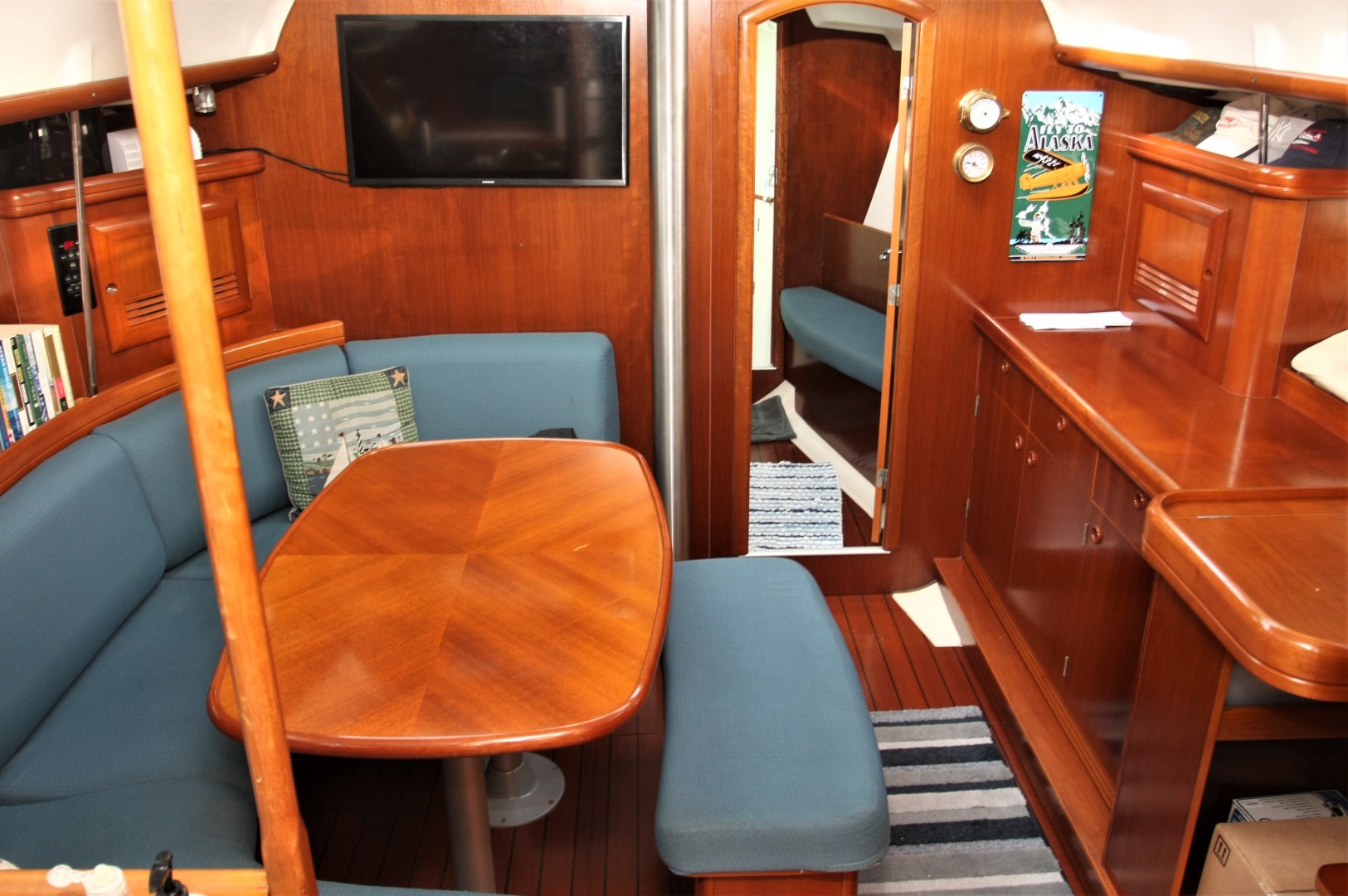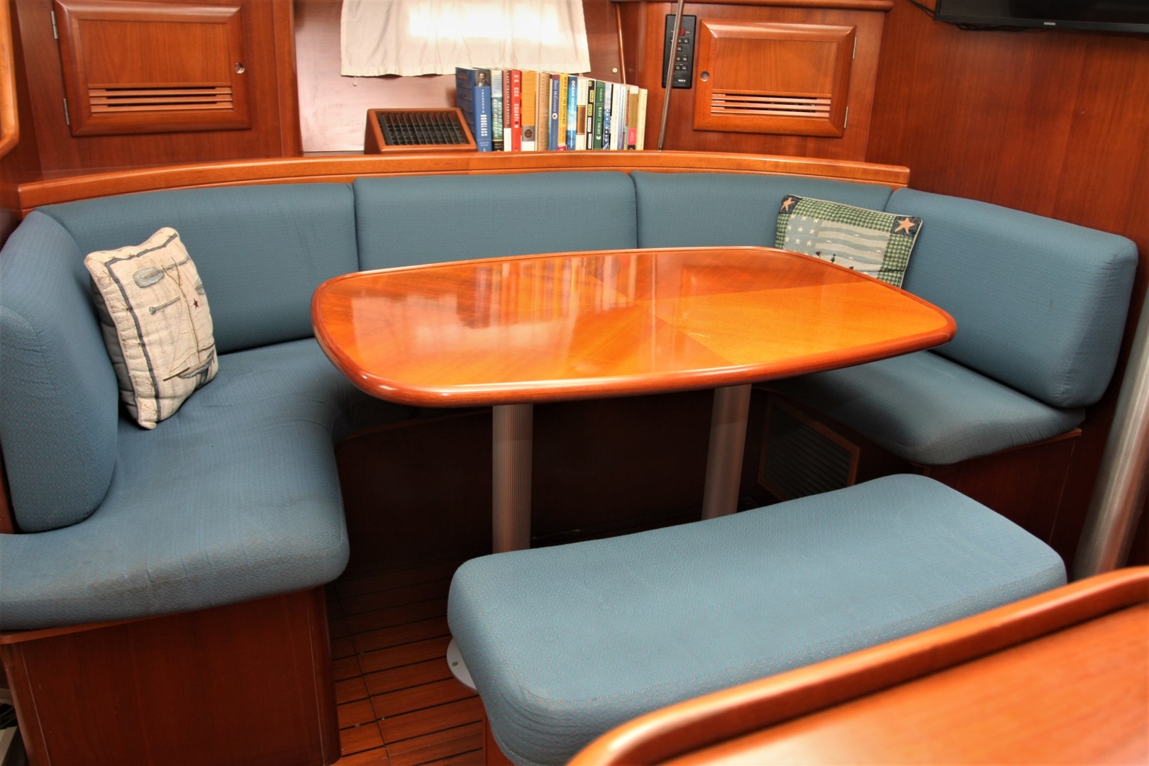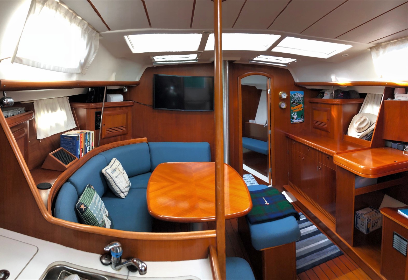 - The interior features a bright and open layout with warm varnished teak throughout. All the way forward is a private head with shower, sink and vanity followed aft by a double pullman berth to port and a settee and hanging locker to starboard. Next is the large main salon with plenty of headroom and light. The main salon dinette is to port with surround seating and a drop leaf table that can serve as a double berth to sleep a total of eight comfortably. To starboard is an extremely large storage area with lockers with warm teak finish. Moving aft on the starboard side is the forward-facing nav station with storage under the curved seat.