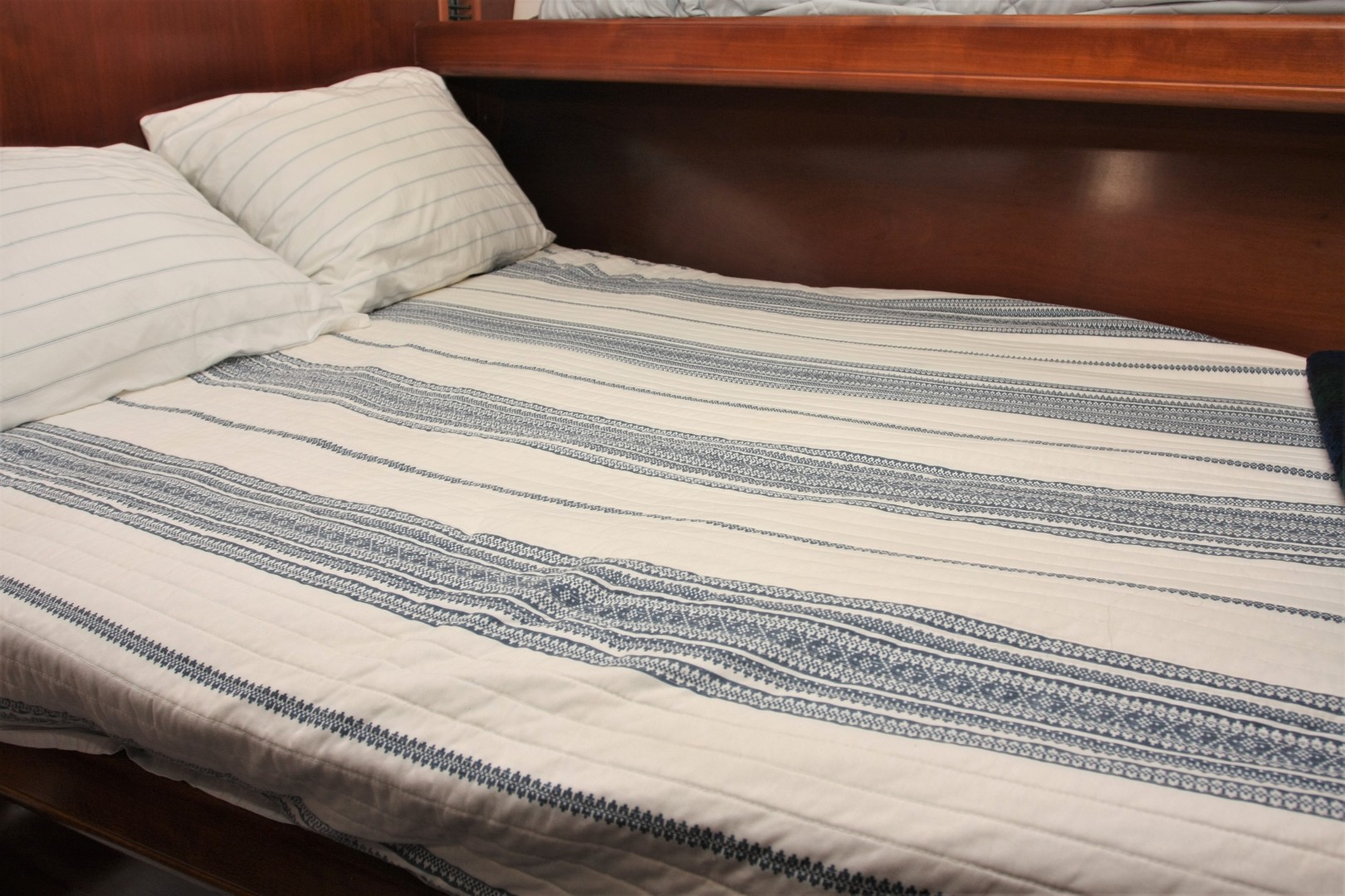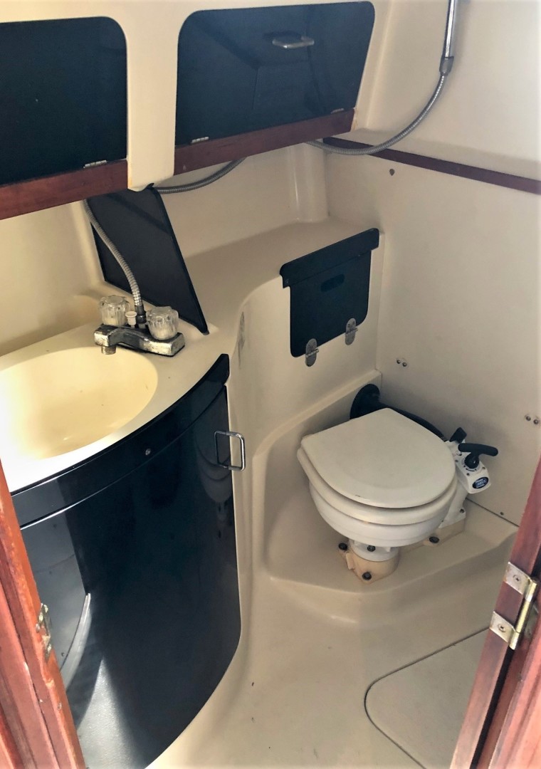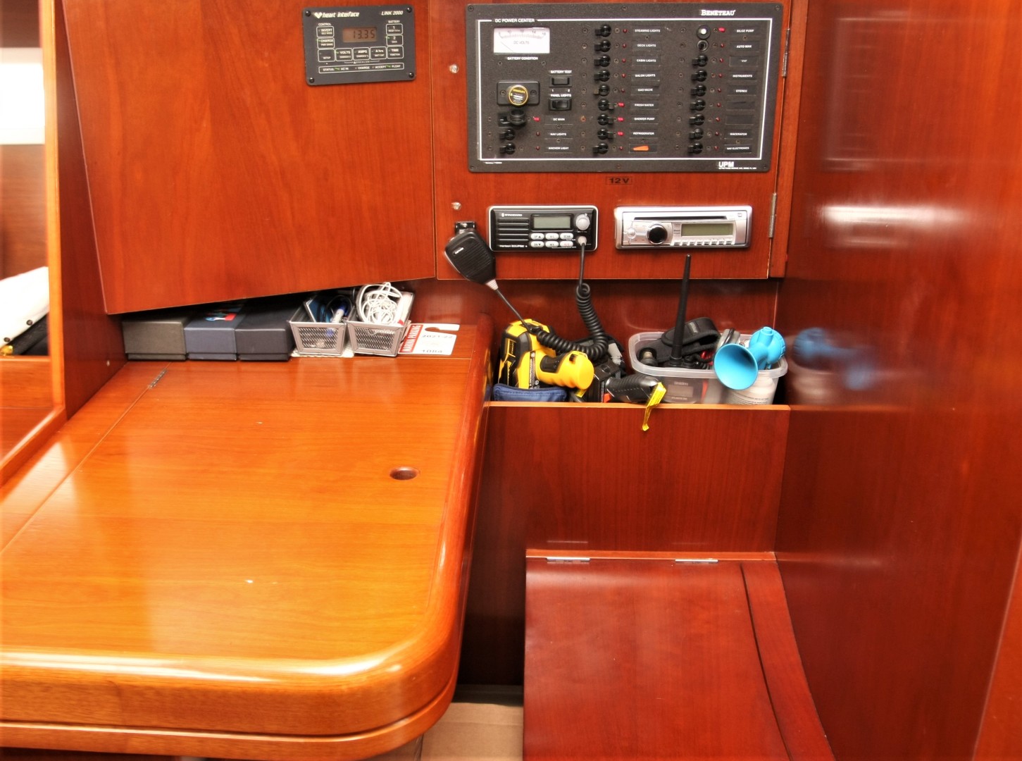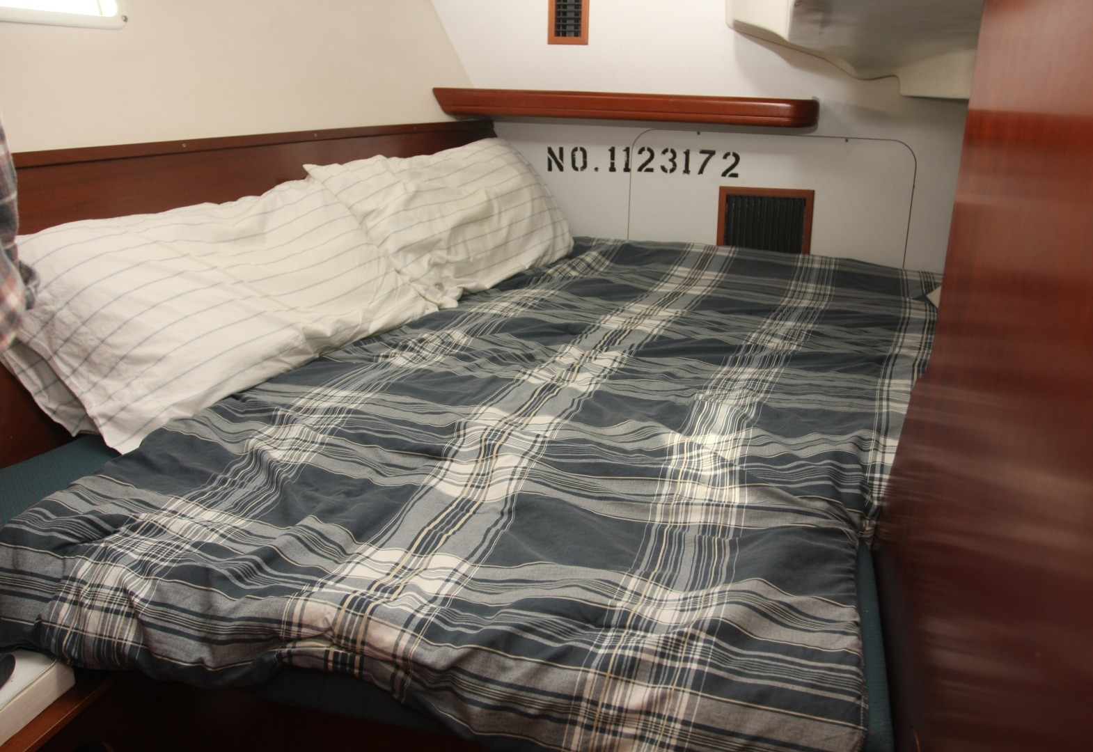 - The interior features a bright and open layout with warm varnished teak throughout. All the way forward is a private head with shower, sink and vanity followed aft by a double pullman berth to port and a settee and hanging locker to starboard. Next is the large main salon with plenty of headroom and light. The main salon dinette is to port with surround seating and a drop leaf table that can serve as a double berth to sleep a total of eight comfortably. To starboard is an extremely large storage area with lockers with warm teak finish. Moving aft on the starboard side is the forward-facing nav station with storage under the curved seat.