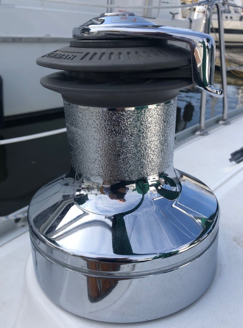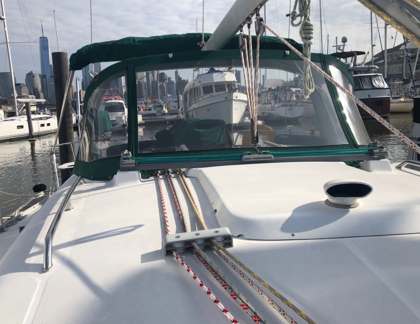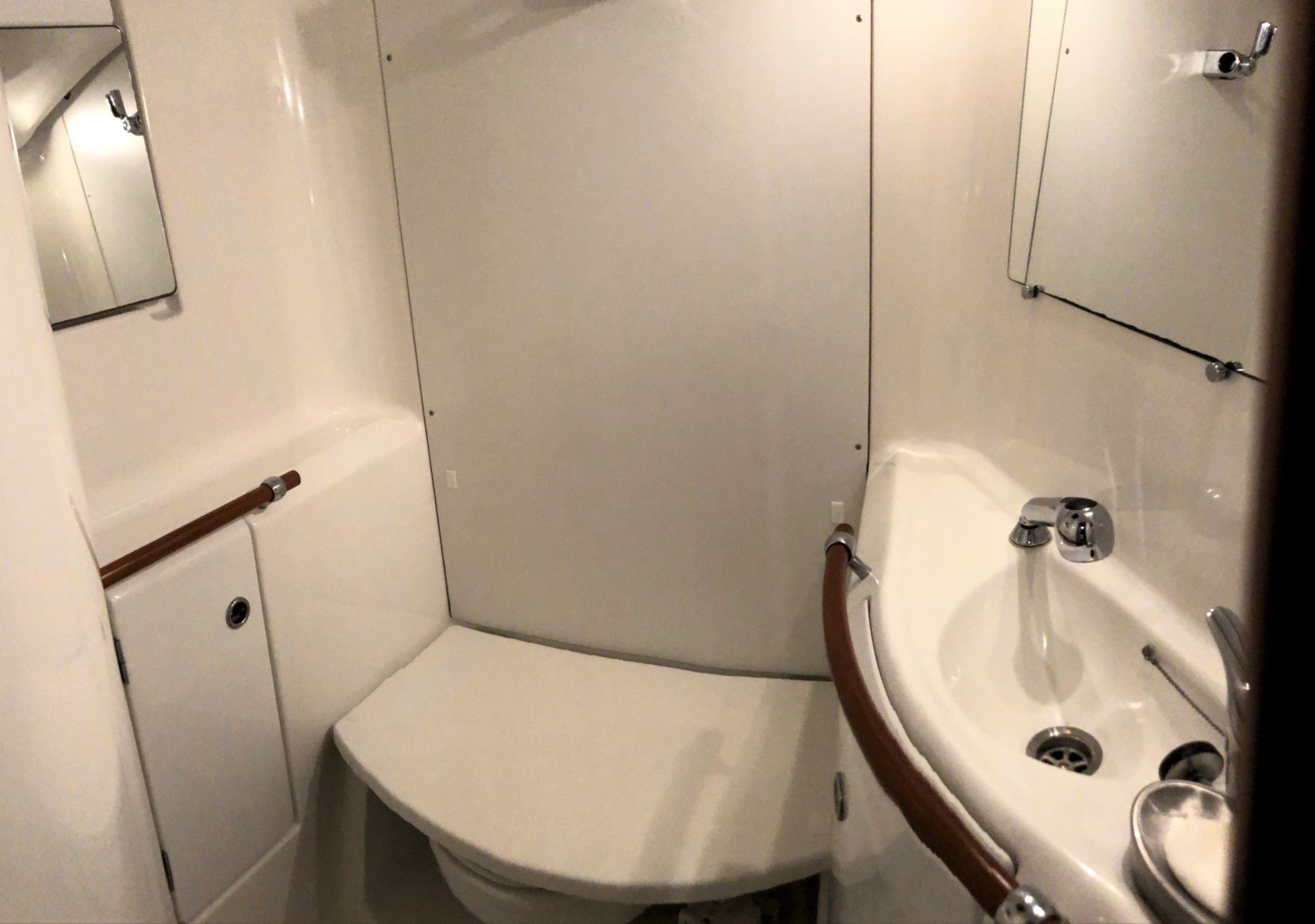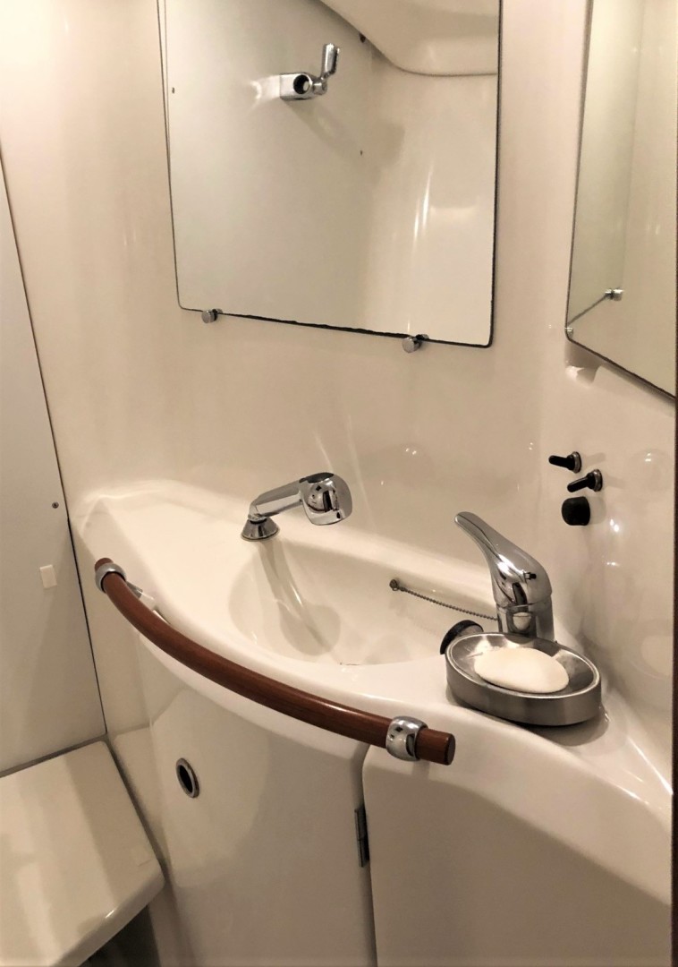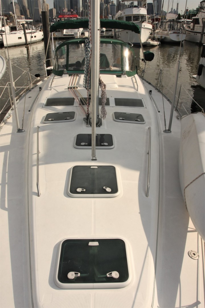 - The interior features a bright and open layout with warm varnished teak throughout. All the way forward is a private head with shower, sink and vanity followed aft by a double pullman berth to port and a settee and hanging locker to starboard. Next is the large main salon with plenty of headroom and light. The main salon dinette is to port with surround seating and a drop leaf table that can serve as a double berth to sleep a total of eight comfortably. To starboard is an extremely large storage area with lockers with warm teak finish. Moving aft on the starboard side is the forward-facing nav station with storage under the curved seat.
