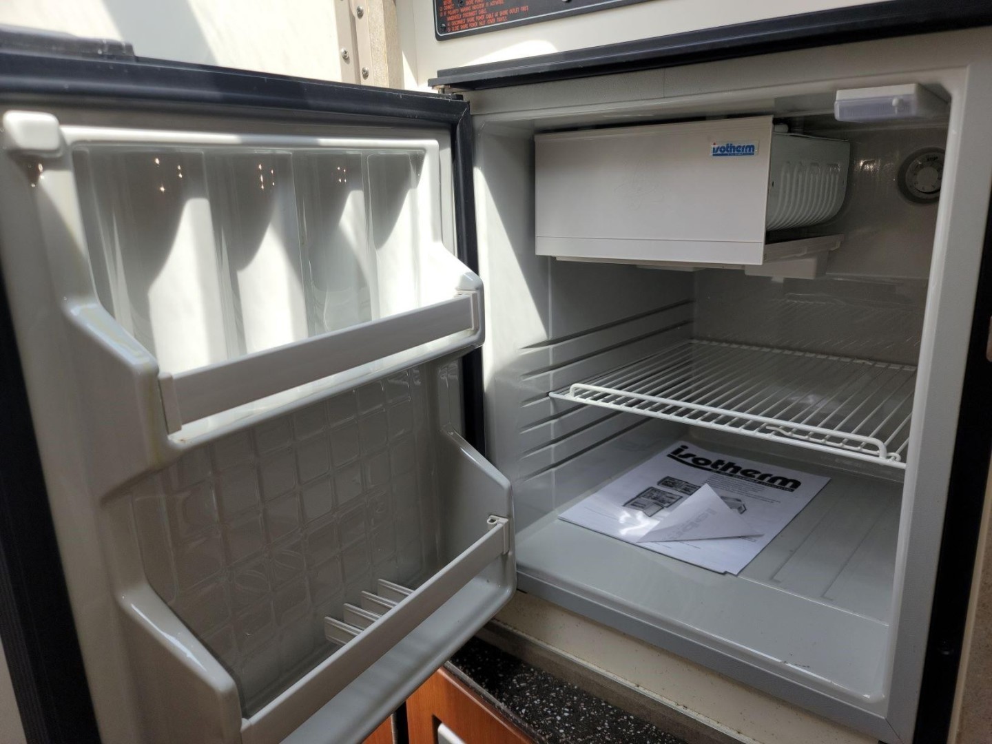 Cockpit galley with integrated sink, corian countertops, refrigerator