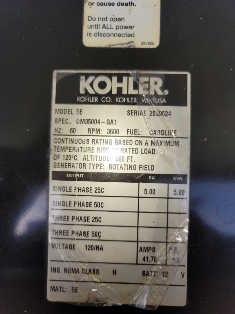 Kohler 5.0 KW Gas Generator with 13.5 hours