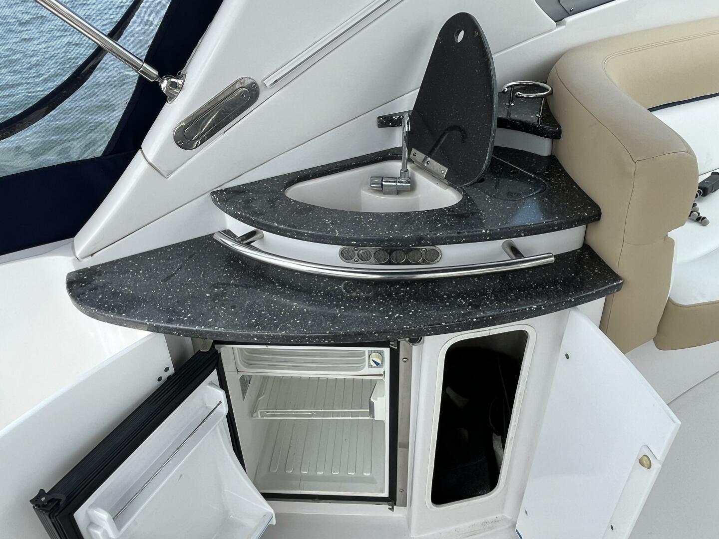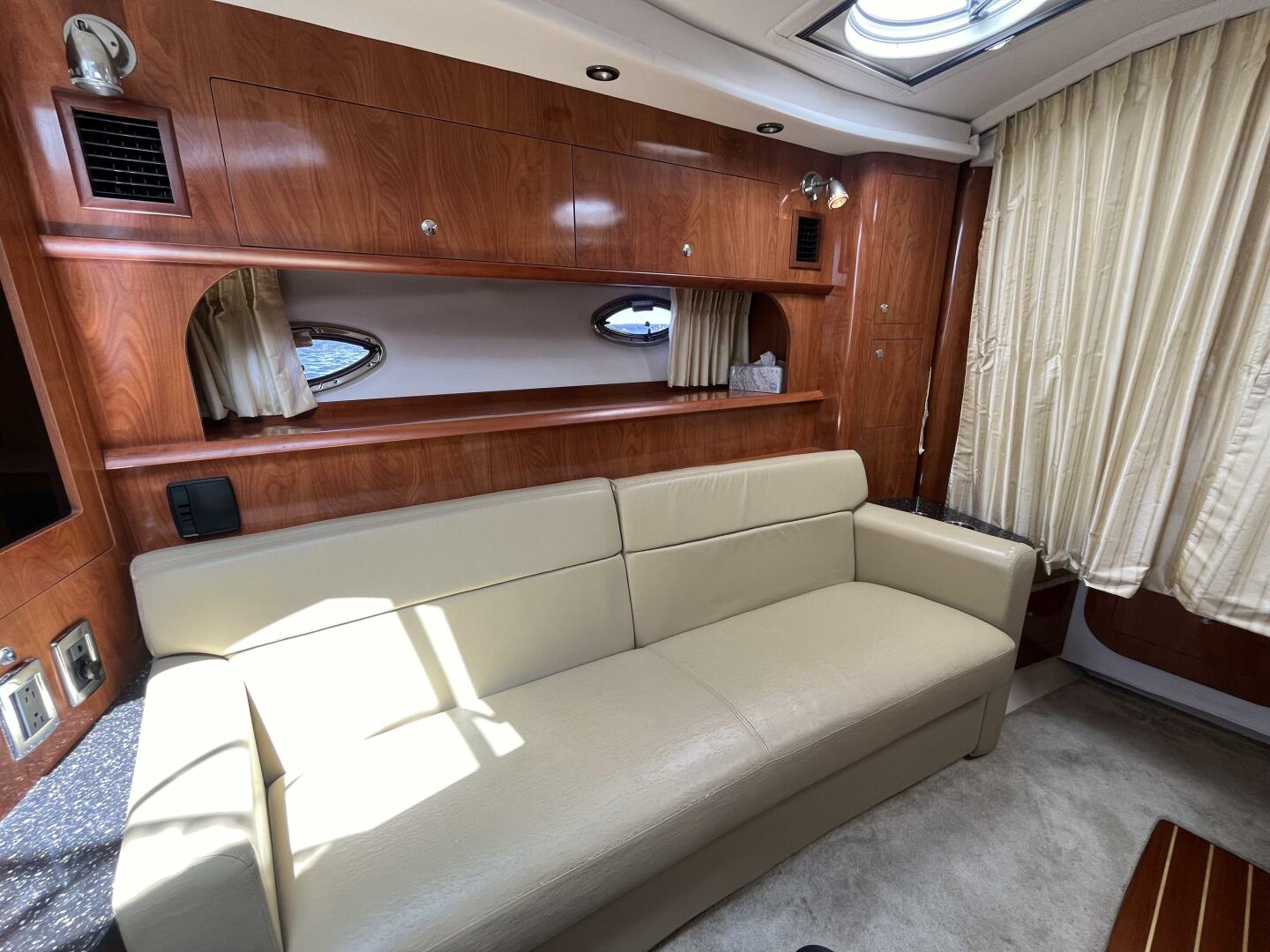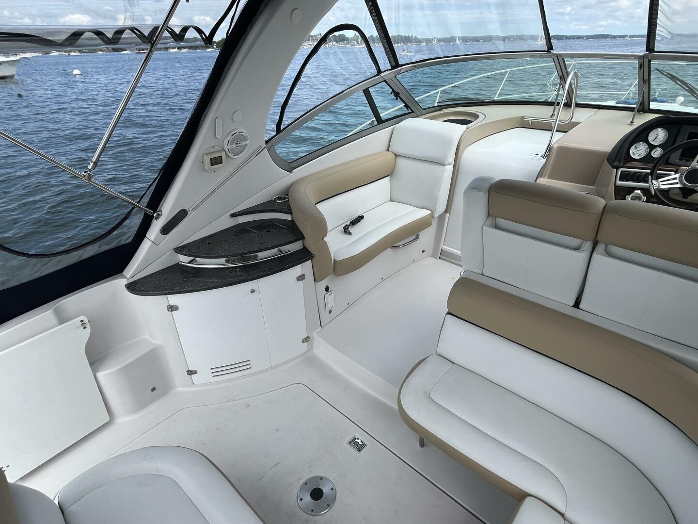 One enters the boat from the swim platform into a comfortable cockpit and "refreshment center". This area features a comfortable u-shaped settee, a removable teak table and a flat screen TV. The settee has a fill-in cushion which will convert it to a day-be or outdoor sleeting.