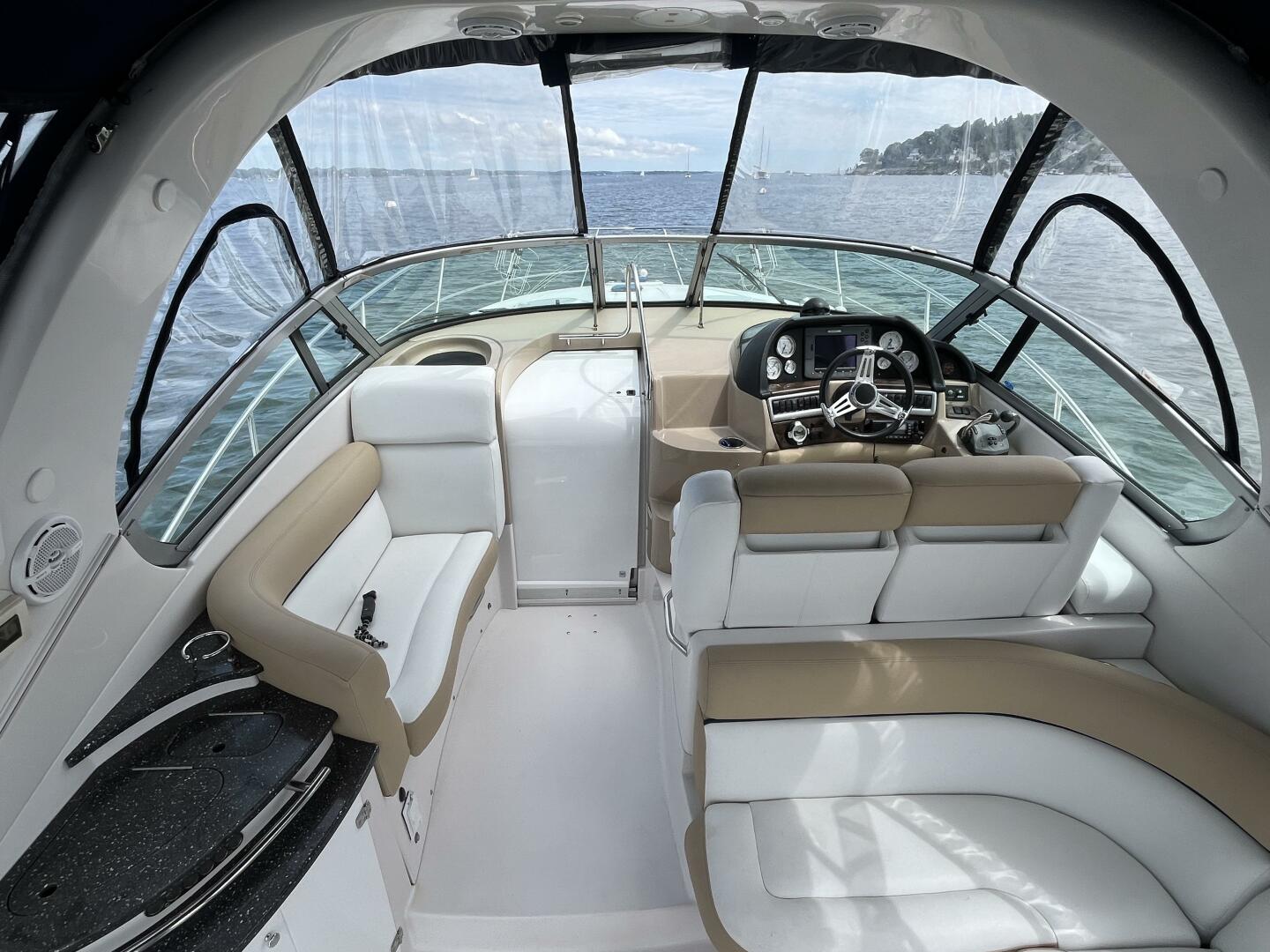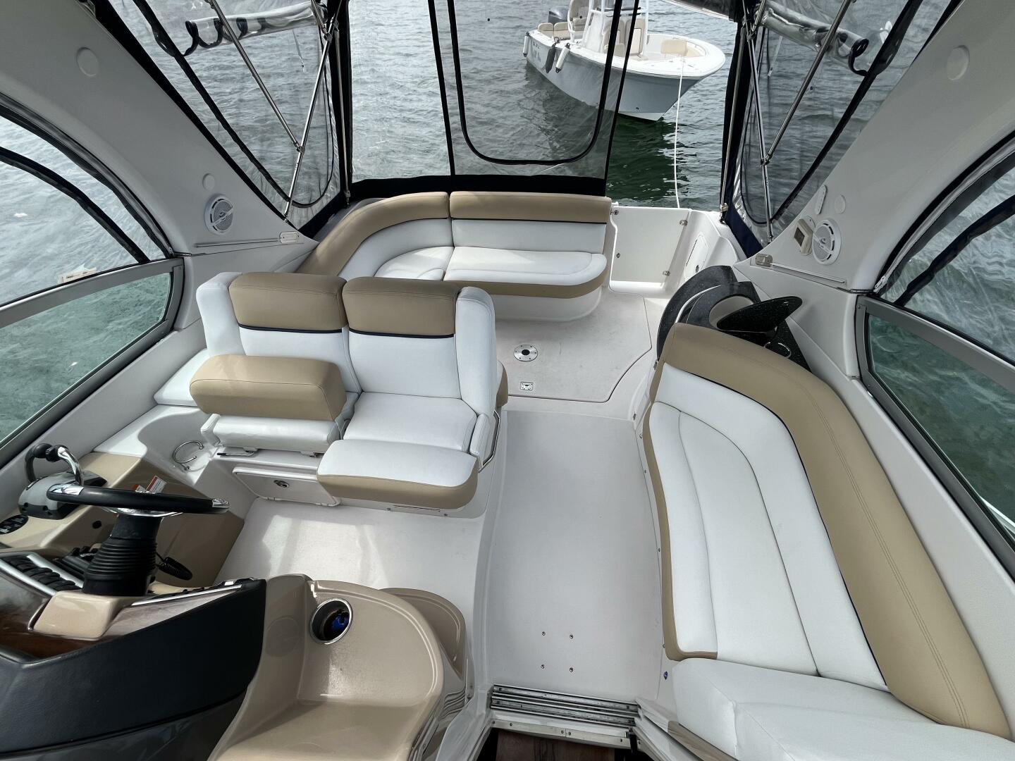 The entire cockpit / refreshment center / helm station is enclosed with a brand new canvas enclosure with side and rear curtains that can be rolled up creating a full screened-in setting.