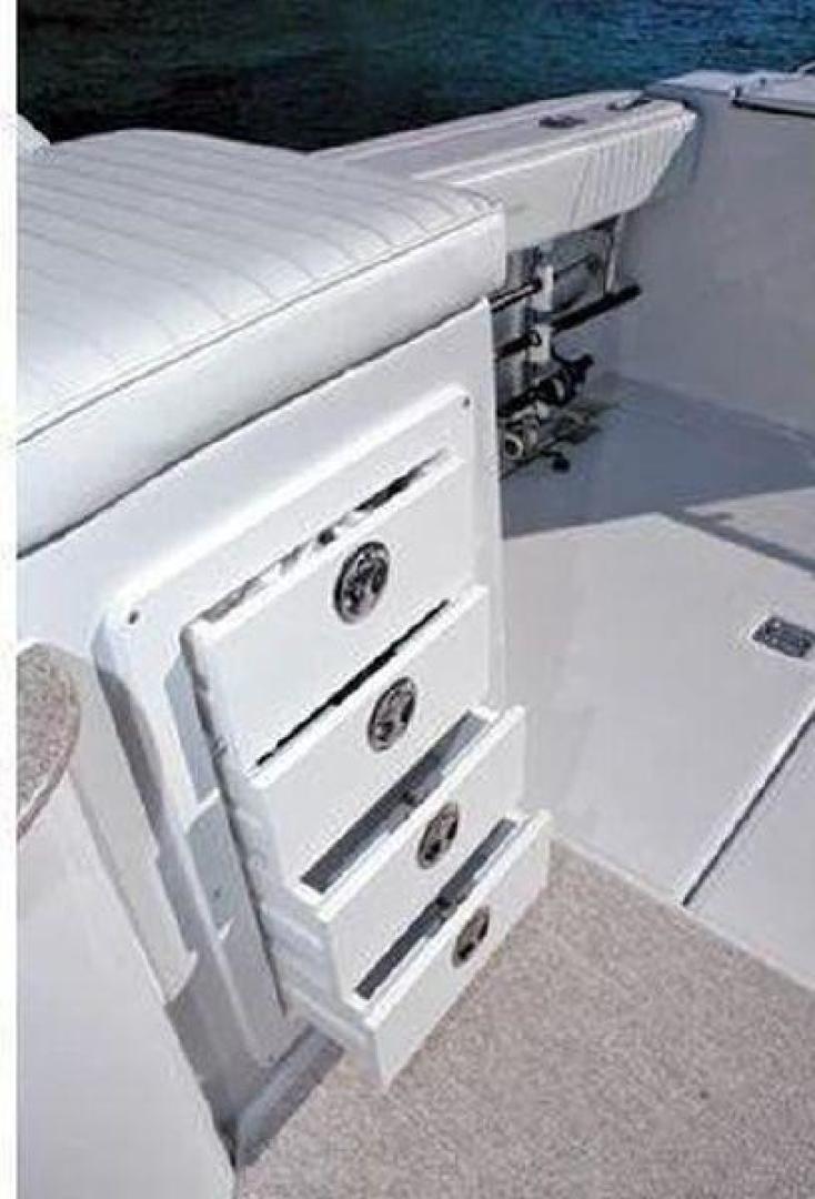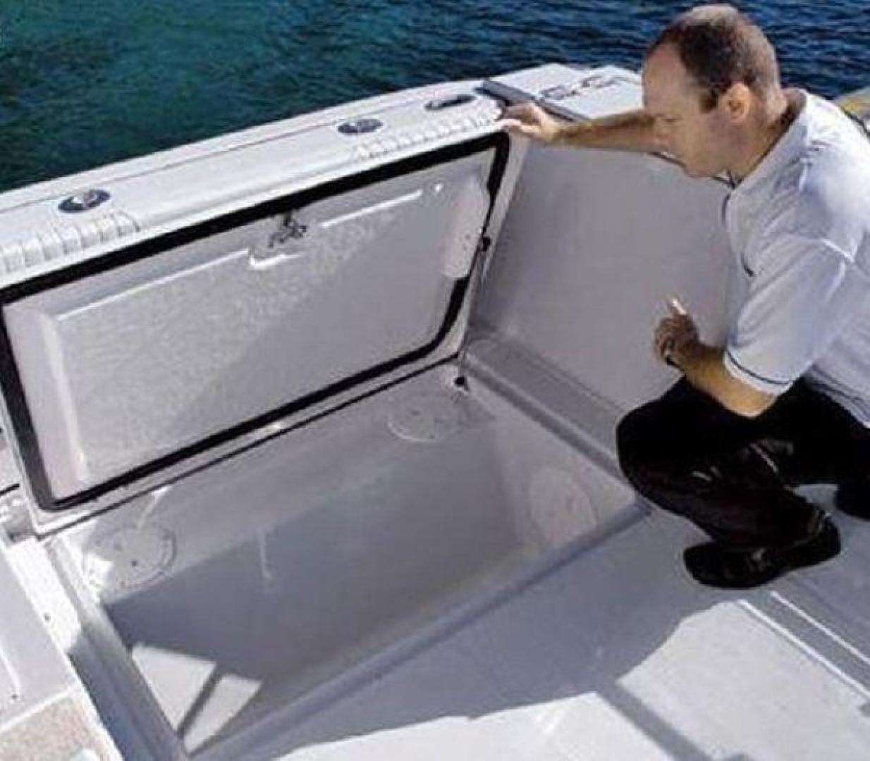 The large, open, aft cockpit is a good hint this boat has been built for fishing, a feeling reinforced by the long rod rack (holds 6 rods), padded inner combings, two insulated in-deck fish wells, saltwater deck wash-down, rocket launchers and a 140L bait tank.