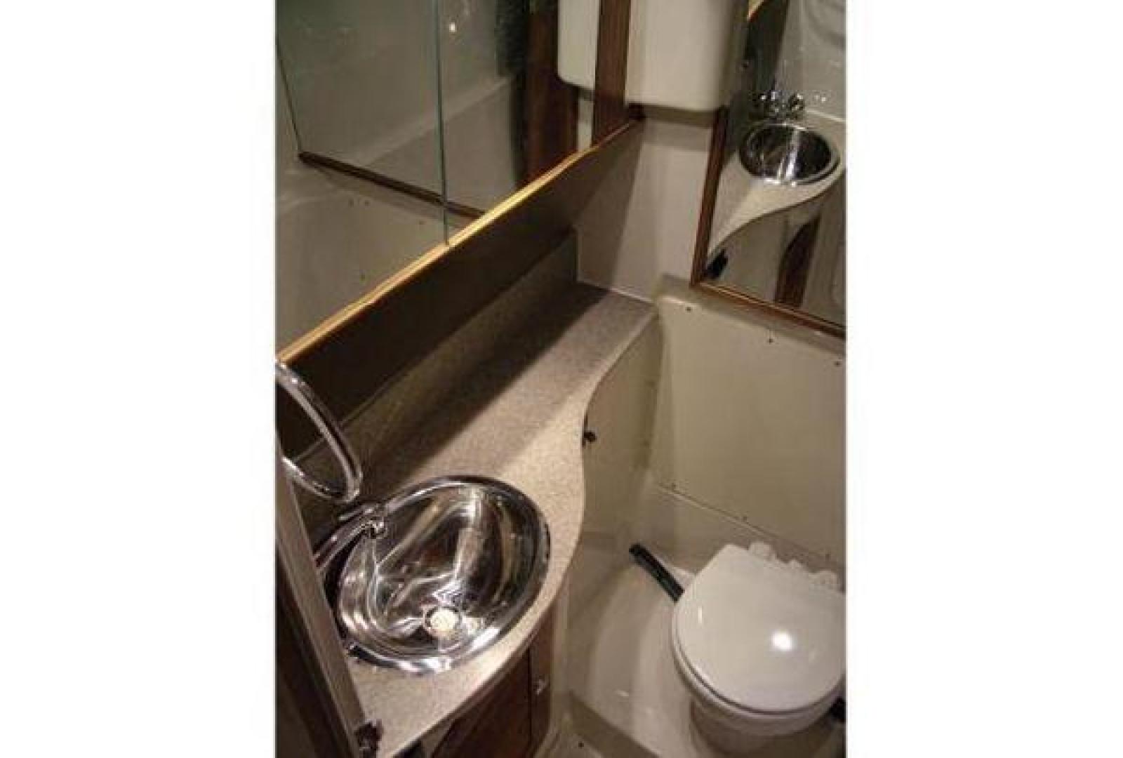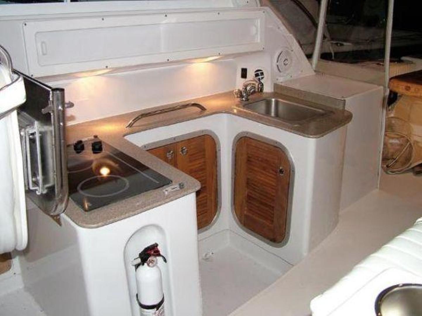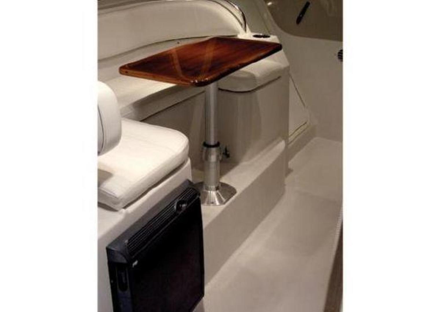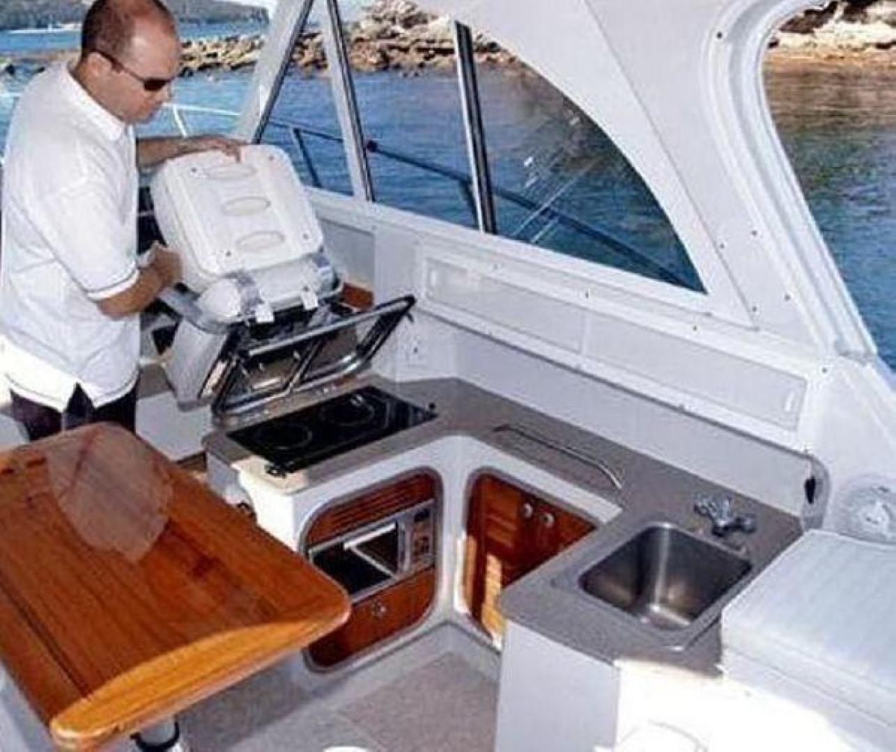 Below decks, the 3080 features a well-equipped galley with Corian counter tops, sink, stove, fridge and microwave. There is a forward ‘king-size’ berth and a separate head with shower (hot and cold). These areas are well finished and accessed via port side steps across from the helm. The vessel layout focuses on outdoors with an upmarket wet bar servicing the curvaceous settee with timber table. The helm seat folds forward to reveal a cooktop that converts the wet bar into a complete indoor/outdoor galley.