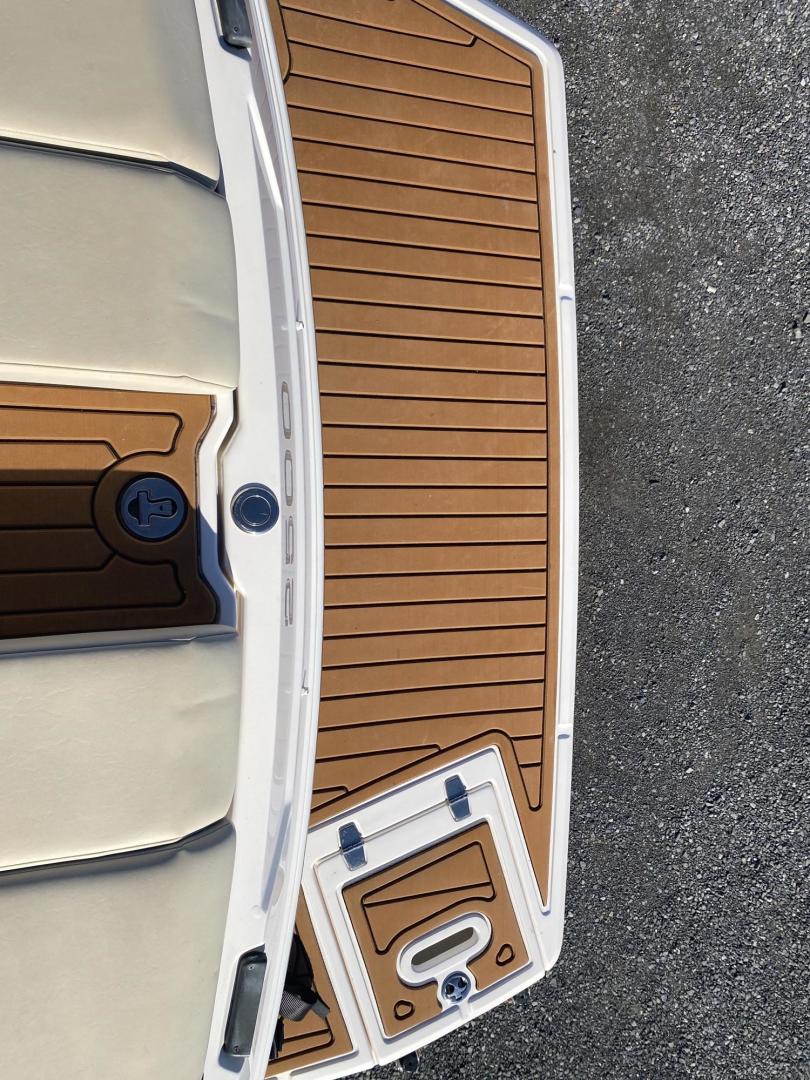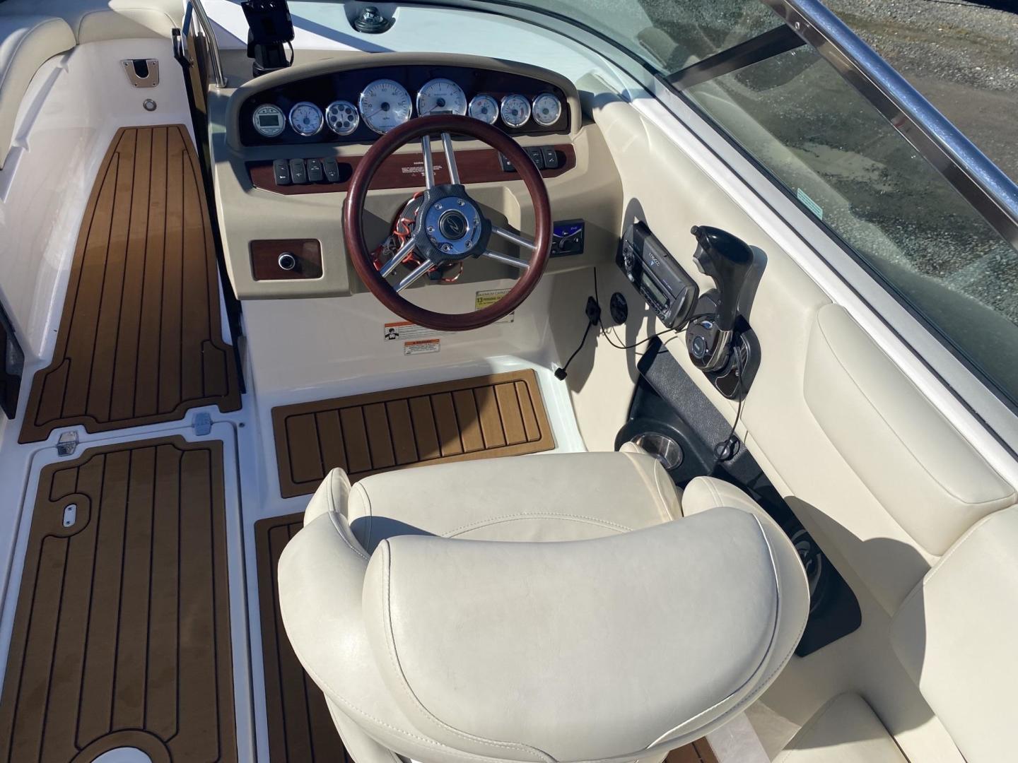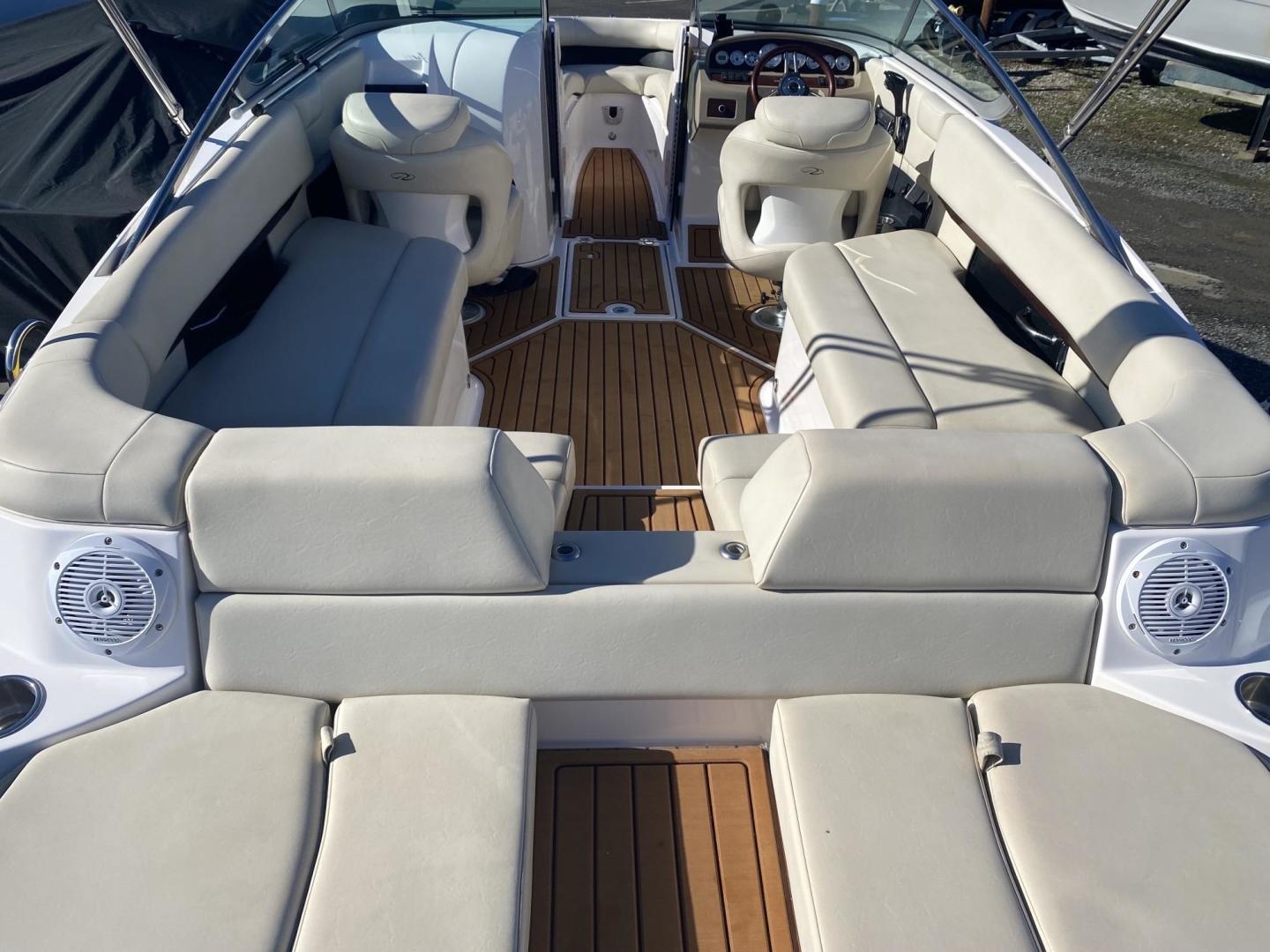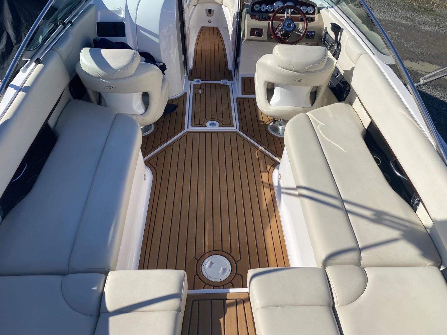 By maximizing the wetted surface and getting every square inch out of its interior, the 2500 FasTrac runs like a boat two feet shorter underneath and two feet longer inside. Based on Regal's award-winning FasTrac hull, the 2500 gets families where they want to go, quicker, faster and with better fuel economy than other boats its size. The 2500's full-beam step breaks up surface tension when at speed, sending an army of air under the aft one-third of the hull. While its standard, torque- filled 5.0 L powerplant will push your back against the seat, adding an optional 8.1 will push 60 mph -- and push back your eyelids. For a touch as responsive as the ride, Volvo's EVC (electronic vessel control) or MerCruiser's DTS (digital throttle and shift) upgrades are a must. What those eyes will see is an eloquent combination of champagne, slate or white mildew-resistant, foam-backed vinyl. While easy on the eyes, the interior is even easier on backsides. Contoured bow seats, adjustable armrests and full-length, uninterrupted coaming panels provide bow riders with comfy cushions. A second glance reveals the mahogany strip accents and stitched vinyl coaming panels, pairing comfort with class. In the massive cockpit, there are plenty of spots to claim, including two fully-swiveling captain's buckets and elongated benches on either side, which open on gas-assist struts to reveal cavernous storage compartments. Detailed accents extend into the head compartment, with a standard Corian countertop vanity, cabinetry storage and Flexiteek floor.