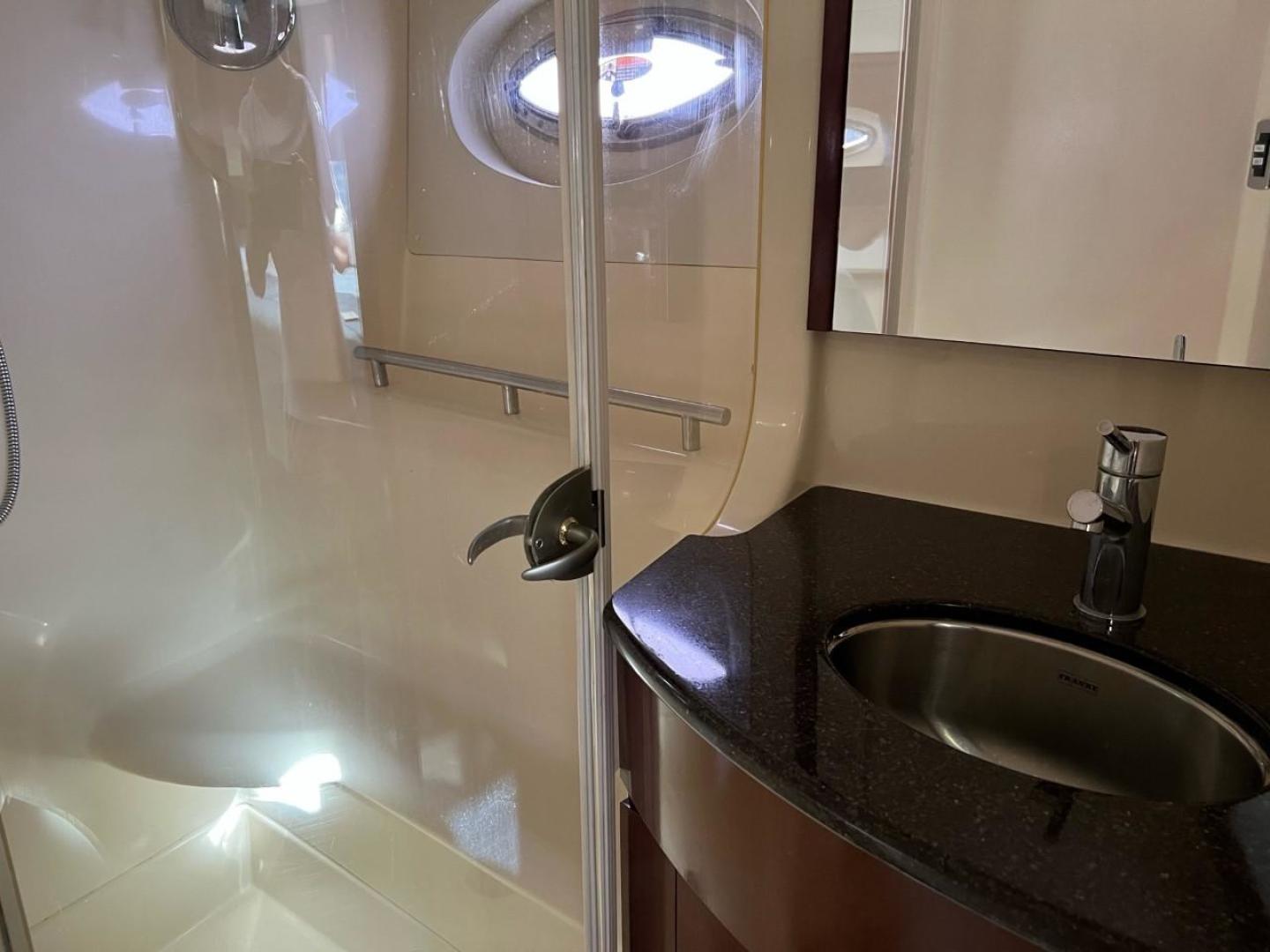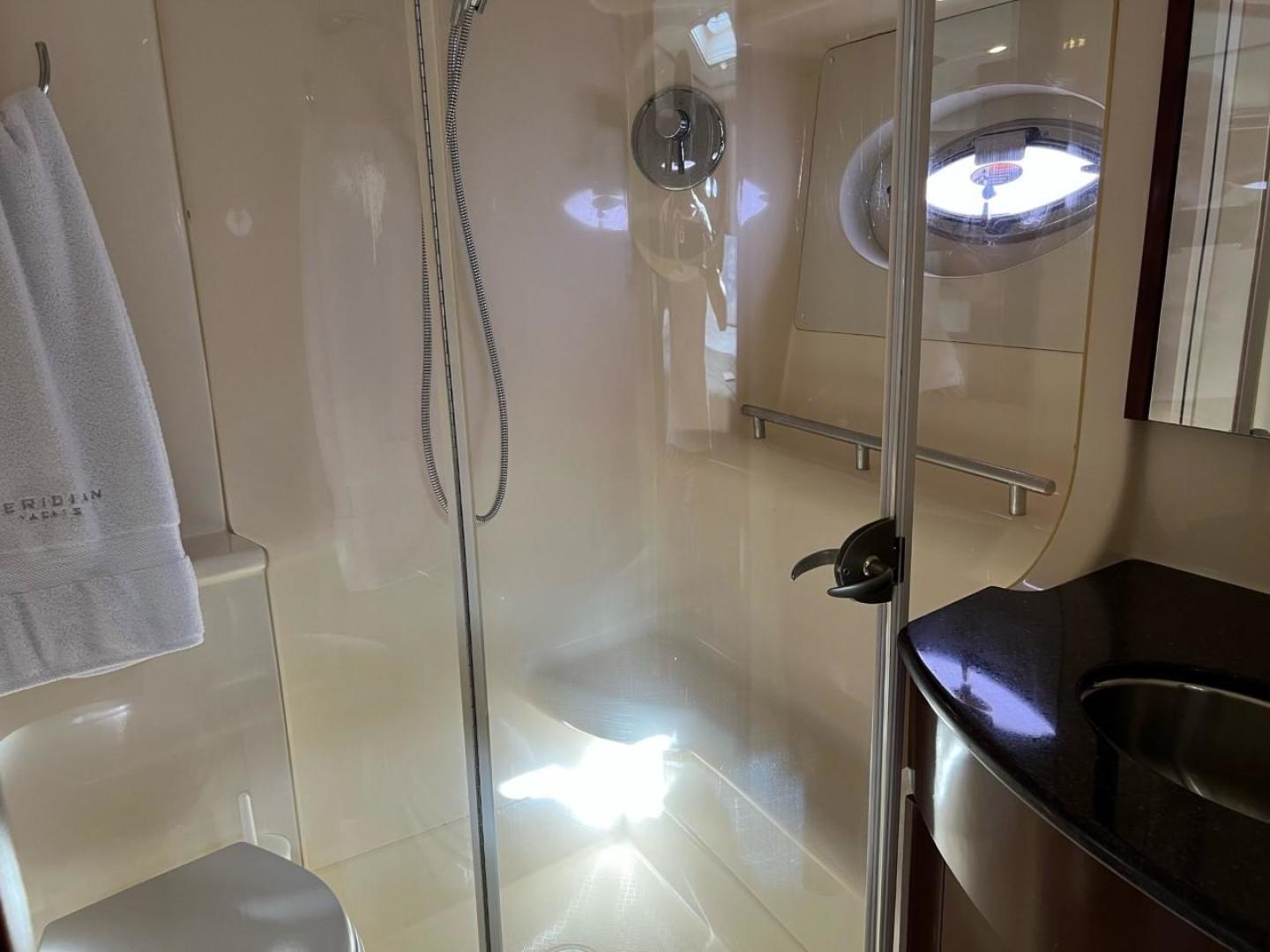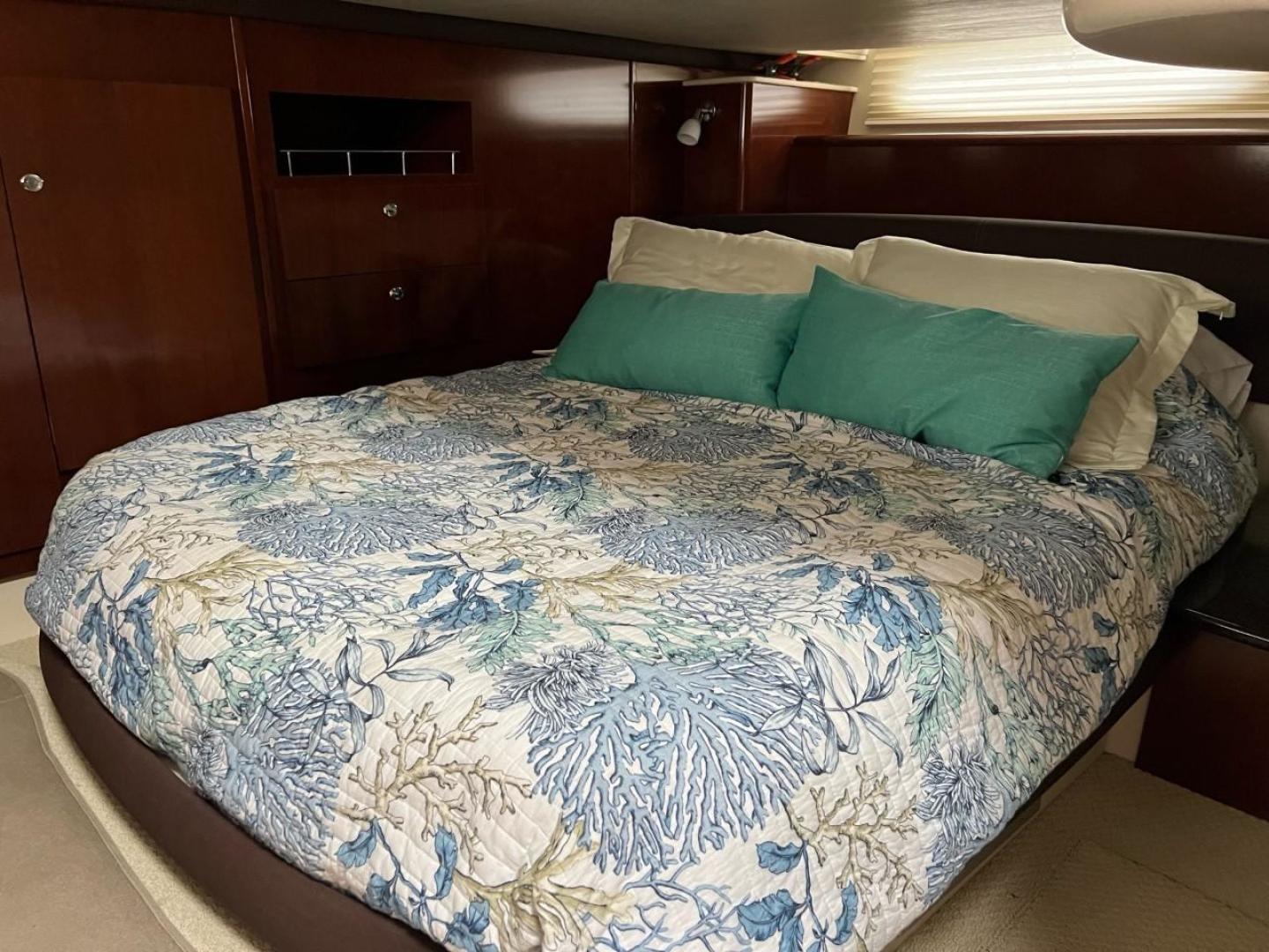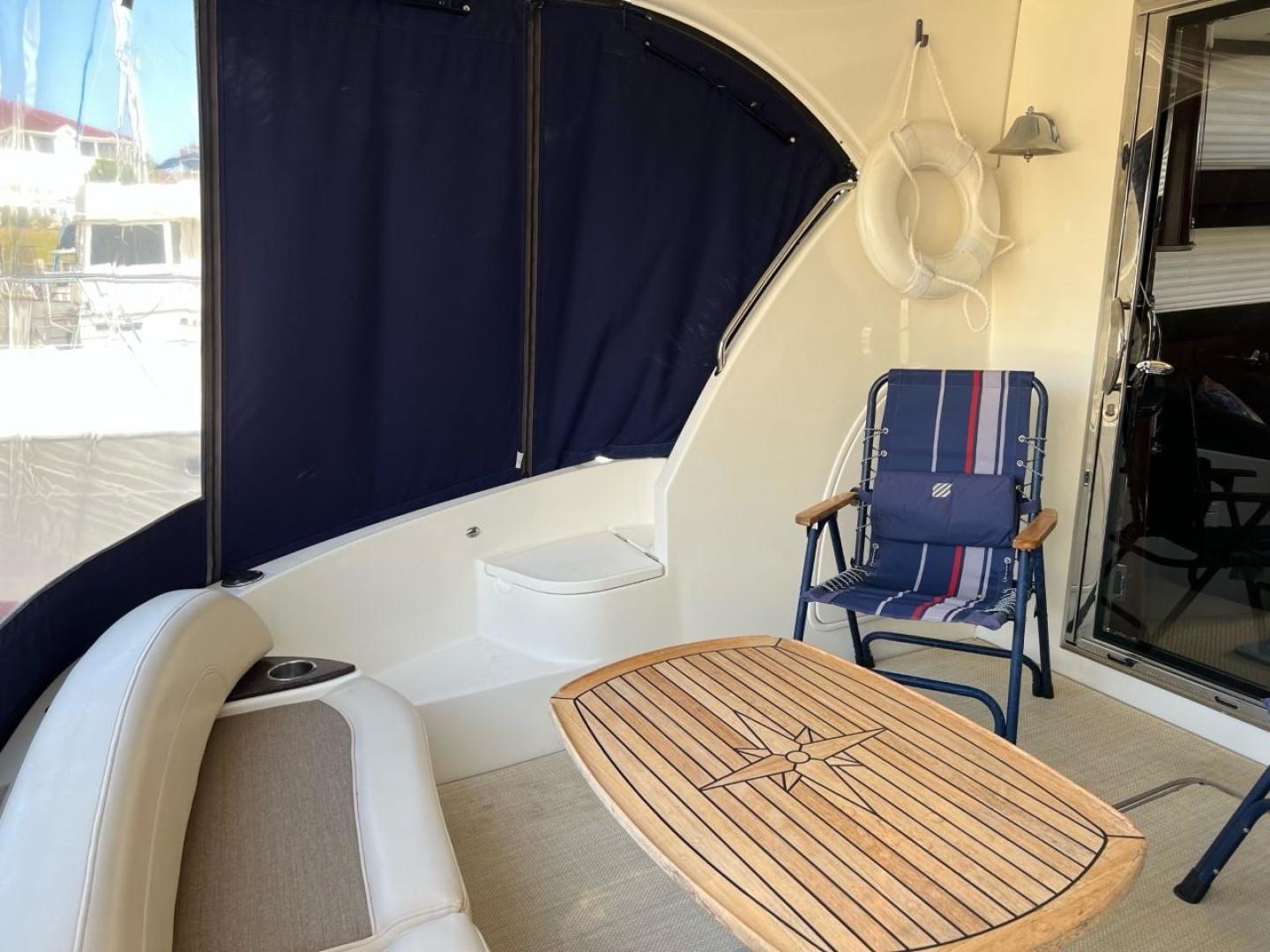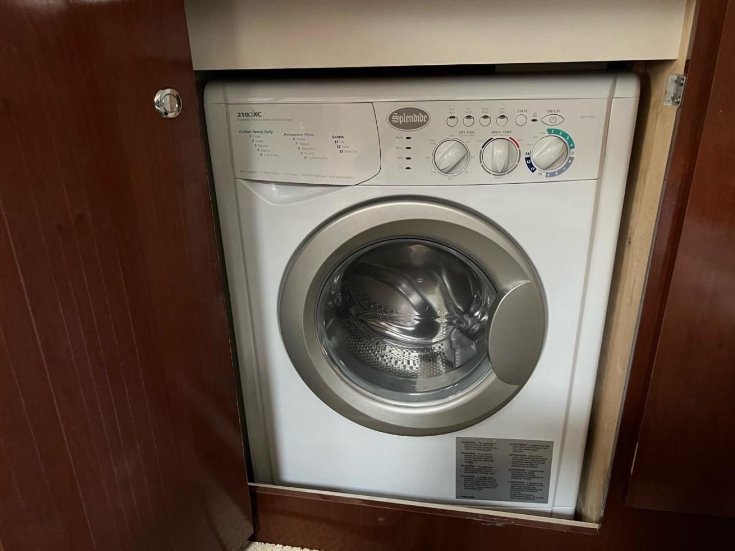 She is well appointed, very comfortable two-stateroom, two-head layout with a fabulous oversized enclosed shower with bench in the Ensuite Master Bath. The wide-open floor plan provides awesome visibility from all interior areas. The size of the AIR-CONDITIONED HARDTOP FLYBRIDGE is of a size often found only on much bigger yachts extending your living and entertaining space significantly. The full beam mid berth even includes an ‘All-in-One’ washer/dryer.