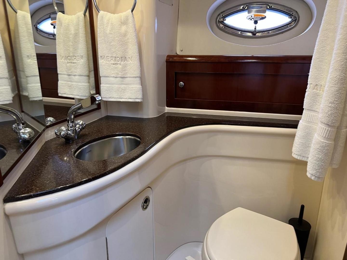 In designing the 441 Sedan, Meridian's team of naval architects developed a new hull, deck, bridge and shearline. This design features a more aggressive profile and hull-side windows for the guest stateroom, easier bridge access, better topside accommodations, and more natural light and woodwork in its interior living spaces. The 441's wide-open floor plan ensures smooth flow and unbroken lines of sight between the salon, the yacht's dedicated dinette and the full-service galley. What's more, Meridian has further enhanced its signature integrated two-tier window system to ensure improved visibility from all these interior areas. A lower helm station is available. Plus the 441's impressive two-stateroom, two-head layout provides a gracious master suite, located forward with a queen-size island berth with innerspring pillowtop mattress. The spacious amidship guest stateroom, which spans the yacht's beam, features a double berth, thoughtfully appointed vanity and settee and plenty of storage.