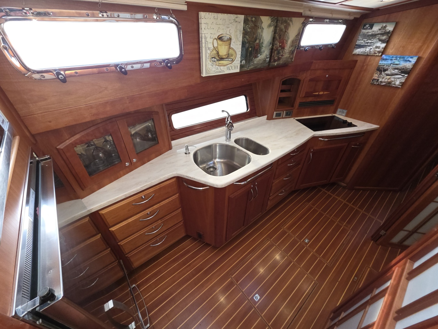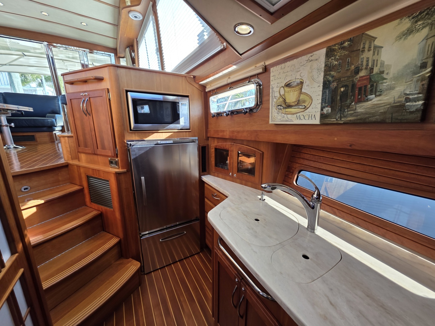 The 48's traditional exterior profile belies the contemporary performances of her vee-hull. She cruises at 27 knots and at wide open throttle she'll attain more than 32 knots. With the Zeus pod drive system, turns at speed are as exciting as they are in a fine sports car but perhaps even more exhilarating is the quiet that one experiences at cruise speeds. Less than 75 Dba makes her one of the quietest motoryachts available today. The joystick and Skyhook operations give every Captain the confidence to dock her in the most difficult of circumstances.