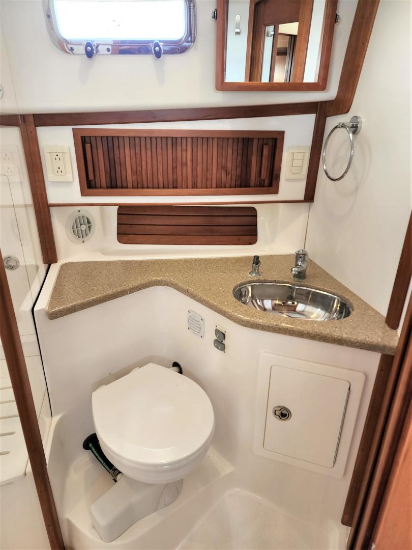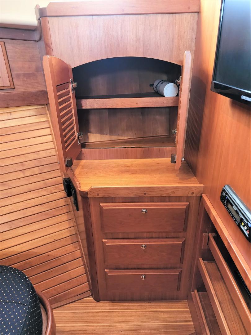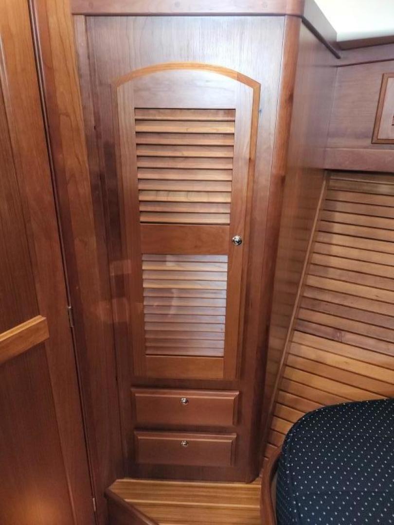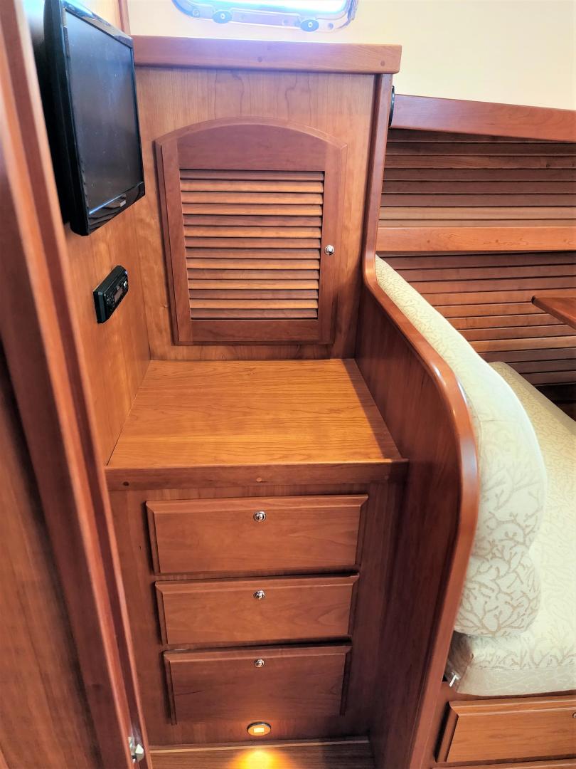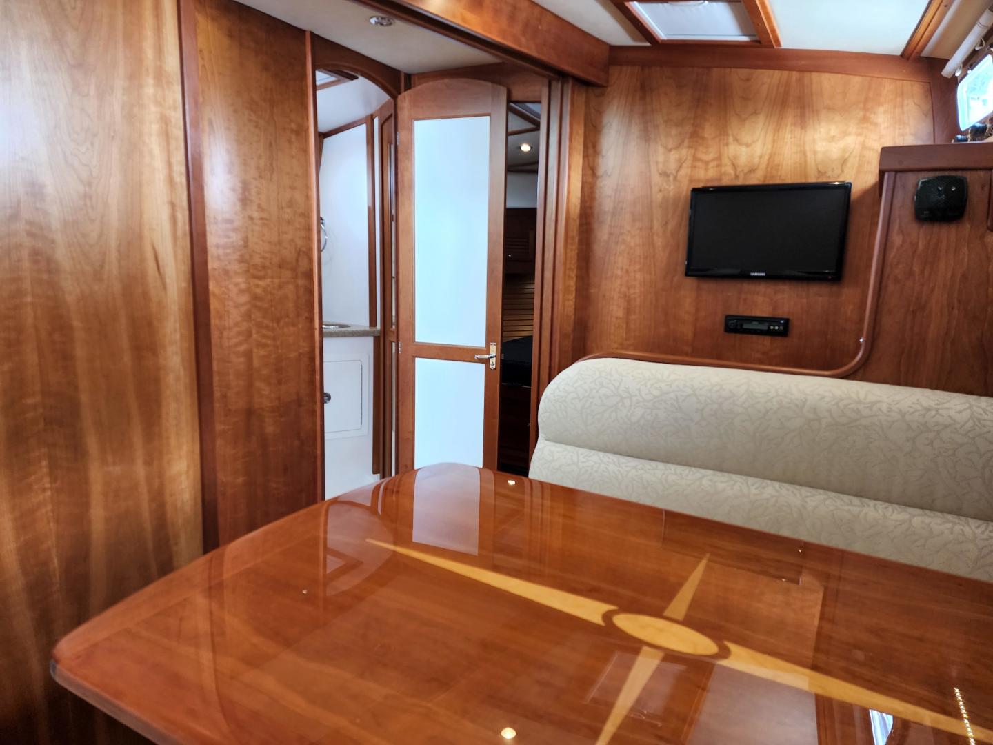 2013 Sabre 42 Salon Express is available for immediate sale! She has a fresh bottom job July 1 2022. She is located in Naples Florida which is close to Regional Southwest Airport in Ft. Myers Florida, only 30 minutes away. The vessel was originally delivered to the first owner, then resold at only 160 hours. The present owners have taken good care of this seasonally used boat which presently has only 440 hours on QSB 380 Cummins motors and Zeus Drives. She has been maintained by the same service company since new delivery. Off The hook is heavily optioned with Skylight, Optional Convertible Dinette, Grill and Ice maker, and the recently installed Freedom Lift. Major engine maintenance was performed 2/2021. The Sabre 42 Salon Express is a very popular model, with a very functional mid-level galley, which keeps everyone engaged in the fun. Her performance and economy makes for a flat efficient, comfortable ride. She cruises at 28 KTS, at a flat angle with integrated trim tabs that automatically adjust for speed and conditions. The Zeus Drives make joystick maneuvering very easy. The main deck has a transom door for easy boarding, into a spacious cockpit that has molded seating, a jump seat and optional Grill / Ice Maker Cabinet. The side decks are wide and easy and easy to traverse, with a lot of hand grabs, high railing and a solid teak safety toe rail. There is a custom cockpit cover that easily deploys with the use of stainless steel poles in rod holders. The main salon has two opposing settees, a pop up TV, bottle storage cabinet, helm station, engine room access and additional galley storage. The helm pod is equipped with Garmin Multifunction Touch Screens, with radar, depth, charts, vhf, and dual Cummins Vessel View Displays. The galley has microwave / convection oven, dual drawer refrigerator, freezer and a functional stainless steel sink. Below deck storage offers ample space to store supplies for longer voyages or additional gear. The master stateroom has a center island queen mattress, cedar lined hanging gear locker, chest of drawers, television with DVD player, overhead hatch, and ensuite private entrance to head with a full length dressing mirror. The dry head has a separate shower, Quiet Flush toilet, stainless steel sink, vanity mirror, cabinet and a "Day Head" entrance for guests. The convertible dinette is very practical for use as a booth type table, or a bed for two adults. This space has a TV, limited hanging locker, chest of drawers and solid wood pocket doors for privacy. The engine room is spacious and easily accessed through a hatch in the main salon. The batteries are located for convenient service or replacement. Engine start and house batteries replaced 2021.