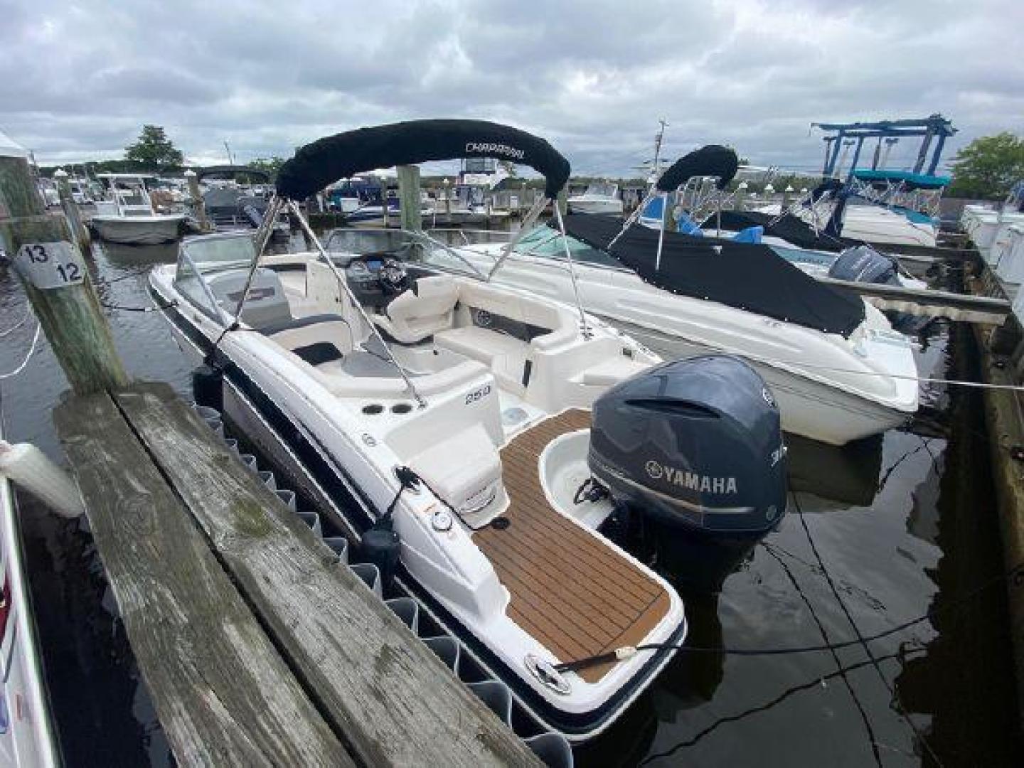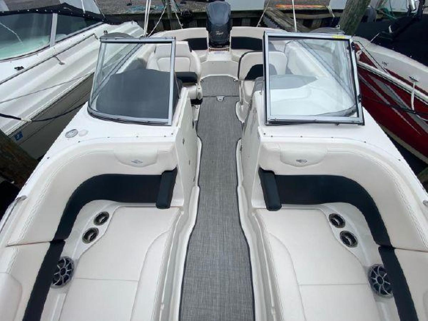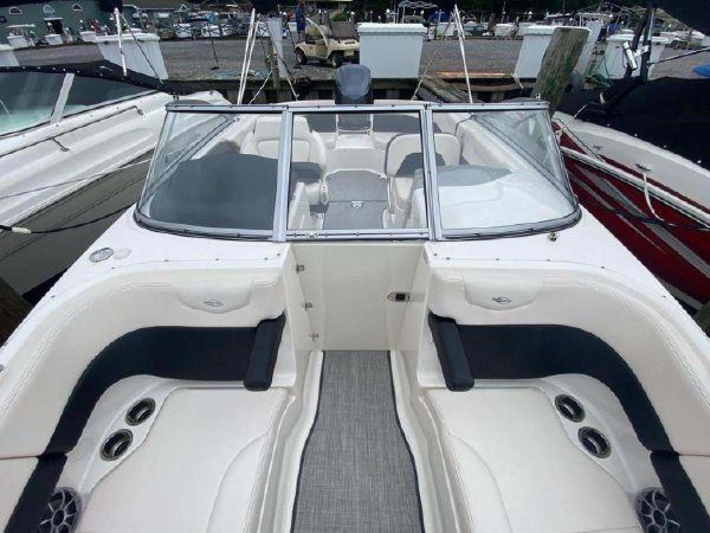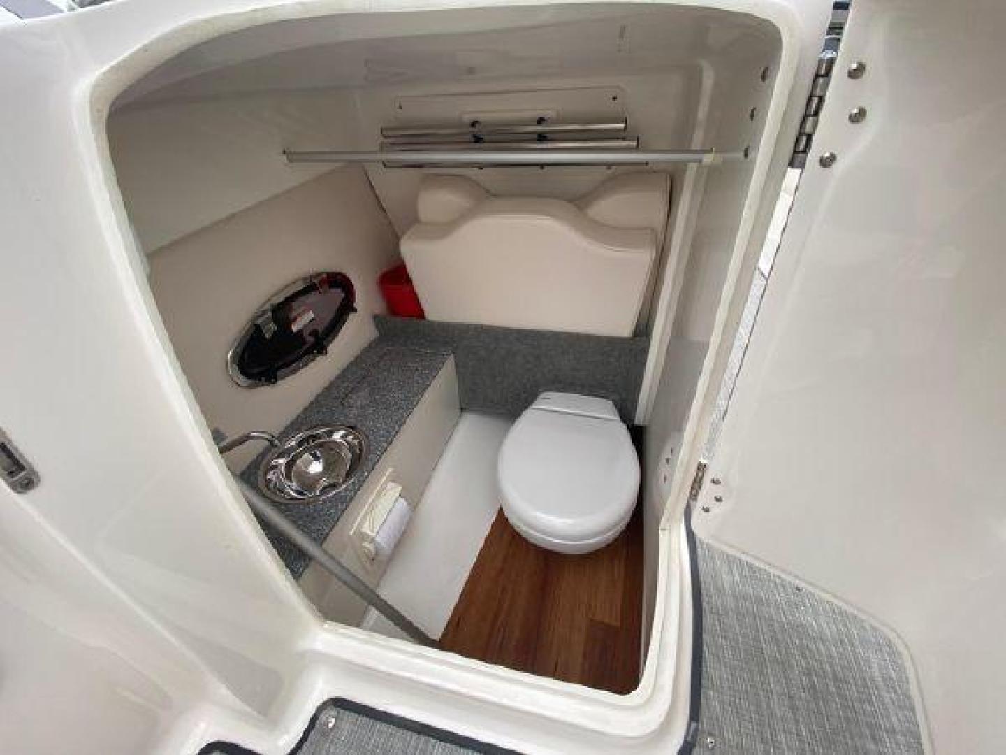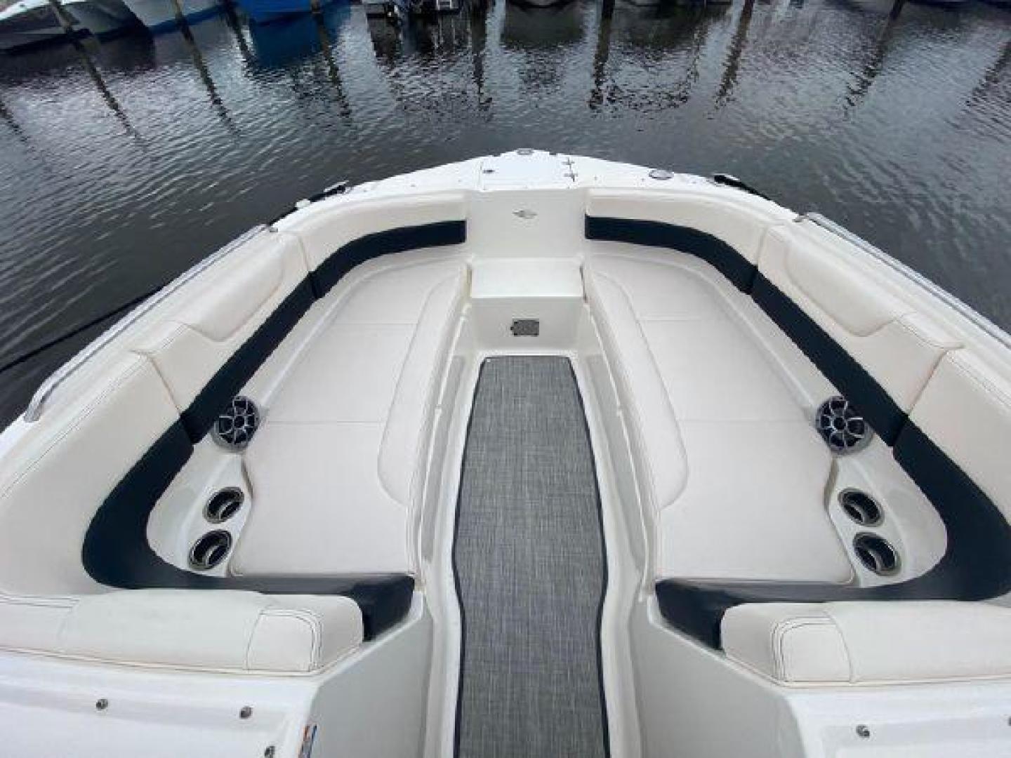 The 250 SunCoast features a forward compartment with flush mount latches, an easy-access ladder and an anchor cradle. Because the deck tapers very little moving aft, the bow area is the widest and roomiest you'll ever find on a 25-footer. Don't look now but four adults and a child or two could sit in the bow with legroom to spare. Twin stainless steel drink holders per side, enormous storage areas and top-mounted rails highlight the family-sized bow area. A table with side-mounts in the bow and cockpit is standard.