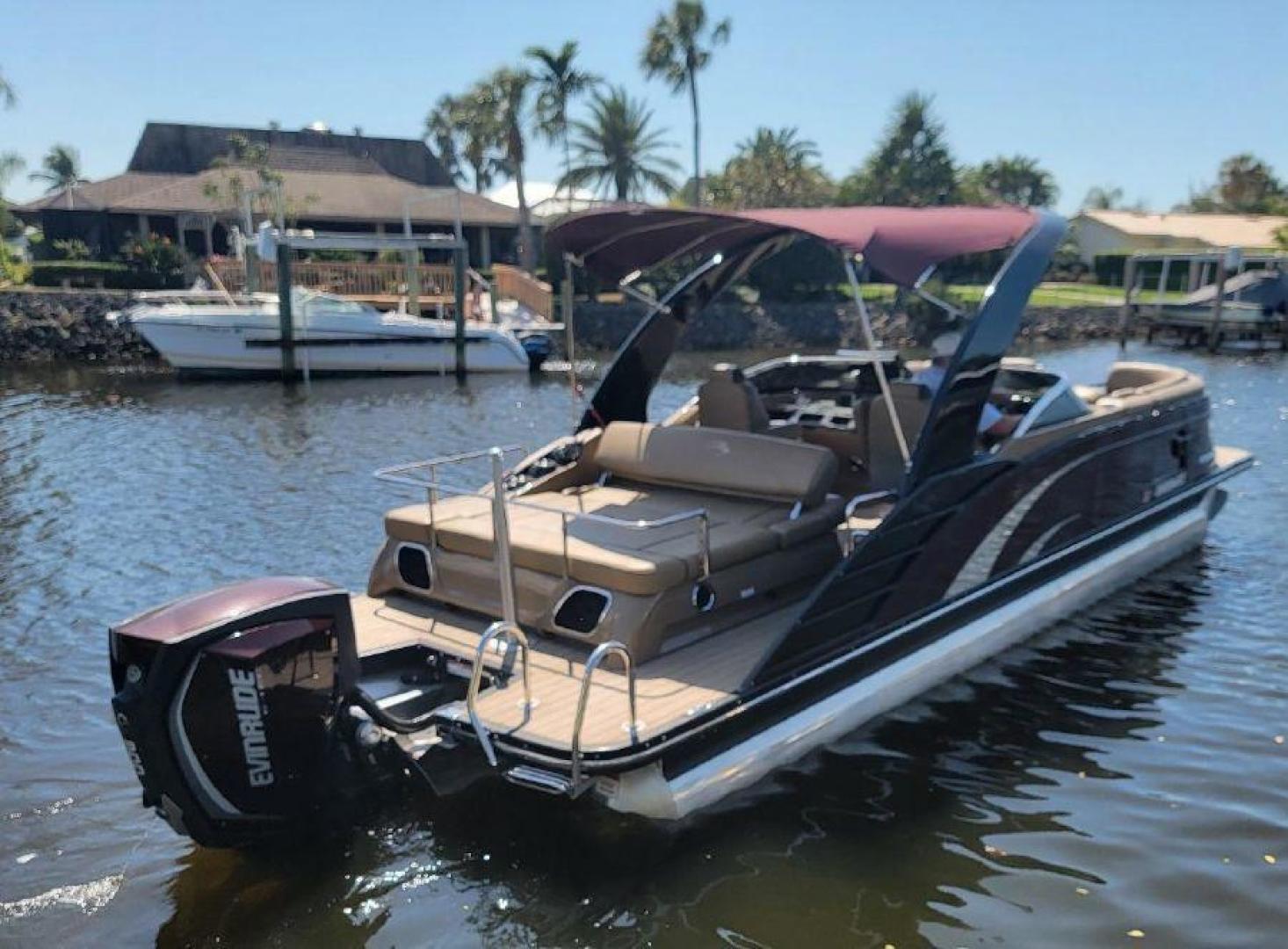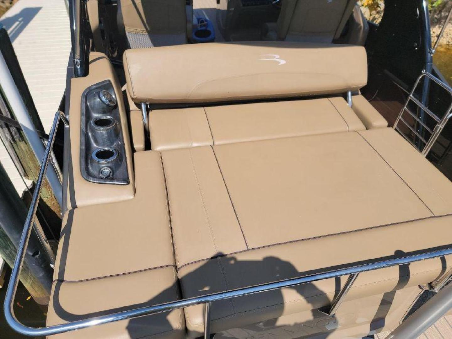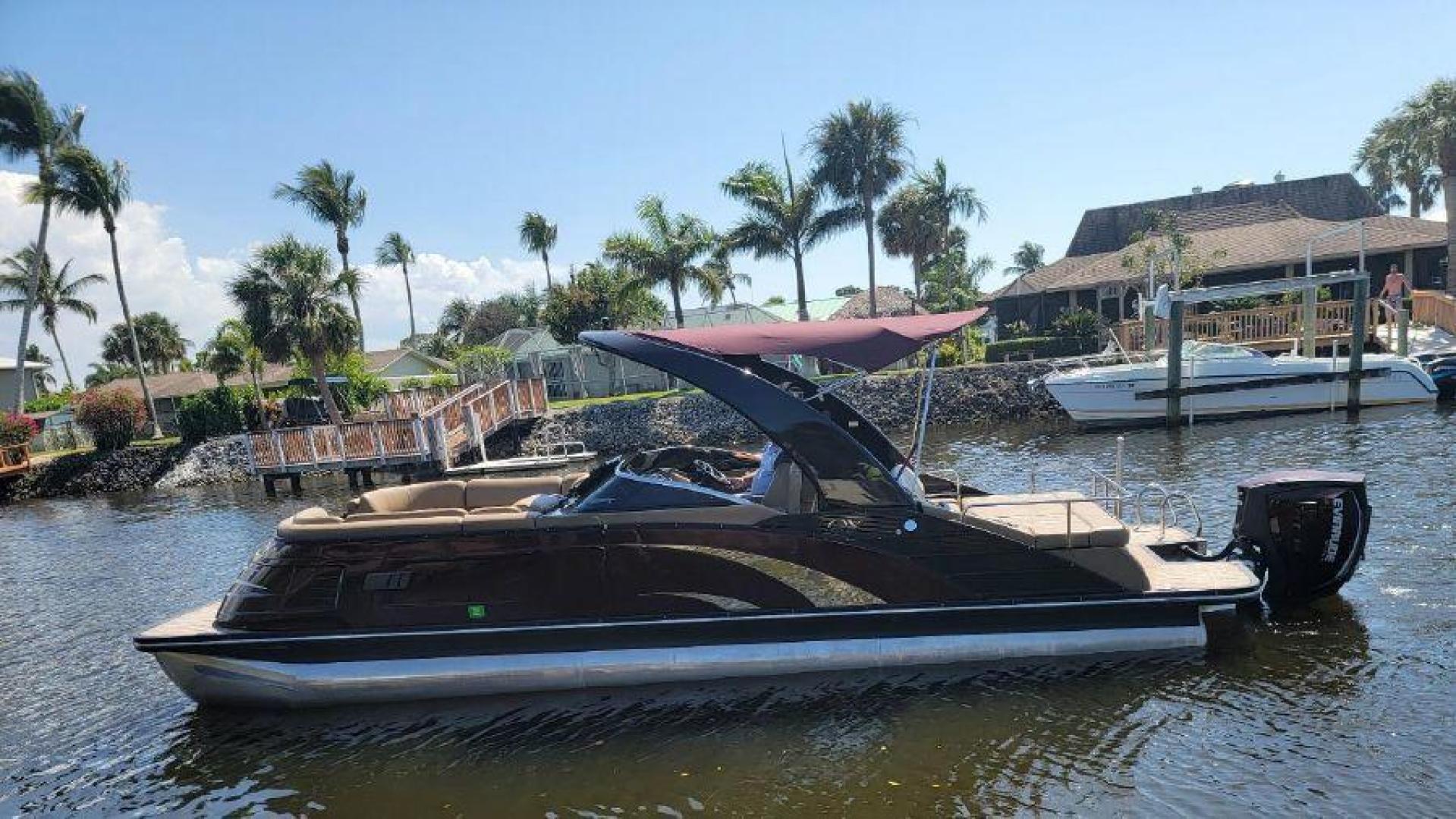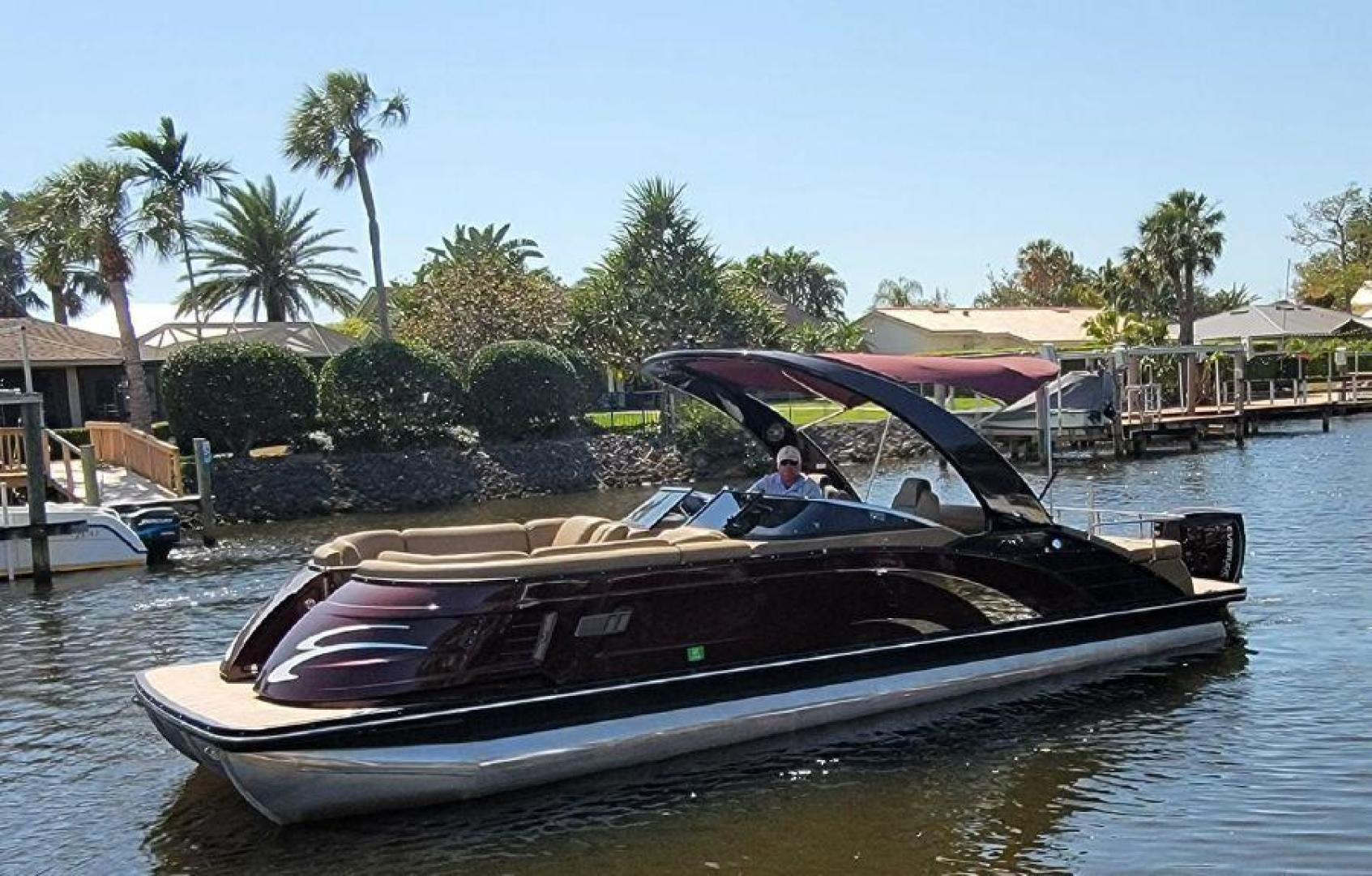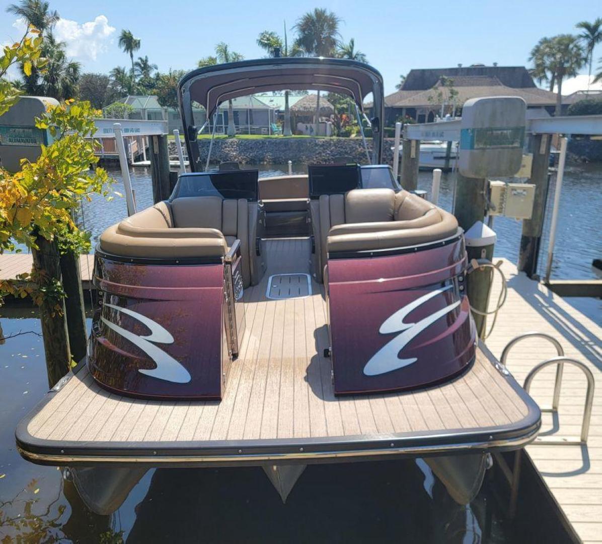 STYLE AND LUXURY WITH TOP PERFORMANCE. That is what you get in a Bennington Tri-toon. This one one is loaded up. New 9 Garmin XSV GPS, Kicking stereo with 12 speakers and sub woofers. Electric folding arch top with Bimini top aft. Full loungers and dual captains chairs. Deluxe ski tow for all water sports. Full cover, Stainless steel prop. Wet bar dash. Dual console with windscreens, LED lights, ETECH 300 is quiet smooth and reliable. Low hours under 300. Comes with a trailer. This boat is lift stored in Naples Florida.