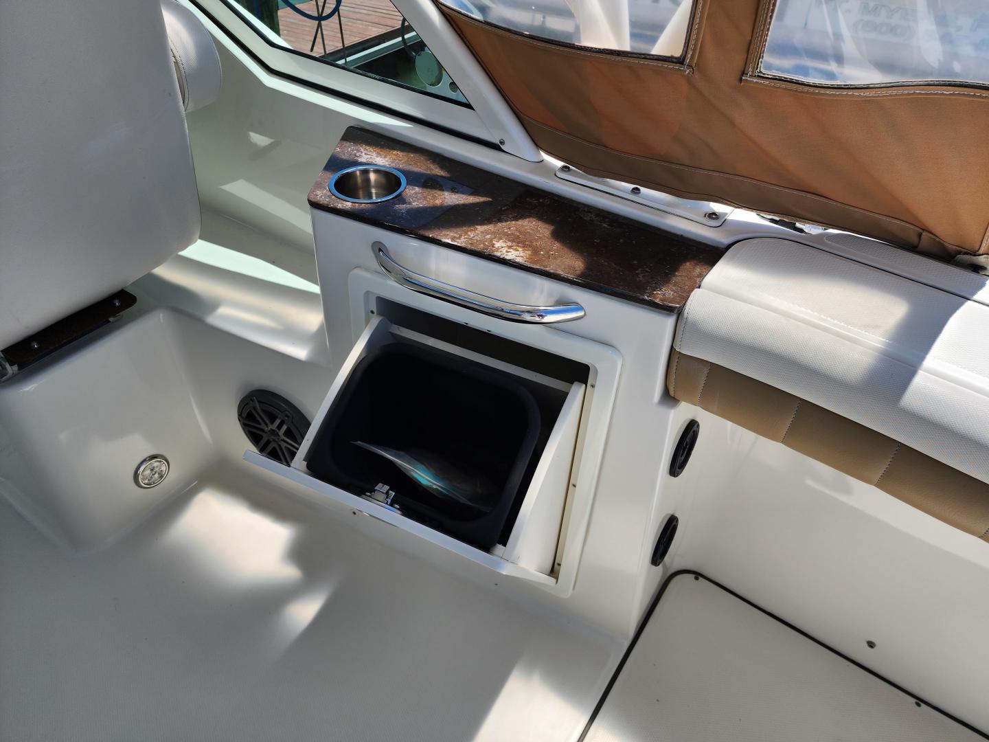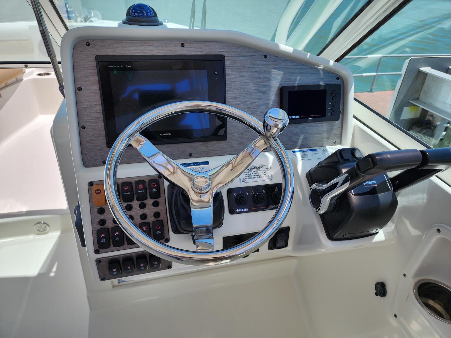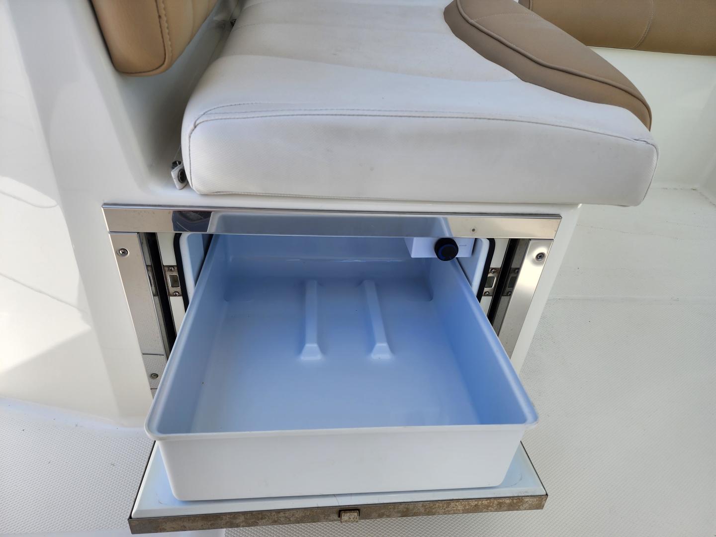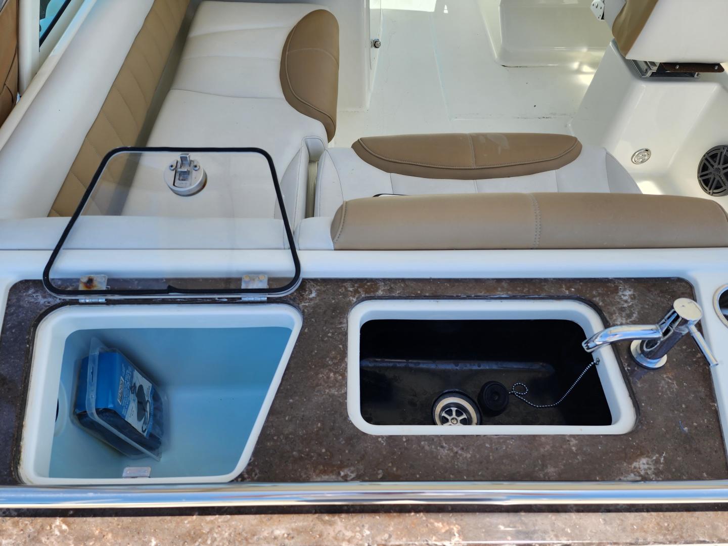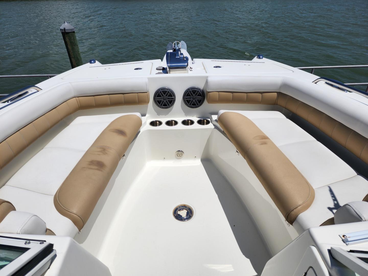 This is a family friendly, very stable vessel set up for offshore fun, beach days or a comfortable evening cruise. There is a very healthy swim ladder aft with a fresh water shower, two nice jump seats in the cockpit that fold away to make the cockpit more spacious. There are two insulated fish boxes that can be used as food and drink coolers. The forward end of the cockpit has a nice console with a live well, fresh water sink, and plenty of storage. The helm deck has an L shaped settee to port with plenty of storage underneath, and an Isotherm refrigerator. There is a hidden garbage can for a convenient place to throw refuse, but remain unseen. Forward and to starboard us the helm console with a Garmin GPS MAP 7610xsv, Yamaha display, Fusion stereo remote with Bluetooth adaptability, and set of console switches for pumps, lights etc.