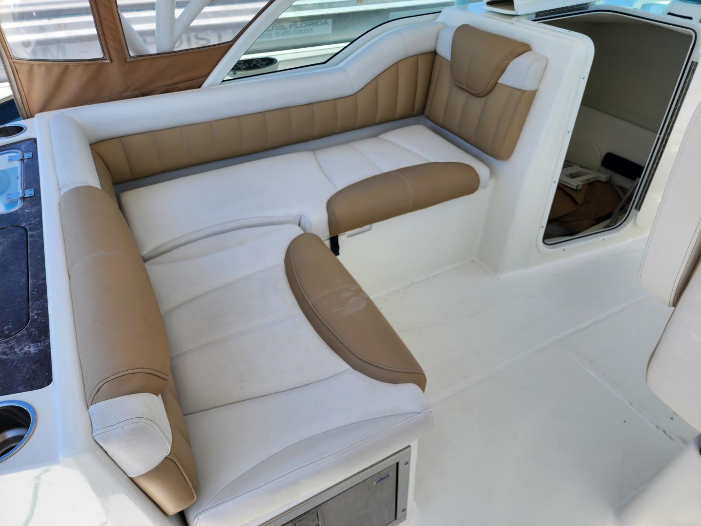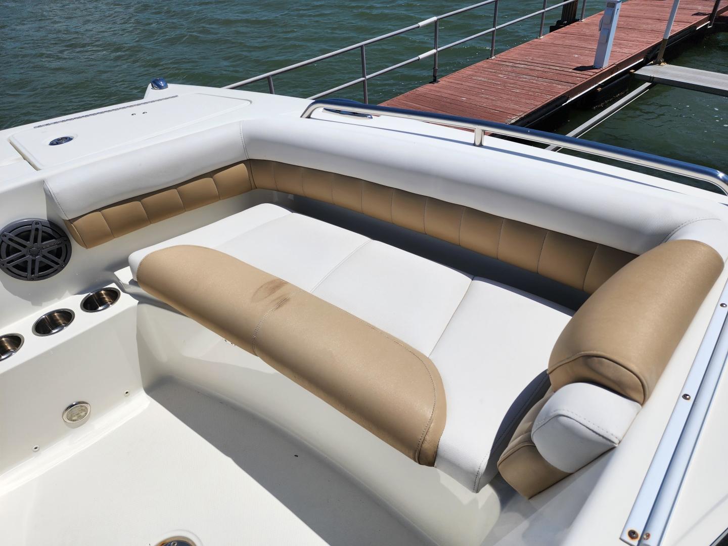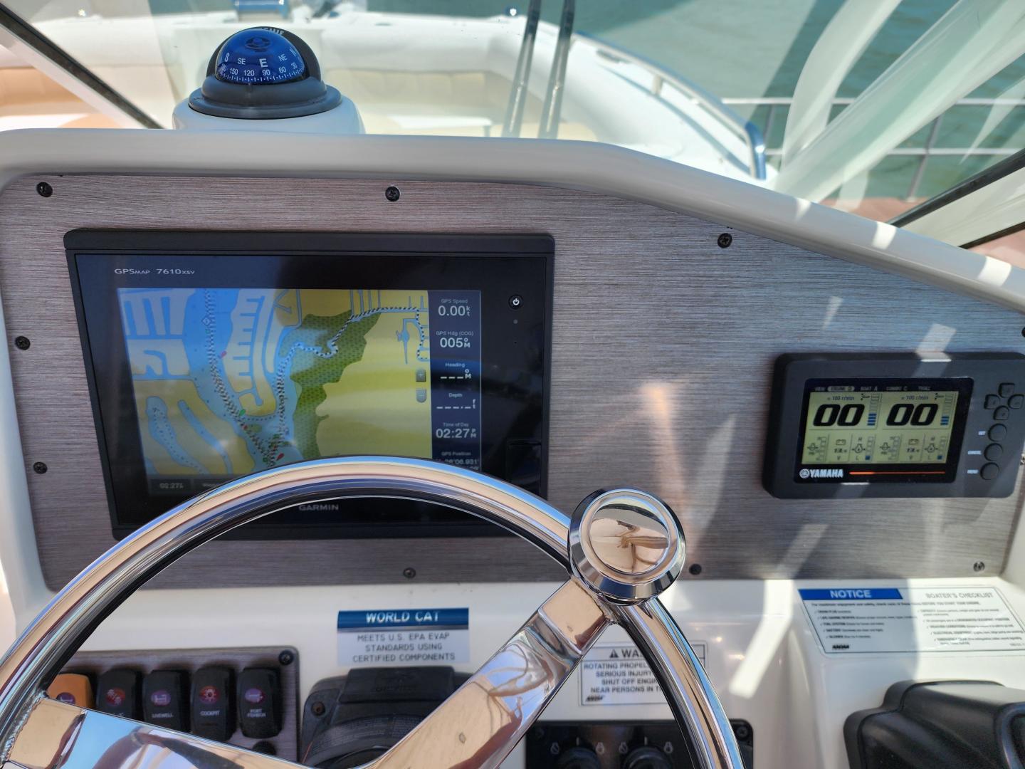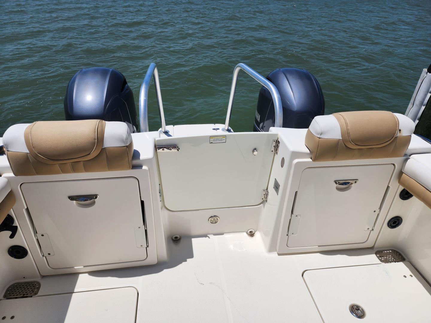 This is a family friendly, very stable vessel set up for offshore fun, beach days or a comfortable evening cruise. There is a very healthy swim ladder aft with a fresh water shower, two nice jump seats in the cockpit that fold away to make the cockpit more spacious. There are two insulated fish boxes that can be used as food and drink coolers. The forward end of the cockpit has a nice console with a live well, fresh water sink, and plenty of storage. The helm deck has an L shaped settee to port with plenty of storage underneath, and an Isotherm refrigerator. There is a hidden garbage can for a convenient place to throw refuse, but remain unseen. Forward and to starboard us the helm console with a Garmin GPS MAP 7610xsv, Yamaha display, Fusion stereo remote with Bluetooth adaptability, and set of console switches for pumps, lights etc.