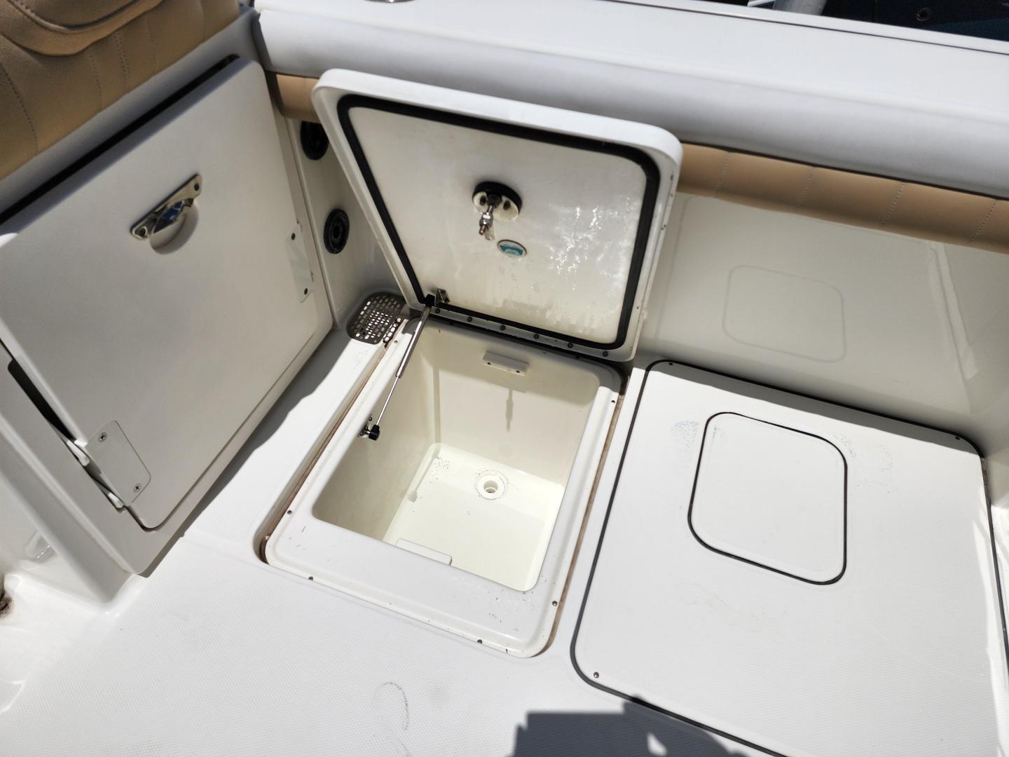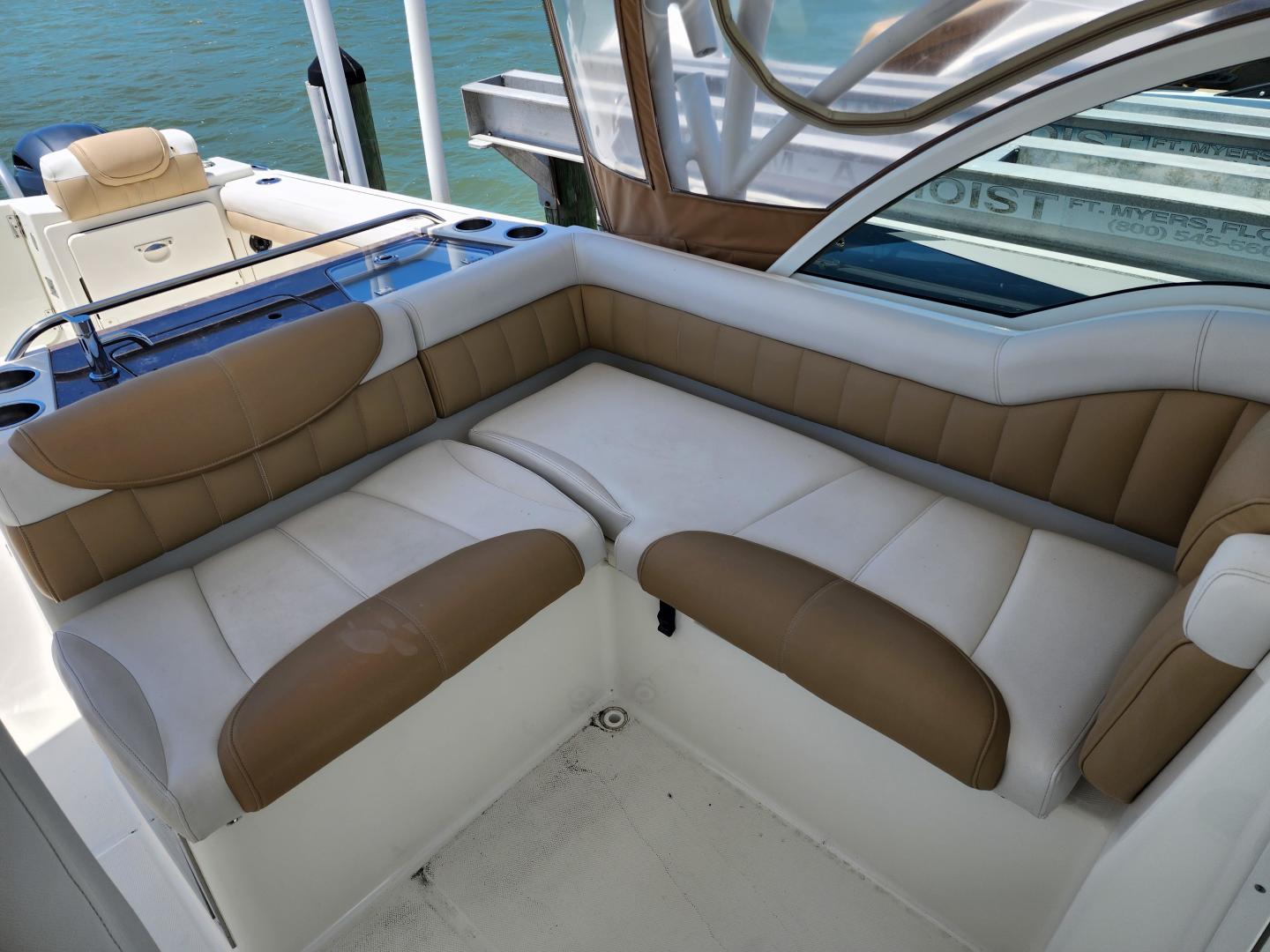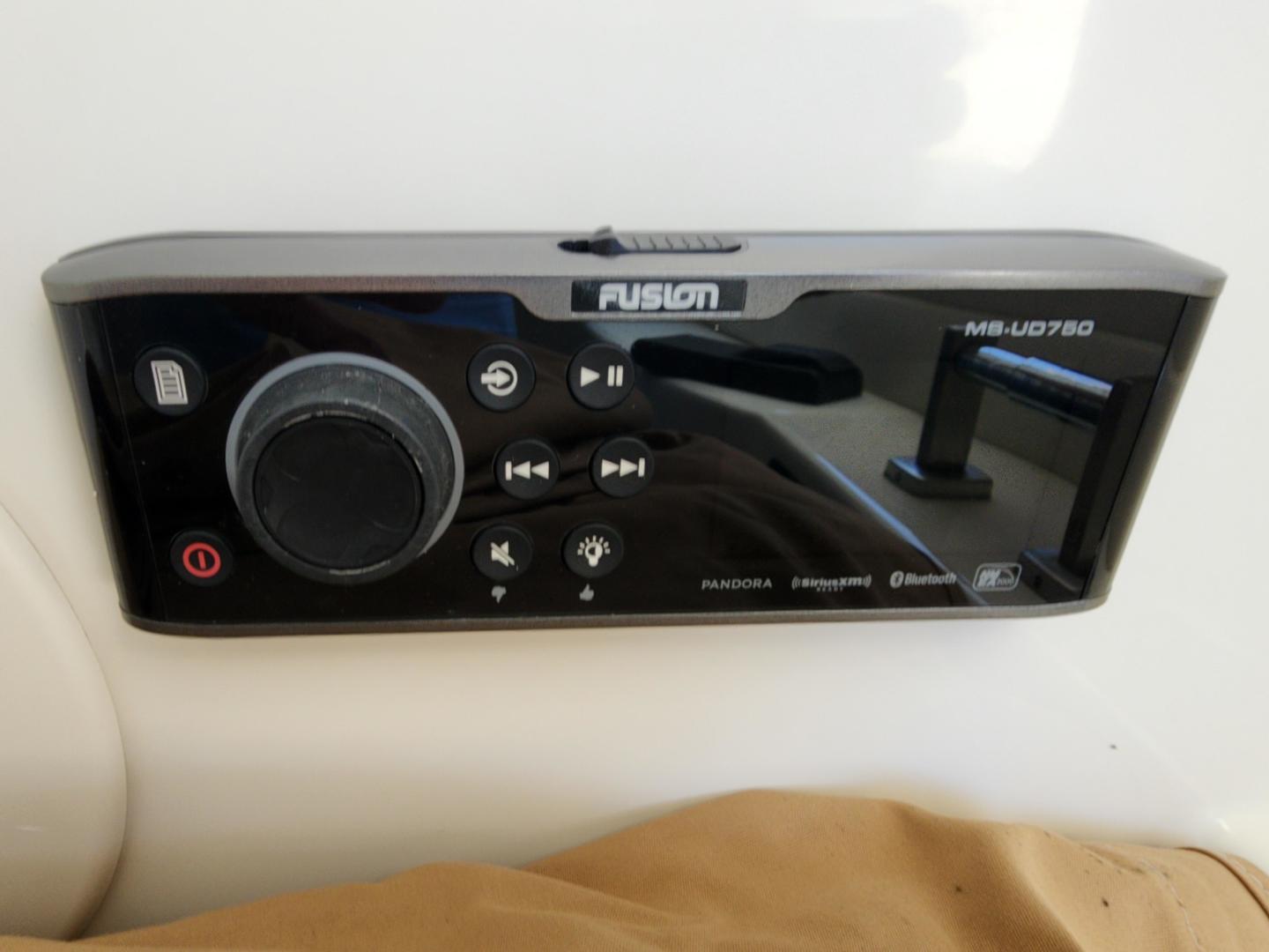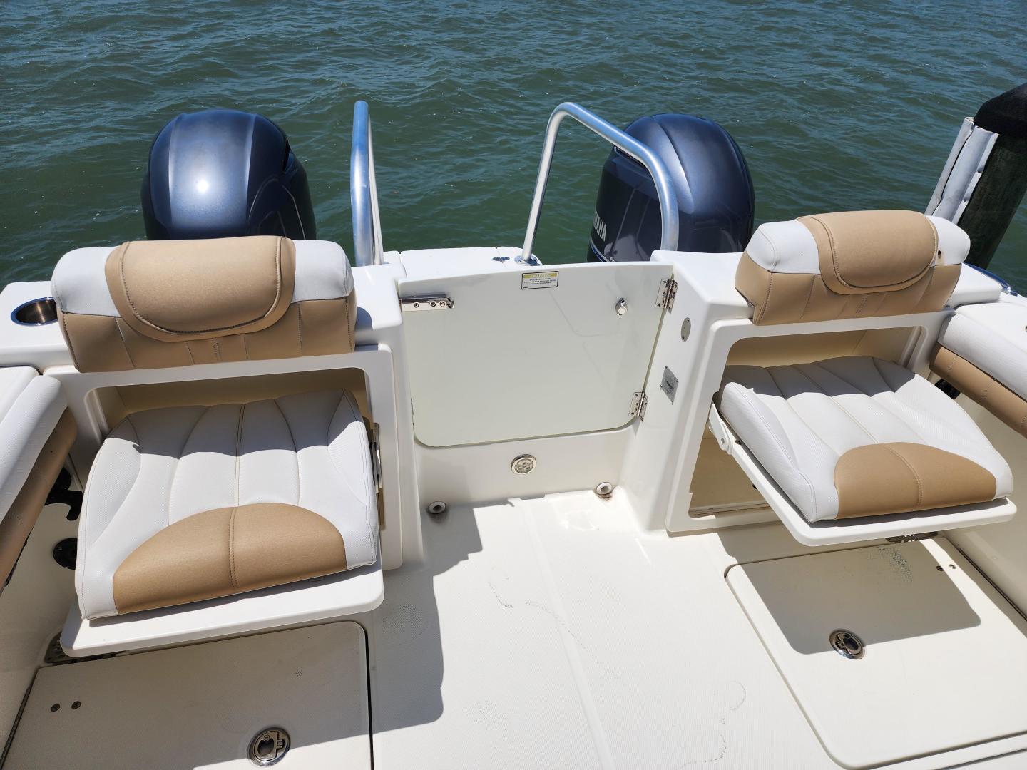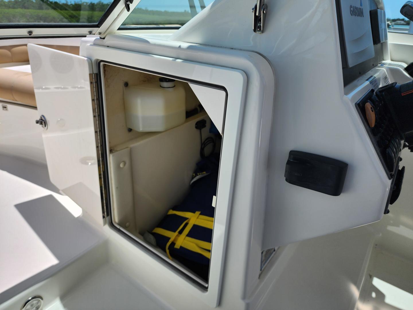 This is a family friendly, very stable vessel set up for offshore fun, beach days or a comfortable evening cruise. There is a very healthy swim ladder aft with a fresh water shower, two nice jump seats in the cockpit that fold away to make the cockpit more spacious. There are two insulated fish boxes that can be used as food and drink coolers. The forward end of the cockpit has a nice console with a live well, fresh water sink, and plenty of storage. The helm deck has an L shaped settee to port with plenty of storage underneath, and an Isotherm refrigerator. There is a hidden garbage can for a convenient place to throw refuse, but remain unseen. Forward and to starboard us the helm console with a Garmin GPS MAP 7610xsv, Yamaha display, Fusion stereo remote with Bluetooth adaptability, and set of console switches for pumps, lights etc.