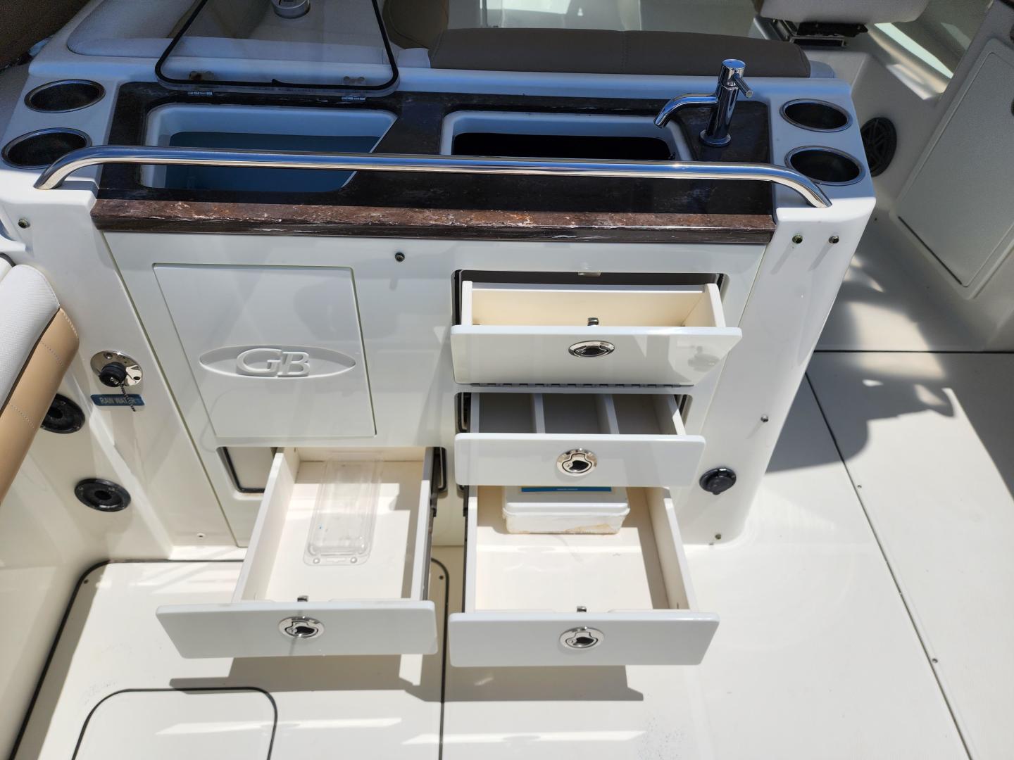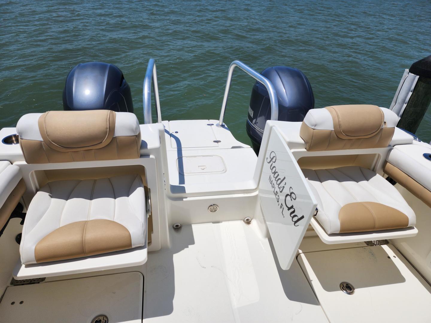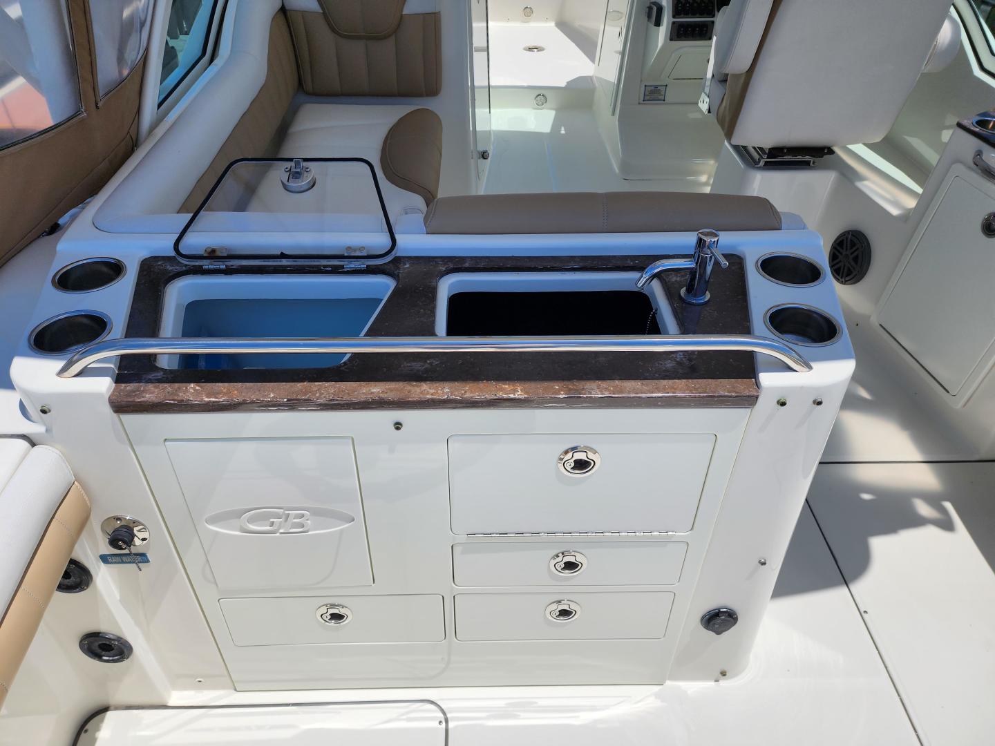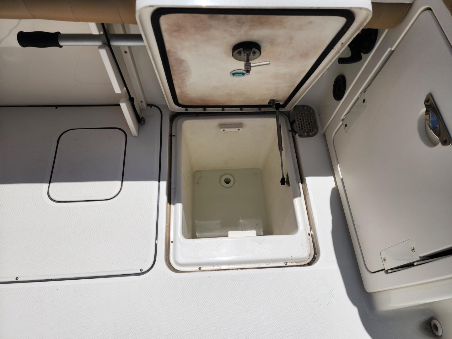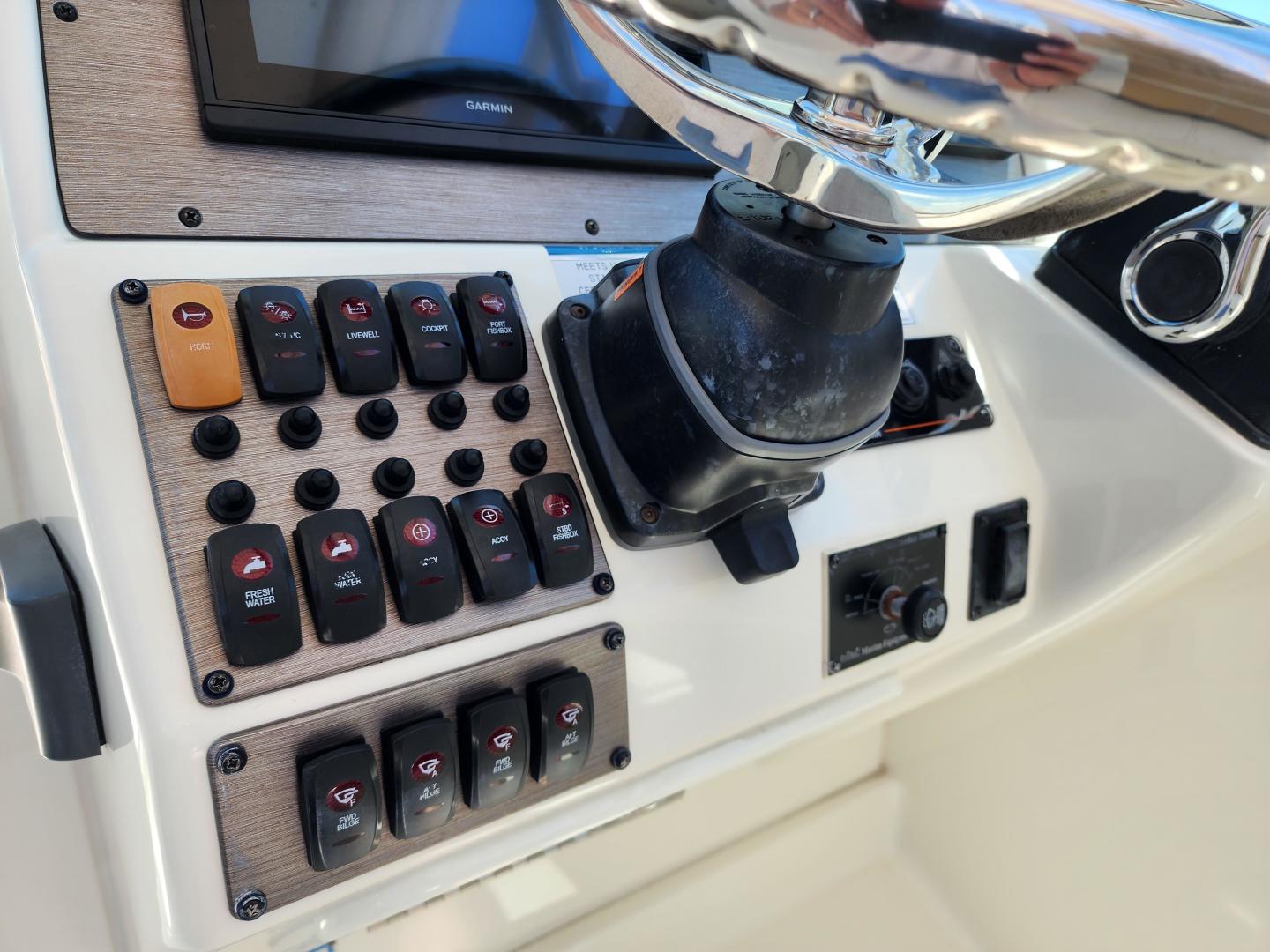This is a family friendly, very stable vessel set up for offshore fun, beach days or a comfortable evening cruise. There is a very healthy swim ladder aft with a fresh water shower, two nice jump seats in the cockpit that fold away to make the cockpit more spacious. There are two insulated fish boxes that can be used as food and drink coolers. The forward end of the cockpit has a nice console with a live well, fresh water sink, and plenty of storage. The helm deck has an L shaped settee to port with plenty of storage underneath, and an Isotherm refrigerator. There is a hidden garbage can for a convenient place to throw refuse, but remain unseen. Forward and to starboard us the helm console with a Garmin GPS MAP 7610xsv, Yamaha display, Fusion stereo remote with Bluetooth adaptability, and set of console switches for pumps, lights etc.