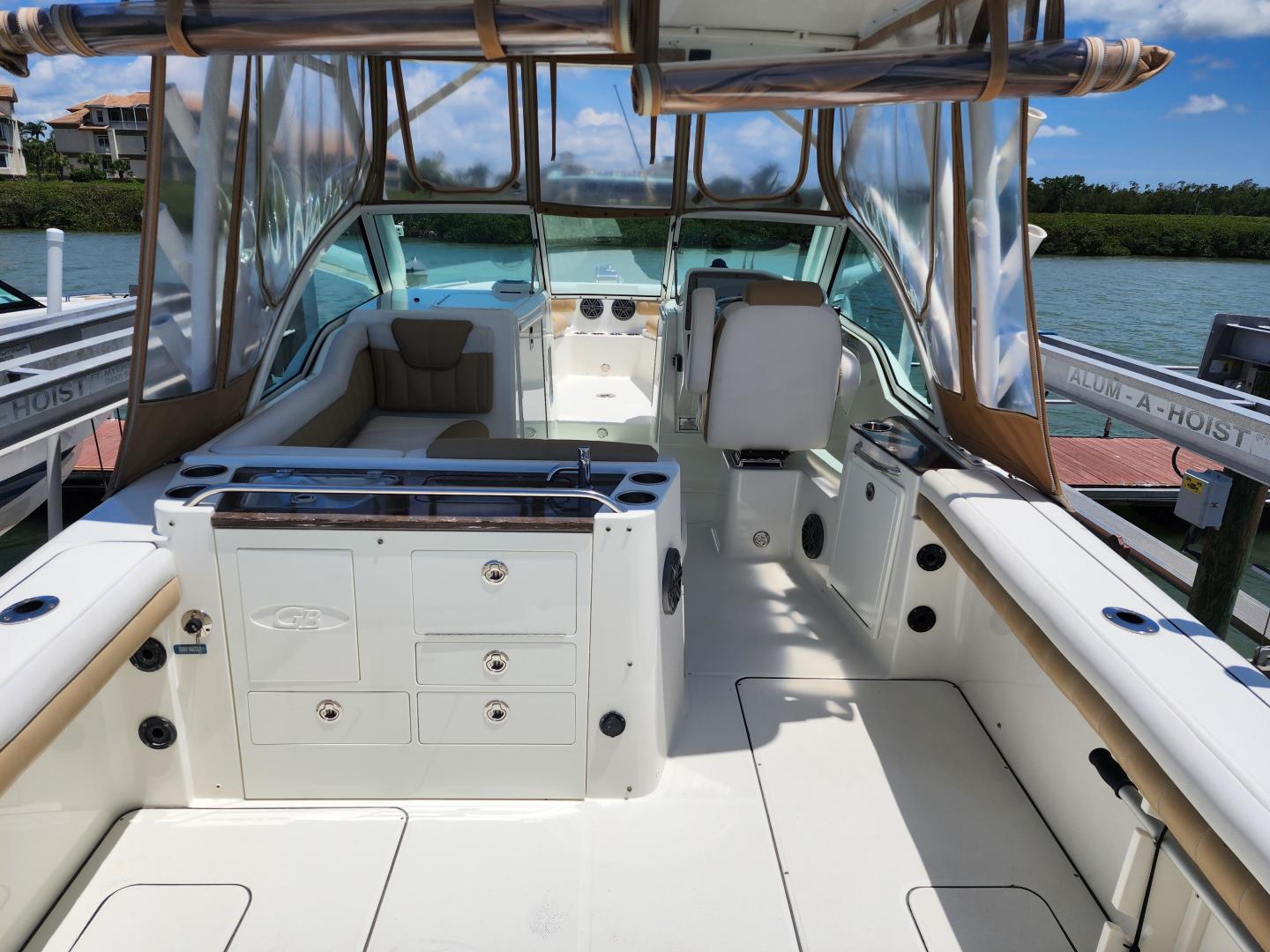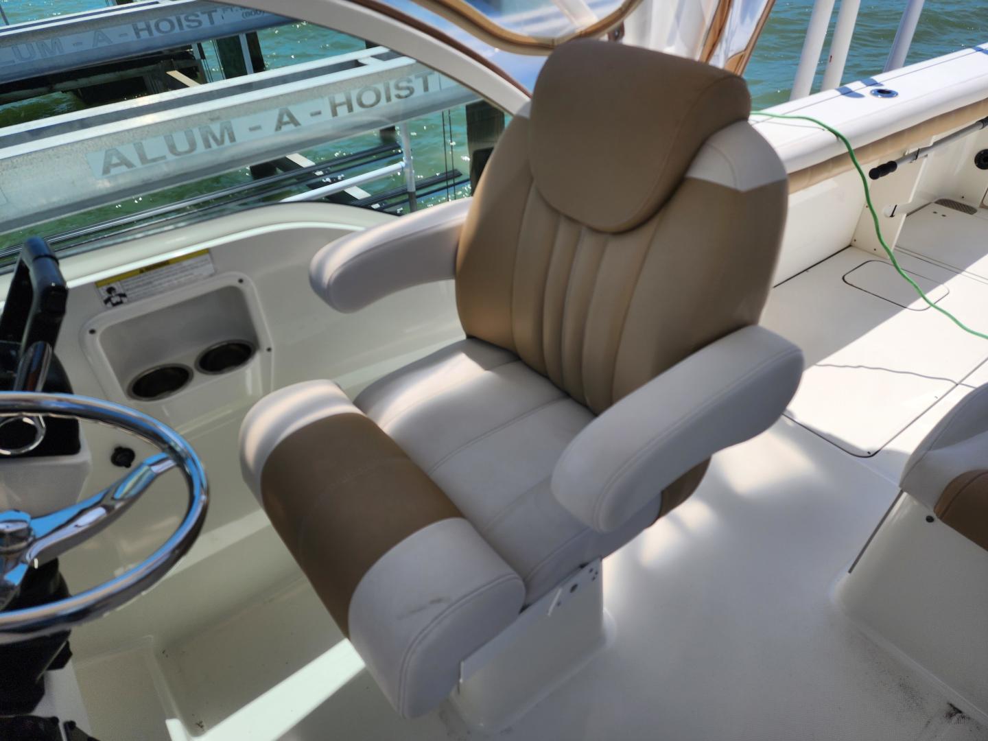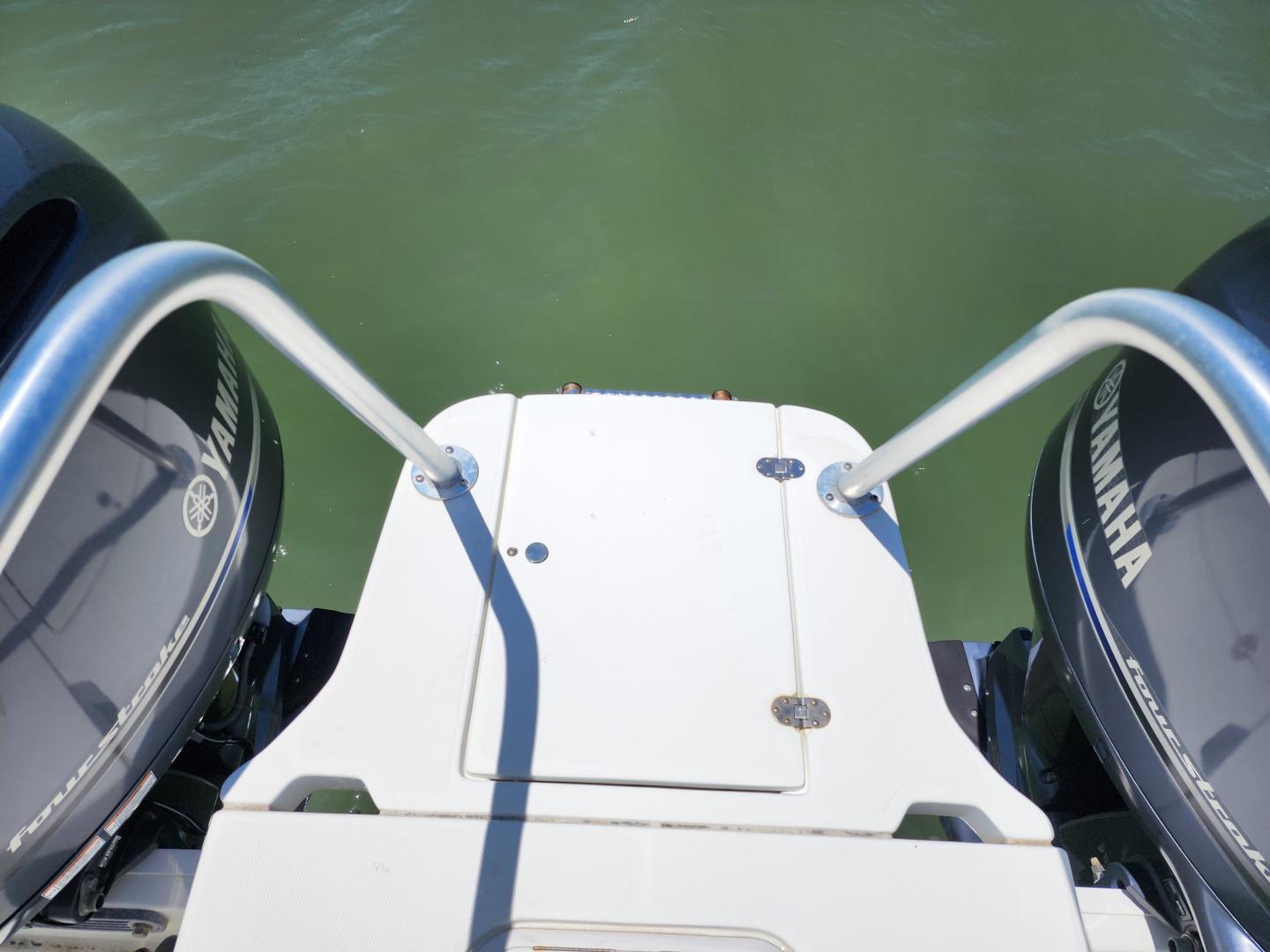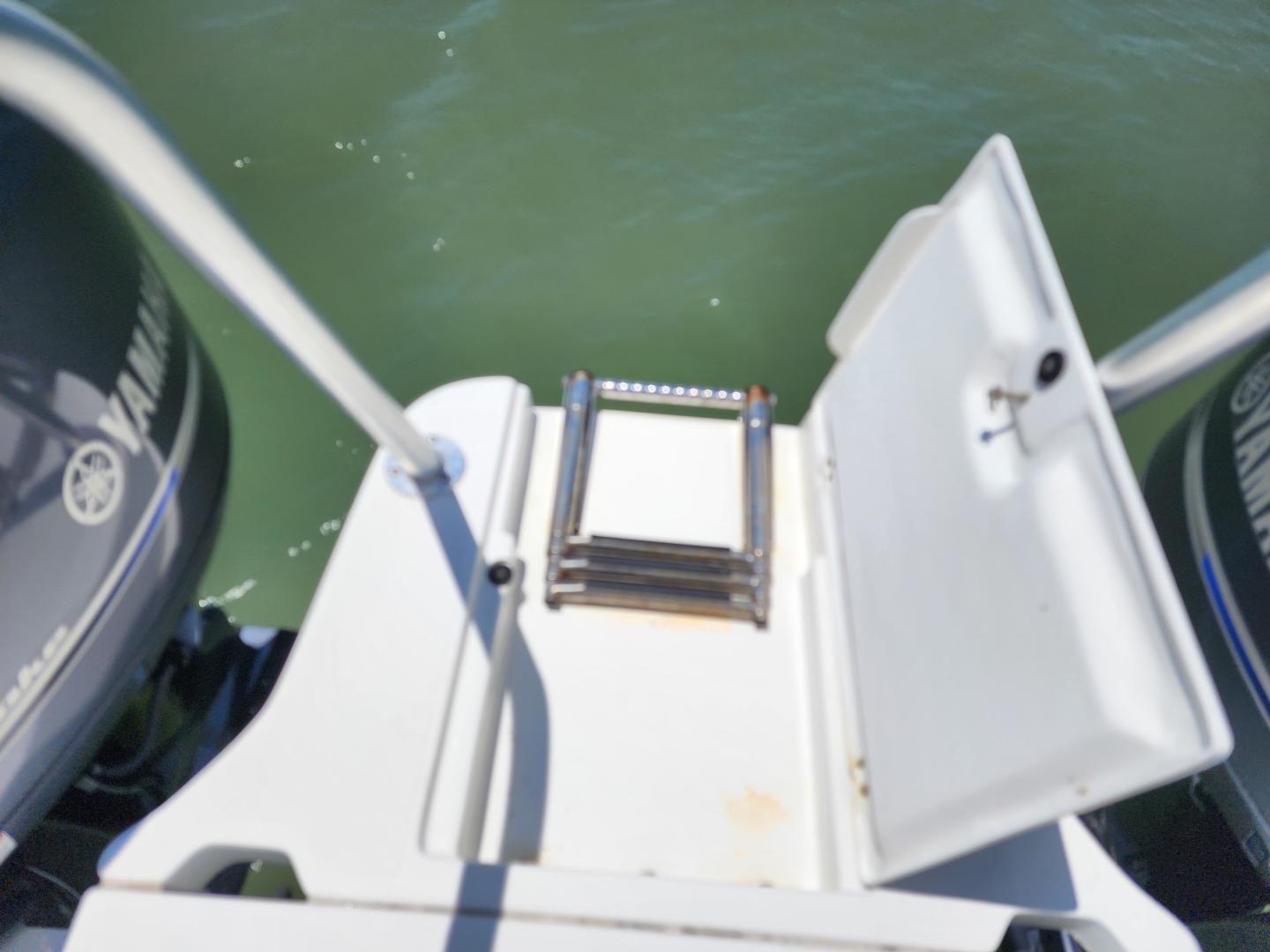 This is a family friendly, very stable vessel set up for offshore fun, beach days or a comfortable evening cruise. There is a very healthy swim ladder aft with a fresh water shower, two nice jump seats in the cockpit that fold away to make the cockpit more spacious. There are two insulated fish boxes that can be used as food and drink coolers. The forward end of the cockpit has a nice console with a live well, fresh water sink, and plenty of storage. The helm deck has an L shaped settee to port with plenty of storage underneath, and an Isotherm refrigerator. There is a hidden garbage can for a convenient place to throw refuse, but remain unseen. Forward and to starboard us the helm console with a Garmin GPS MAP 7610xsv, Yamaha display, Fusion stereo remote with Bluetooth adaptability, and set of console switches for pumps, lights etc.