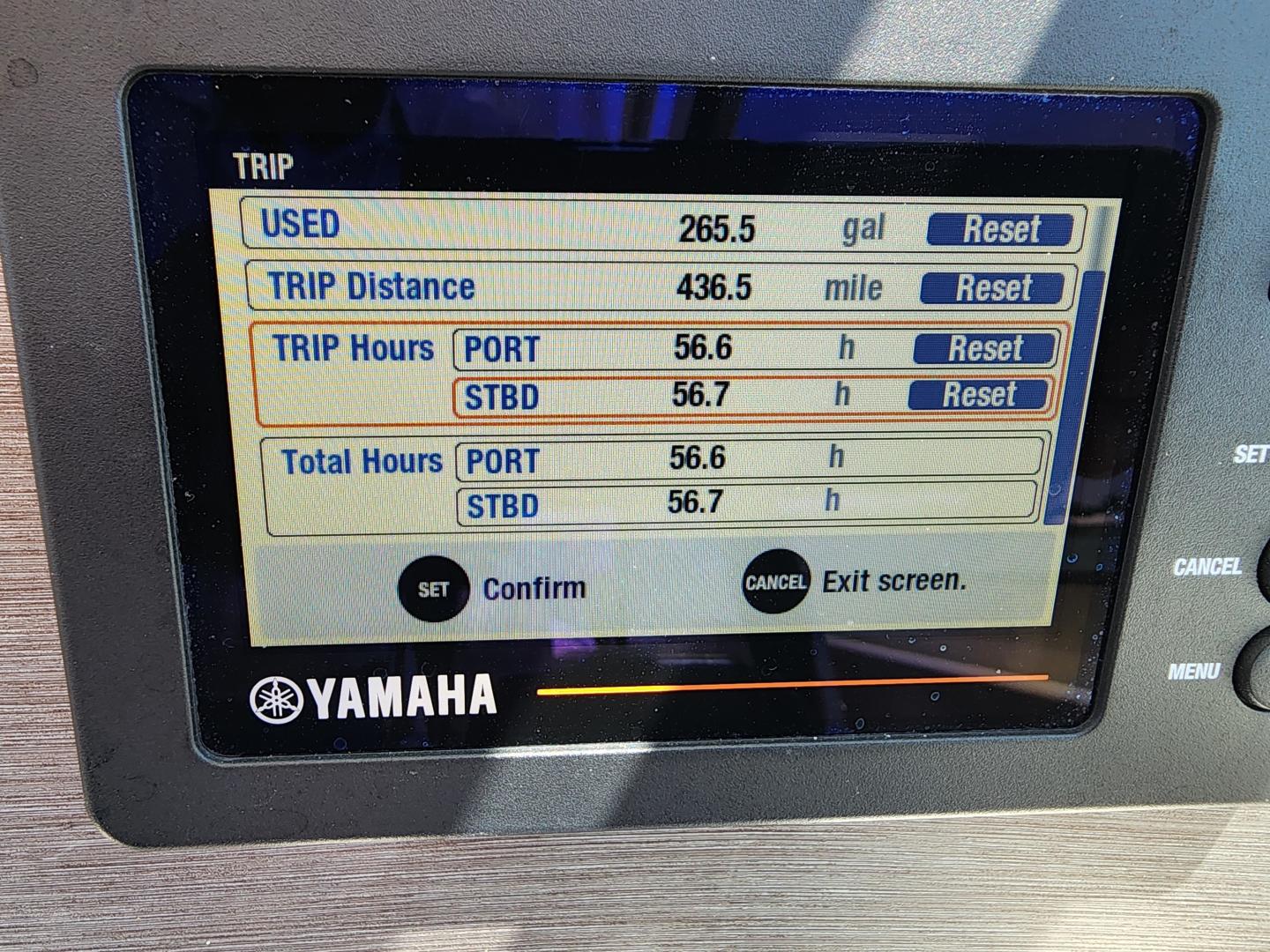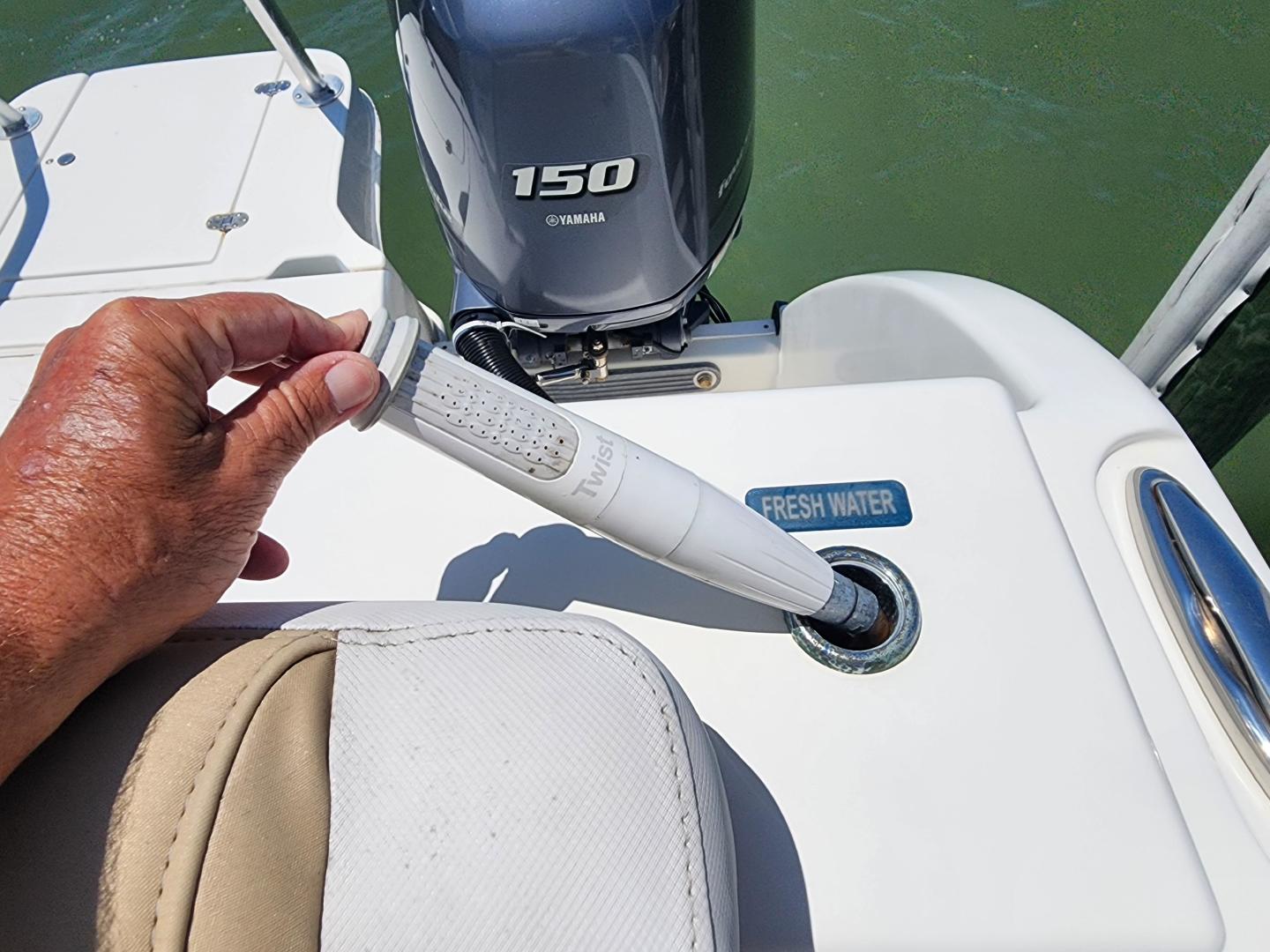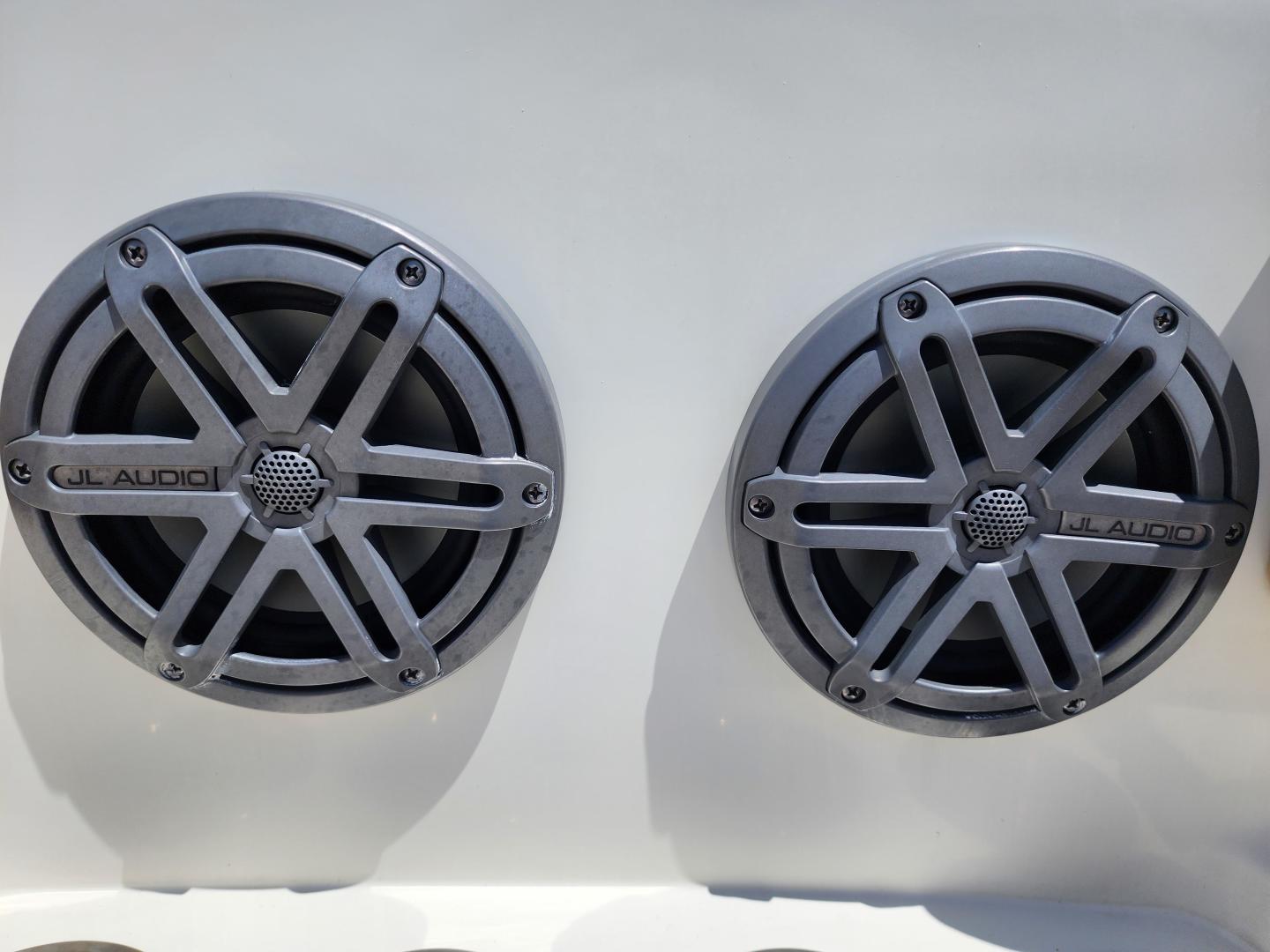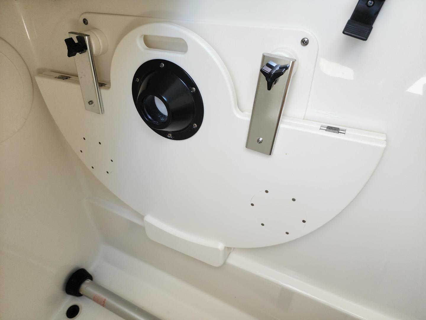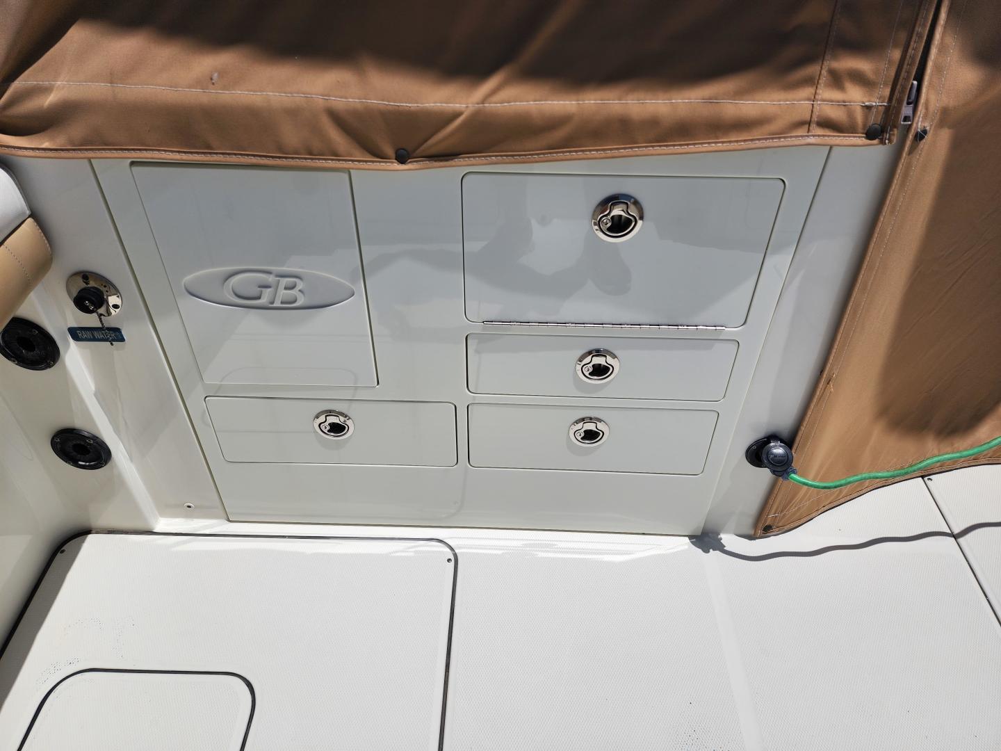 This is a family friendly, very stable vessel set up for offshore fun, beach days or a comfortable evening cruise. There is a very healthy swim ladder aft with a fresh water shower, two nice jump seats in the cockpit that fold away to make the cockpit more spacious. There are two insulated fish boxes that can be used as food and drink coolers. The forward end of the cockpit has a nice console with a live well, fresh water sink, and plenty of storage. The helm deck has an L shaped settee to port with plenty of storage underneath, and an Isotherm refrigerator. There is a hidden garbage can for a convenient place to throw refuse, but remain unseen. Forward and to starboard us the helm console with a Garmin GPS MAP 7610xsv, Yamaha display, Fusion stereo remote with Bluetooth adaptability, and set of console switches for pumps, lights etc.