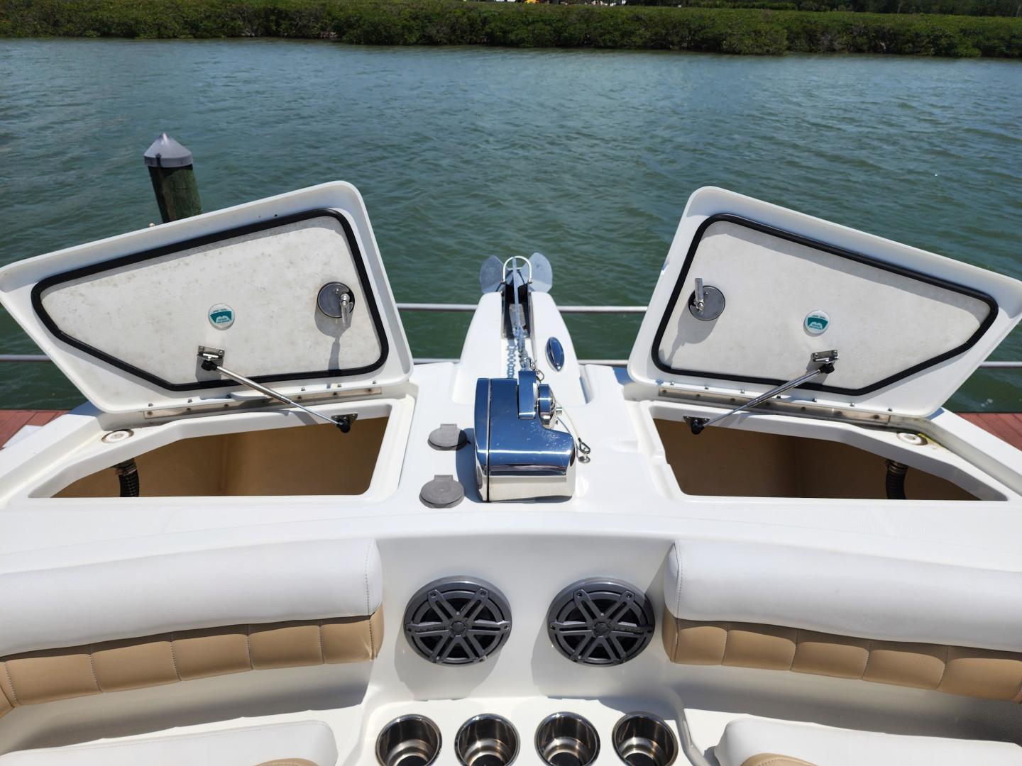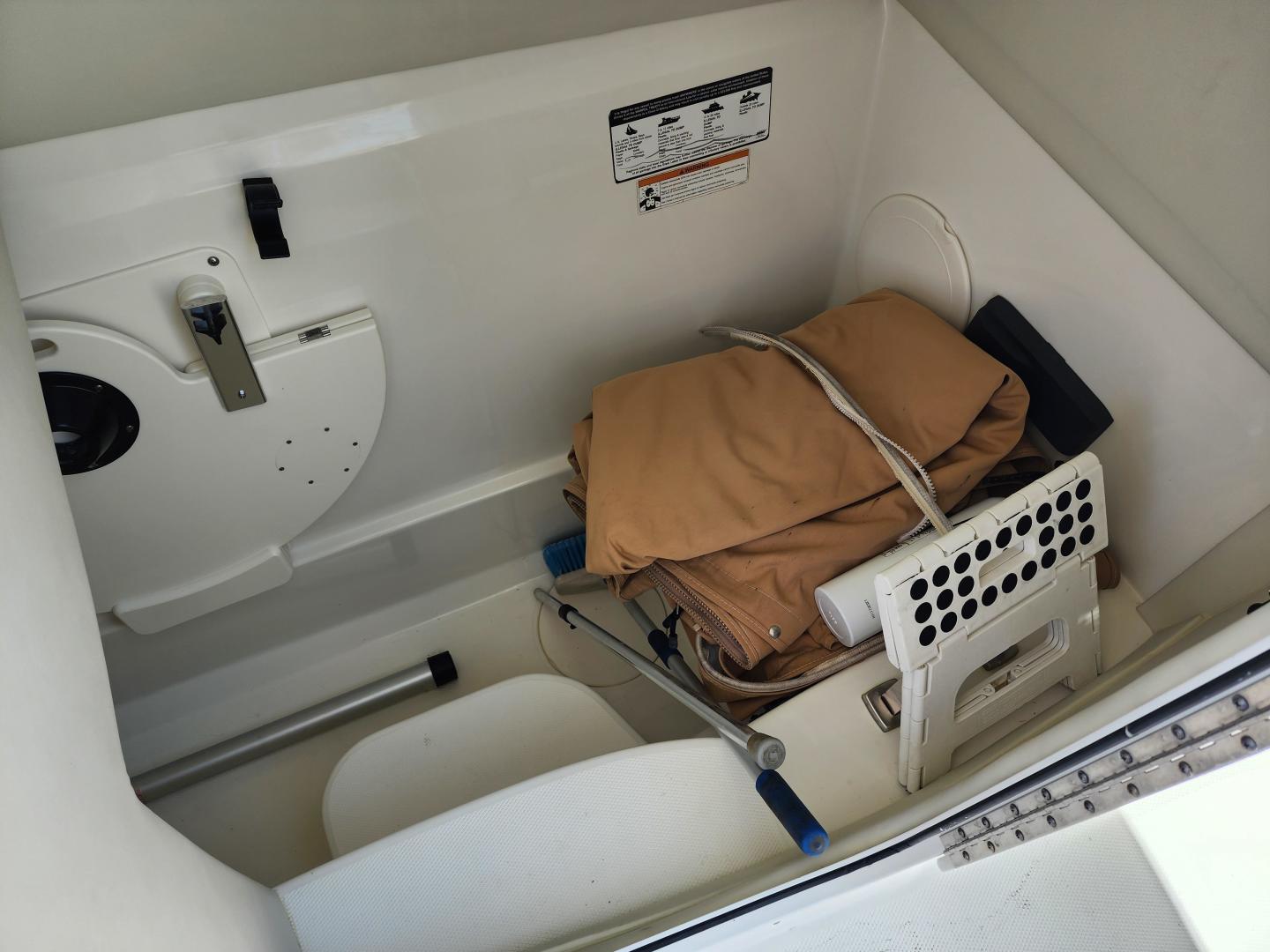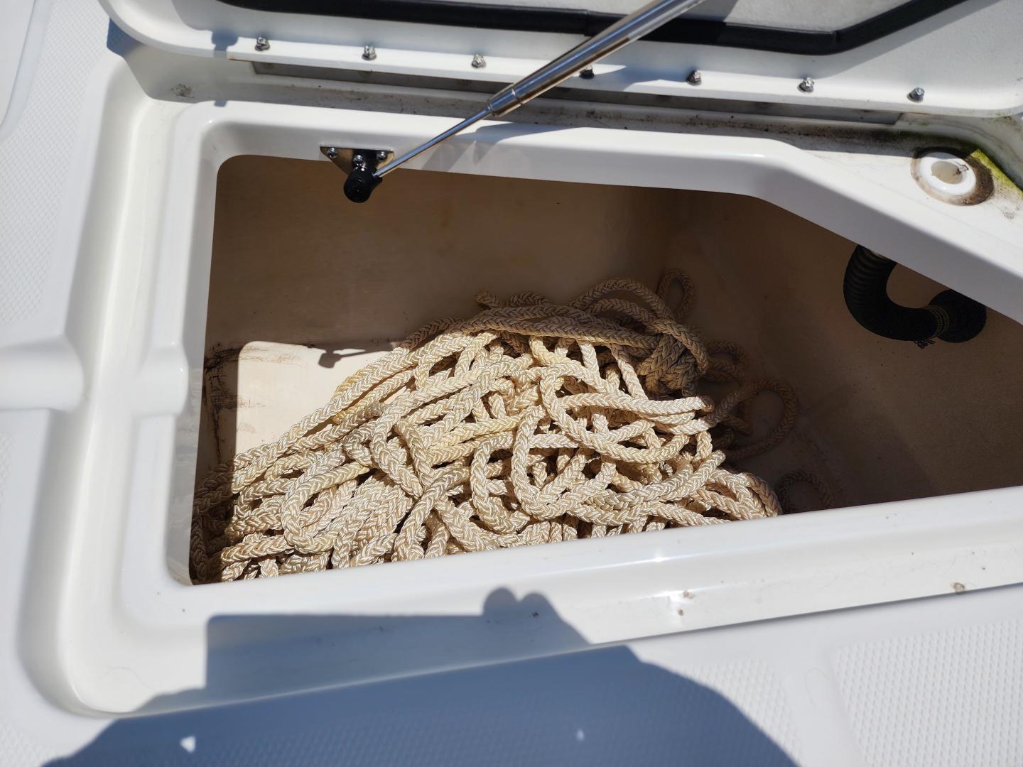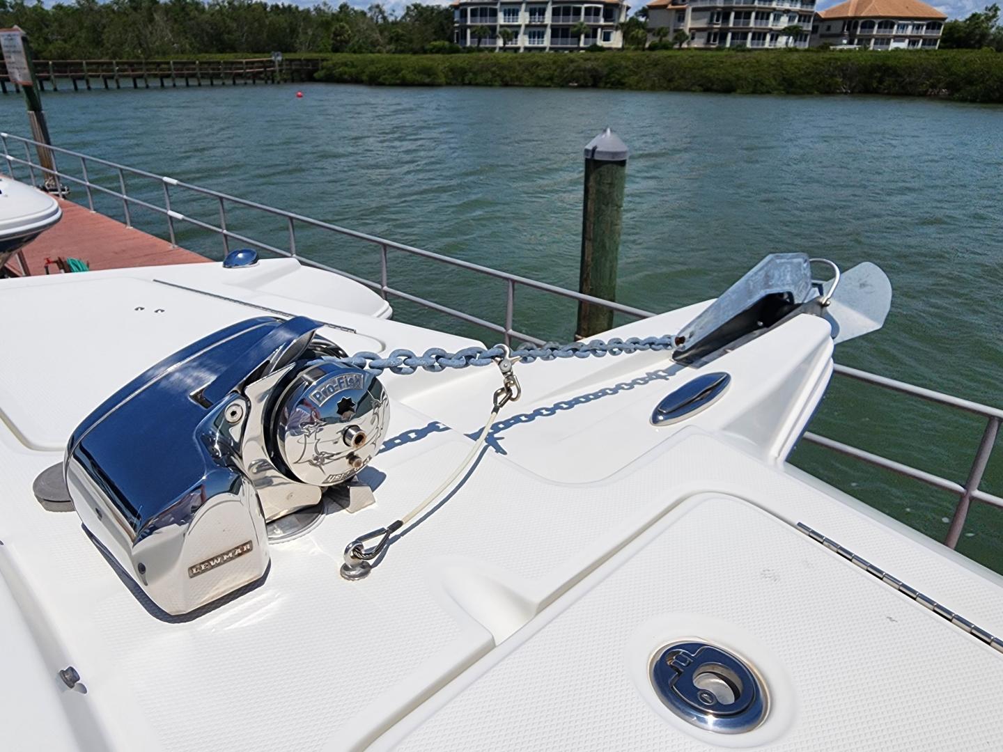 Forward of the helm deck to port is a enclosed head with a fresh water toilet, which also has additional storage, to starboard under the helm, there is a storage locker. The fore deck has wrap around seating, with storage underneath, and an insert area for the optional forward filler cushions, or table. Those items are in the original factory wrappers and have been stored in a climate controlled garage. Just forward of the seating are two large storage lockers an electric windlass, with galvanized Delta fast set anchor, galvanized chain with braided rode.